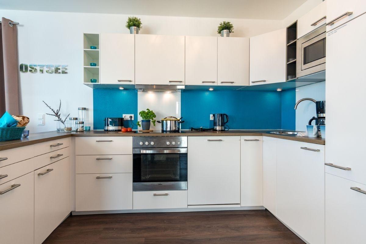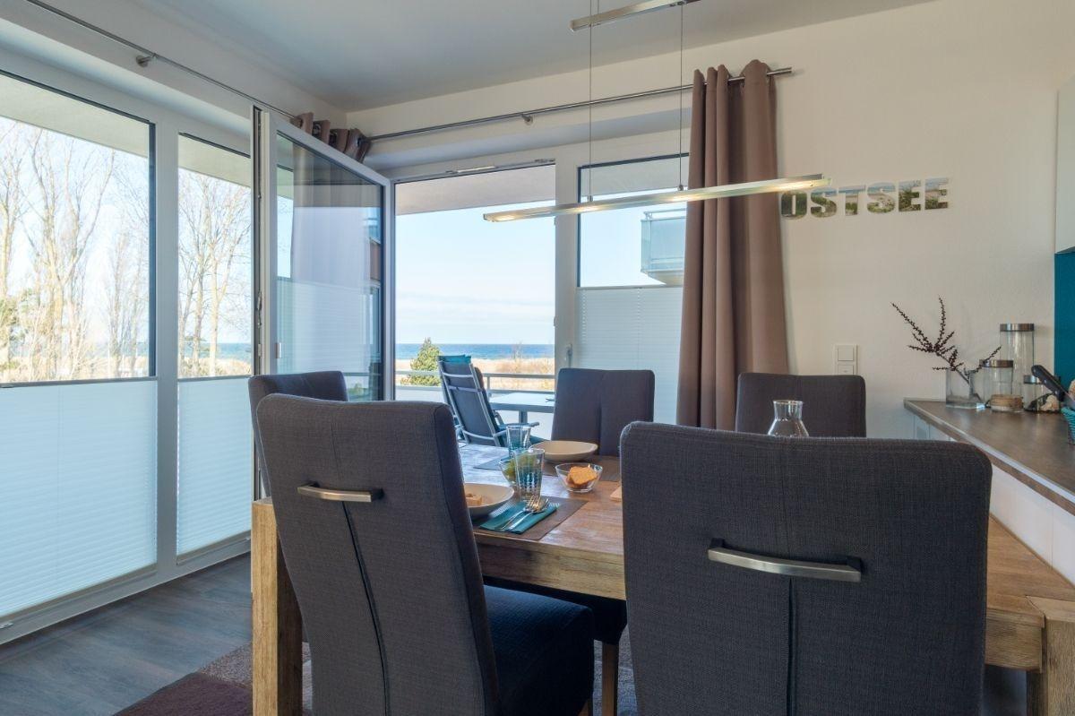 Urlauben Sie auf großzügigen 76 m² (1. Etage) mit Nordwest-Balkon. Das lichtdurchflutete Wohnzimmer (Blick zum Binnensee und zur Ostsee) ist mit einer gemütlichen Sofaecke und Flatscreen-TV ausgestattet. Im Essbereich finden bequem vier Personen Platz zum Schlemmen. Die angrenzende Küchenzeile ist, für den Urlaubsbedarf, voll ausgestattet. Ein Backofen und ein Geschirrspüler gehören ebenso dazu, wie die Kaffeemaschine, der Wasserkocher ein Toaster, eine Mikrowelle, ein Elektrogrill und eine Waschmaschine. Geschirr und Besteck sind ausreichend vorhanden.