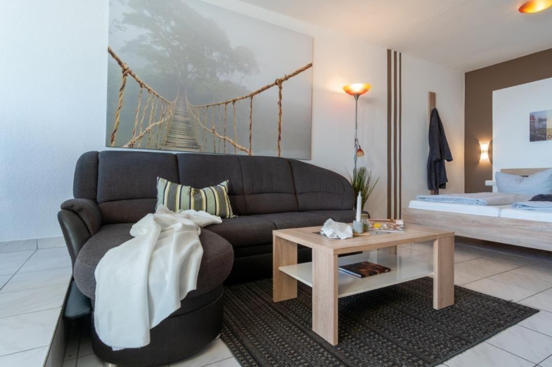 Der großzügige Wohn-Schlafbereich verfügt über ein großes Doppelbett, ein gemütliches Ecksofa, einen Flatscreen-TV und vieles mehr. Vom Essbereich aus kann man schon beim Frühstück den herrlichen Ausblick zur Ostsee - bis hin zur Fehmarnsundbrücke - genießen!