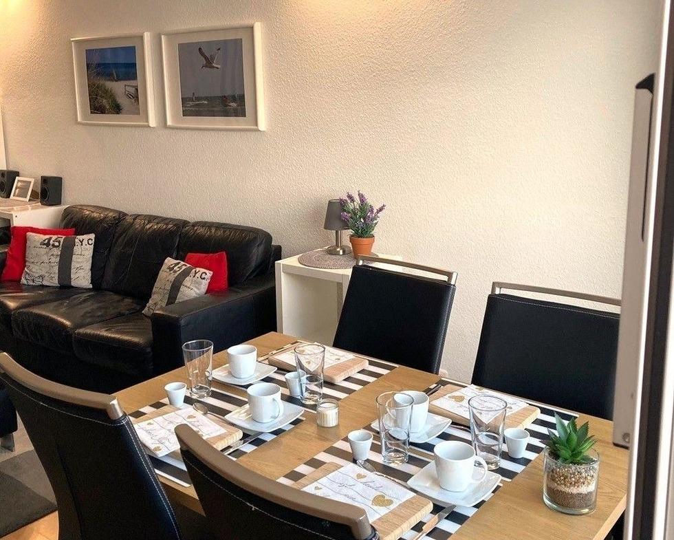 Die zuletzt 2021 modernisierte 45m²-Wohnung verfügt über einen großzügigen Wohn-Schlafbereich mit einem komfortablen Doppelbett (ca. 180*200cm) im hinteren Bereich, einer gemütlichen Sofaecke mit Flatscreen-TV und der Essecke für vier Personen. Der offene Küchenbereich ist, für den Urlaubsbedarf, voll ausgestattet. Außerdem stehen Ihnen noch eine Waschmaschine, ein Backofen und ein Geschirrspüler zur Verfügung. Das angrenzende Kinderzimmer verfügt über ein Etagenbett und einen eigenen TV.