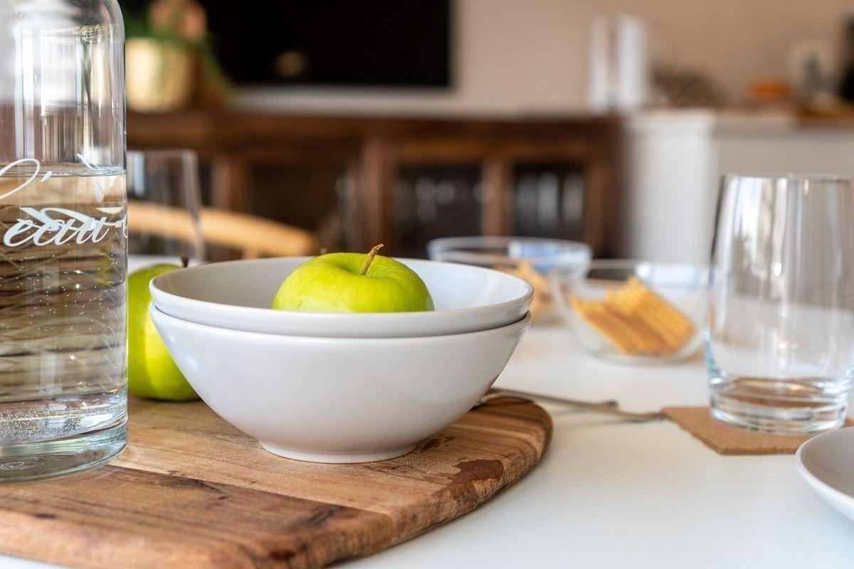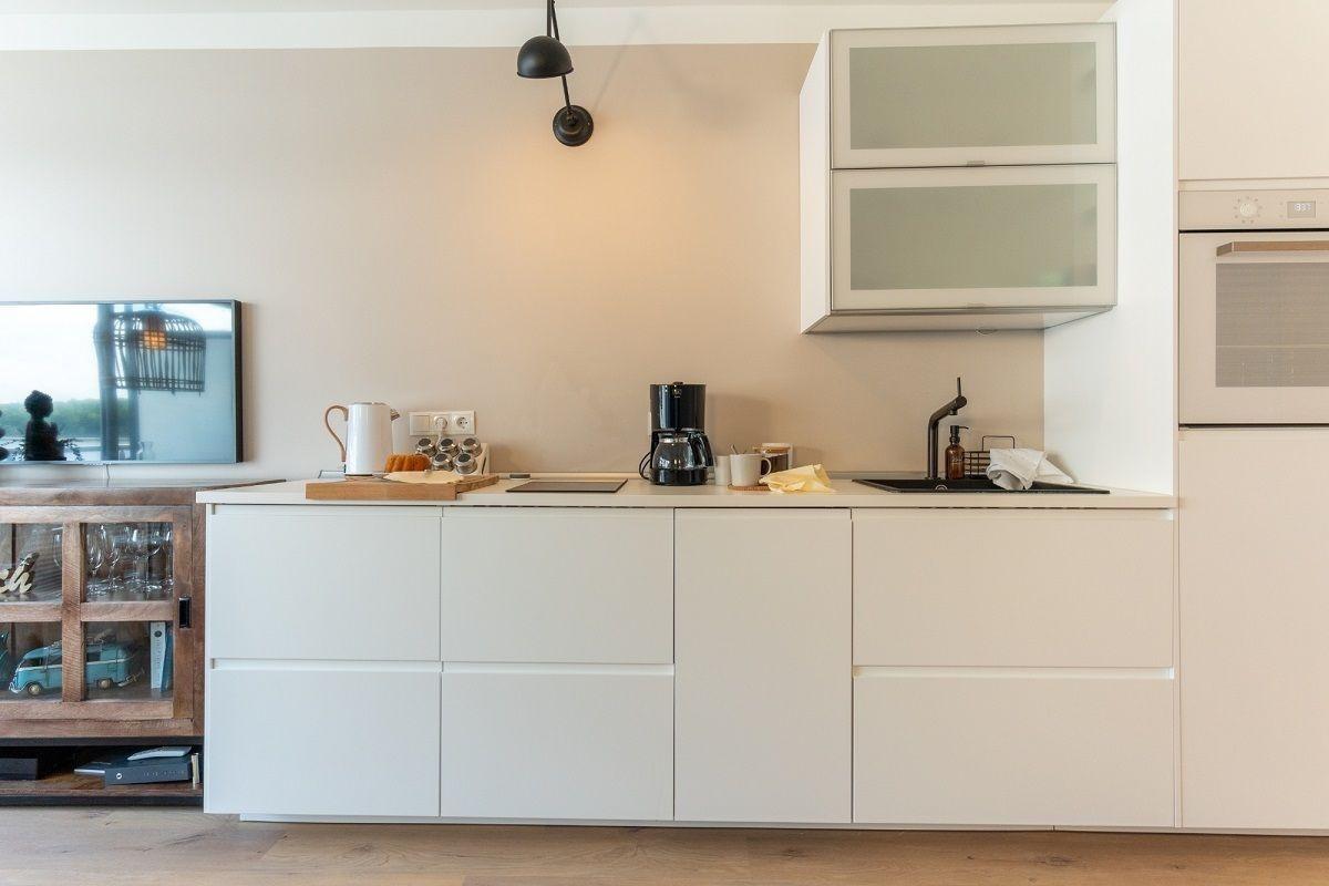 Der offene Küchenbereich ist, für den Urlaubsbedarf, voll ausgestattet. Eine Kaffeemaschine gehört ebenso dazu, wie der Wasserkocher und ein Toaster. Geschirr und Besteck sind ausreichend vorhanden. Außerdem steht Ihnen noch ein Backofen und ein Geschirrspüler zur Verfügung.