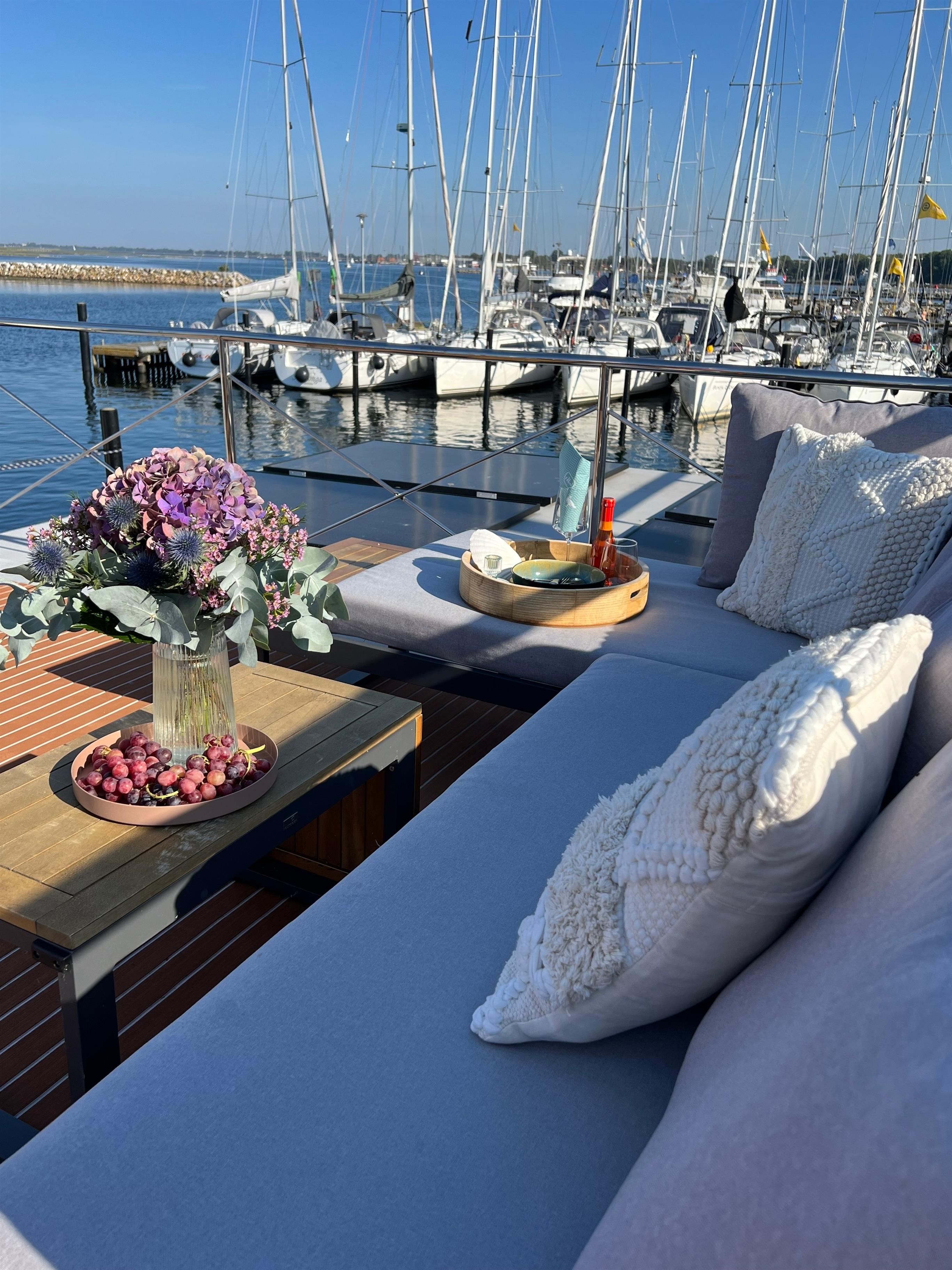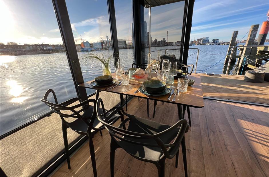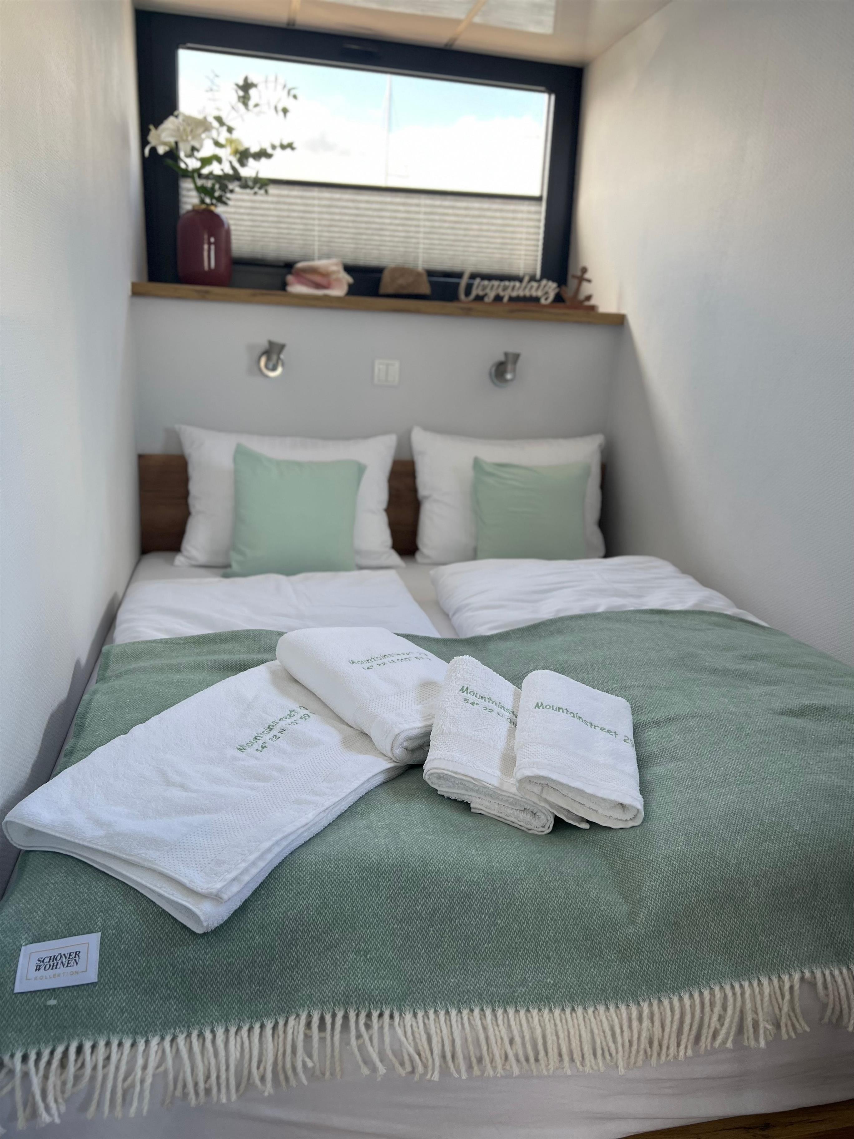 Im Inneren des nagelneuen Haubootes "Mountainstreet29" fehlt es Euch an Nichts! Es ist ausgestattet wie ein hochwertiges Ferienhaus. Mit hauseigener Bettwäsche und flauschigen Handtüchern. Unsere Betten sind aus hochwertigen Materialien zum Wohlfühlen auch für Allergiker geeignet. Die ersten Cups für die an Bord befindliche Nespresso-Kaffeemaschine und das Starter-Kit fürs Verbrauchsmaterial sind für Euch bei uns inklusive! Für ein sofortiges Wohlfühlen nach eurer Anreise findet ihr im Kühlschrank einen ersten Willkommens-Sundowner. Das große Roof-Deck des schwimmenden Ferienhauses lädt zum Sonnenbaden ein. Genießt den Ausblick auf das Hafenflair und das Meer, über die Halbinsel Steinwarder hinweg.