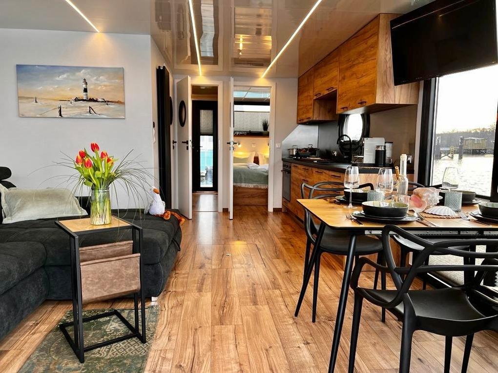 Erleben Sie ein exklusives Hausboot in Heiligenhafen mit eigenem Motorboot und traumhaftem Ostseeblick.