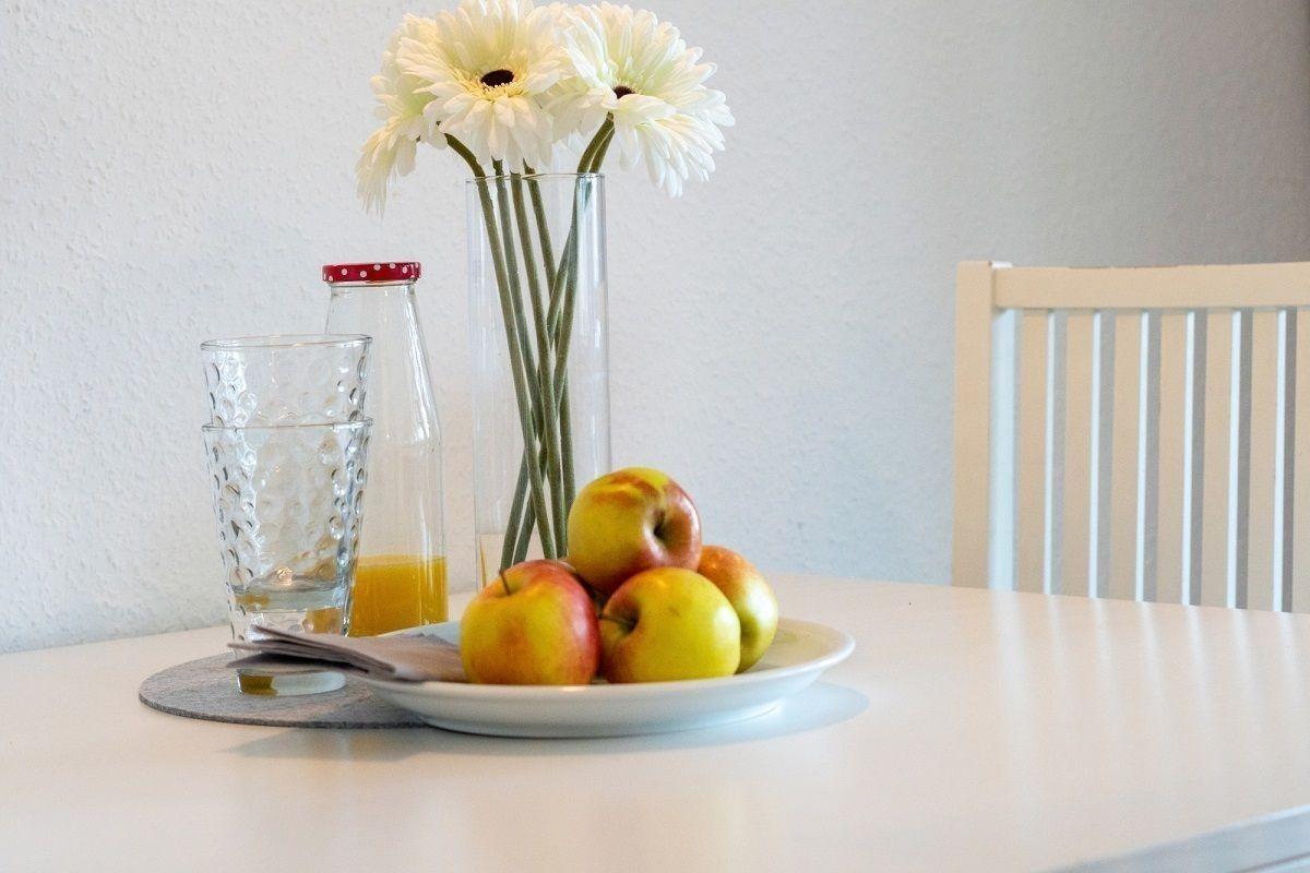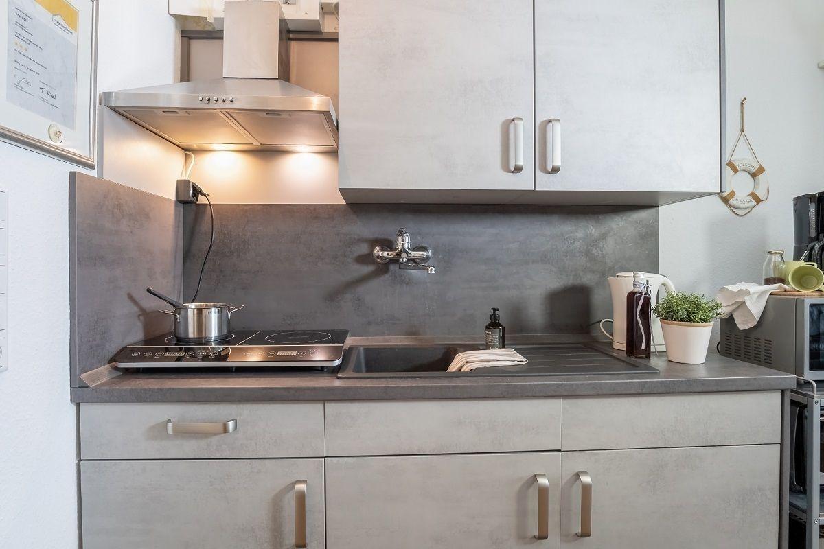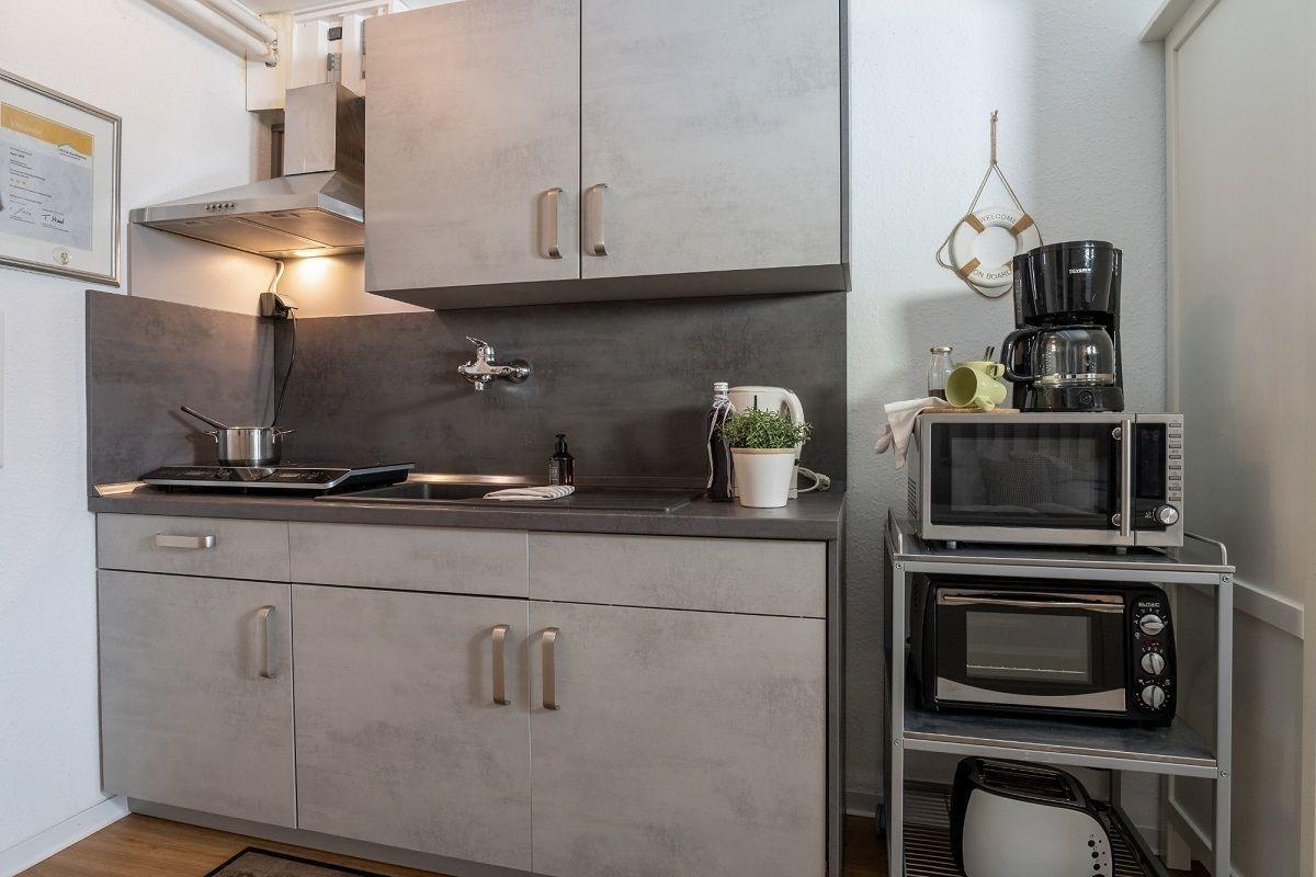 Die gemütliche, helle 31m²-Wohnung befindet sich im Erdgeschoss. Der Wohn-Schlafbereich ist mit einer gemütlichen Sofaecke und einem großen Doppelbett (ca. 2x90x200cm) ausgestattet. Die kleine Kochnische verfügt neben den gängigen Kochutensilien zusätzlich über einen Minigrill, eine Mikrowelle und ein Zwei-Platten-Kochfeld.