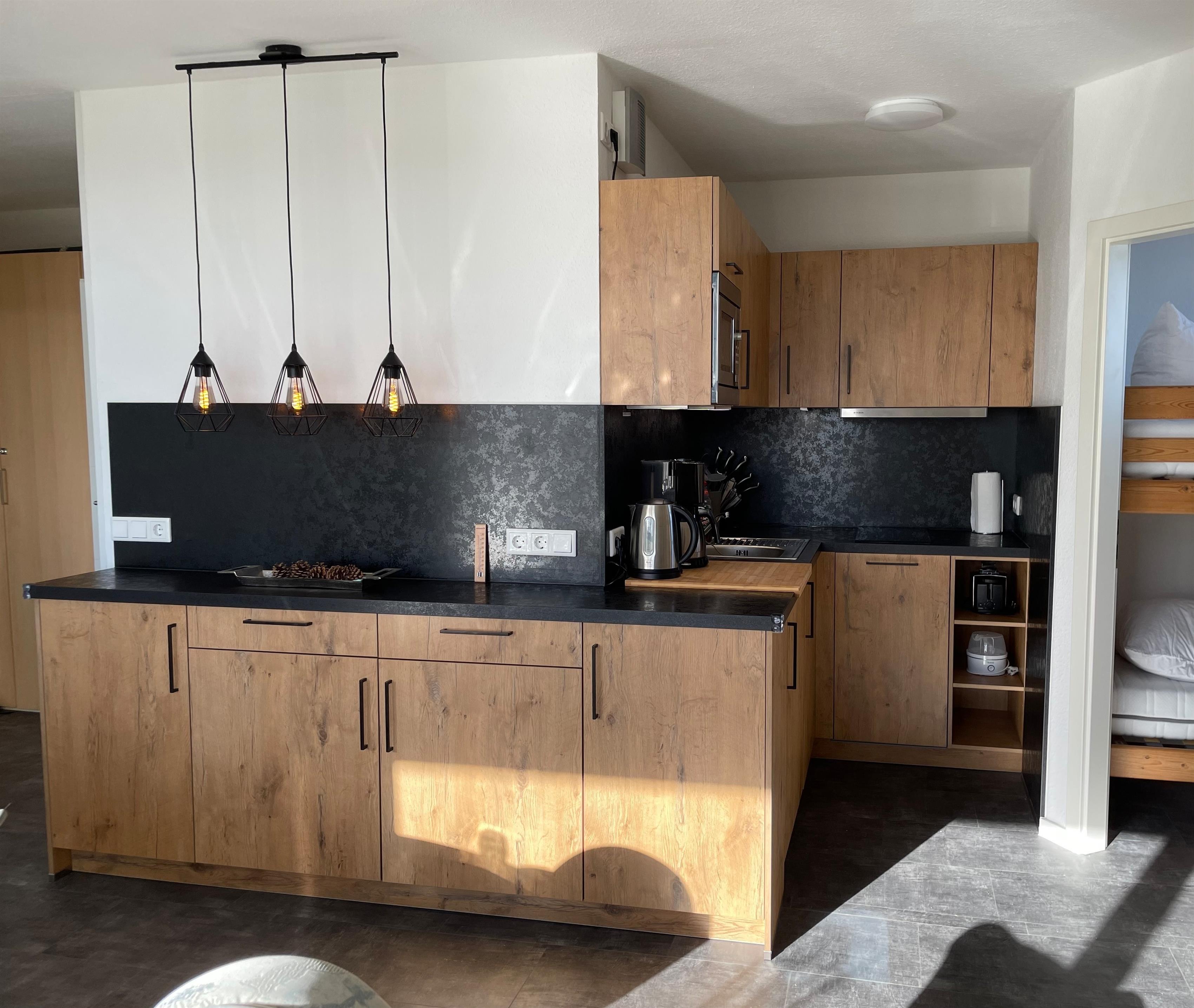 Das Wohnzimmer mit der integrierten Küche und der große Balkon lädt zu gemütlichen Stunden ein!