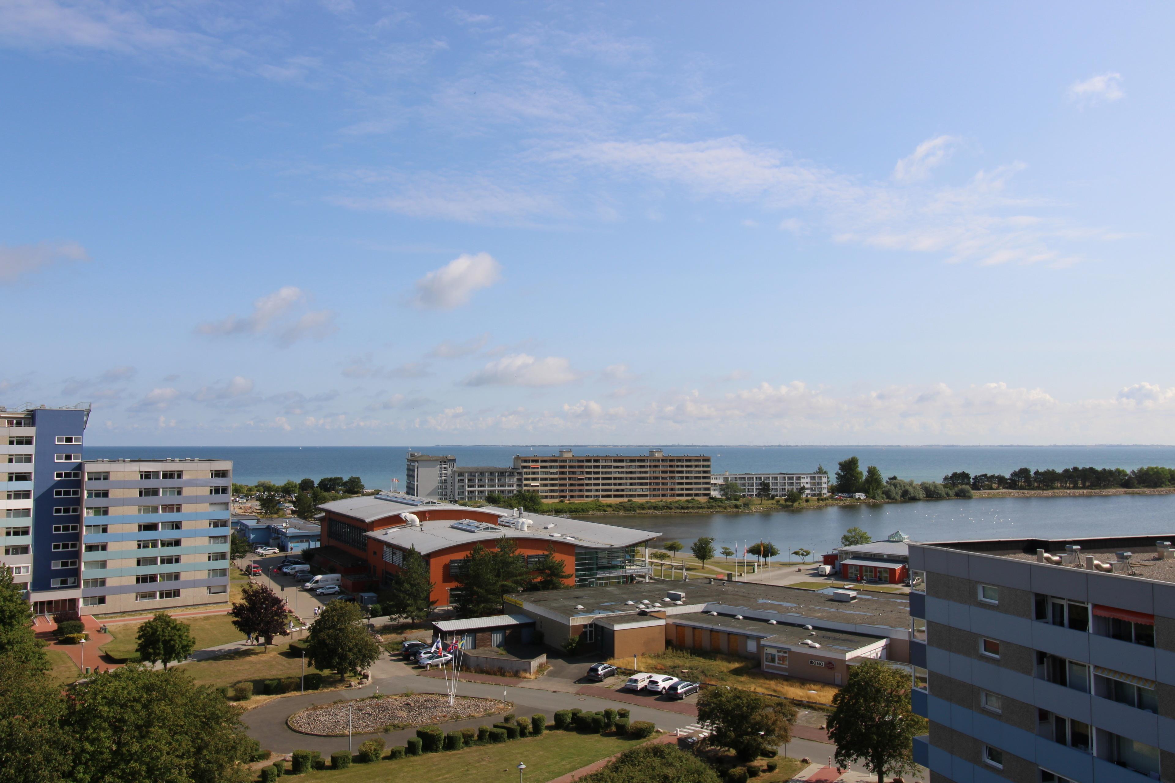 Kleine Ferienwohnung mit Meer- und Seeblick im 9. Stock eines Ferienparks in Heiligenhafen.