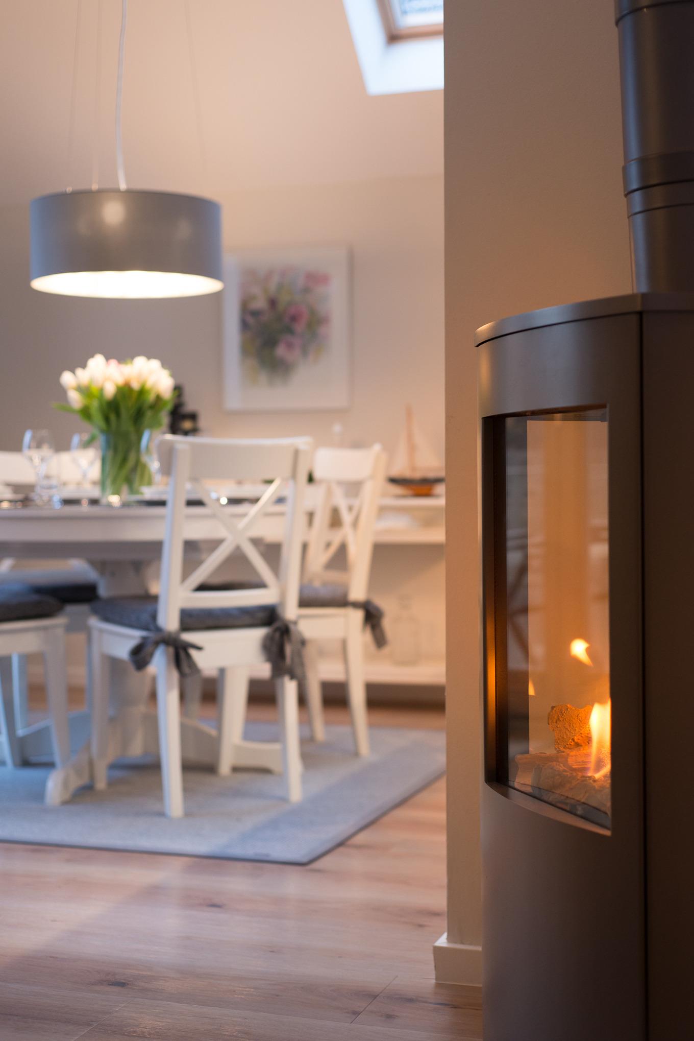 ? An kühlen Tagen sorgt neben der Zentralheizung ein per Fernbedienung leicht zu bedienender Gaskaminofen (offene Flamme hinter Scheibe) schnell für wohlige Wärme.