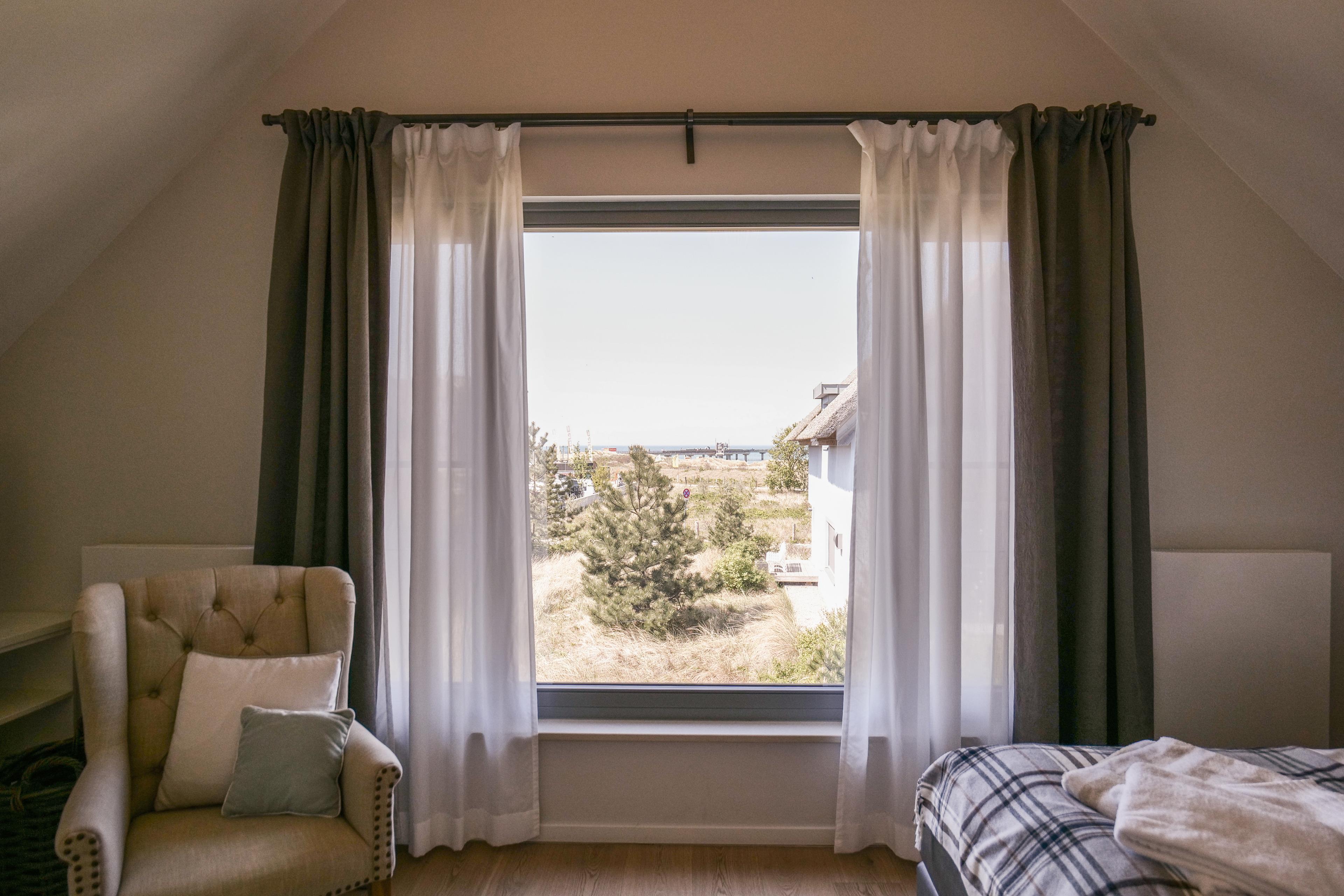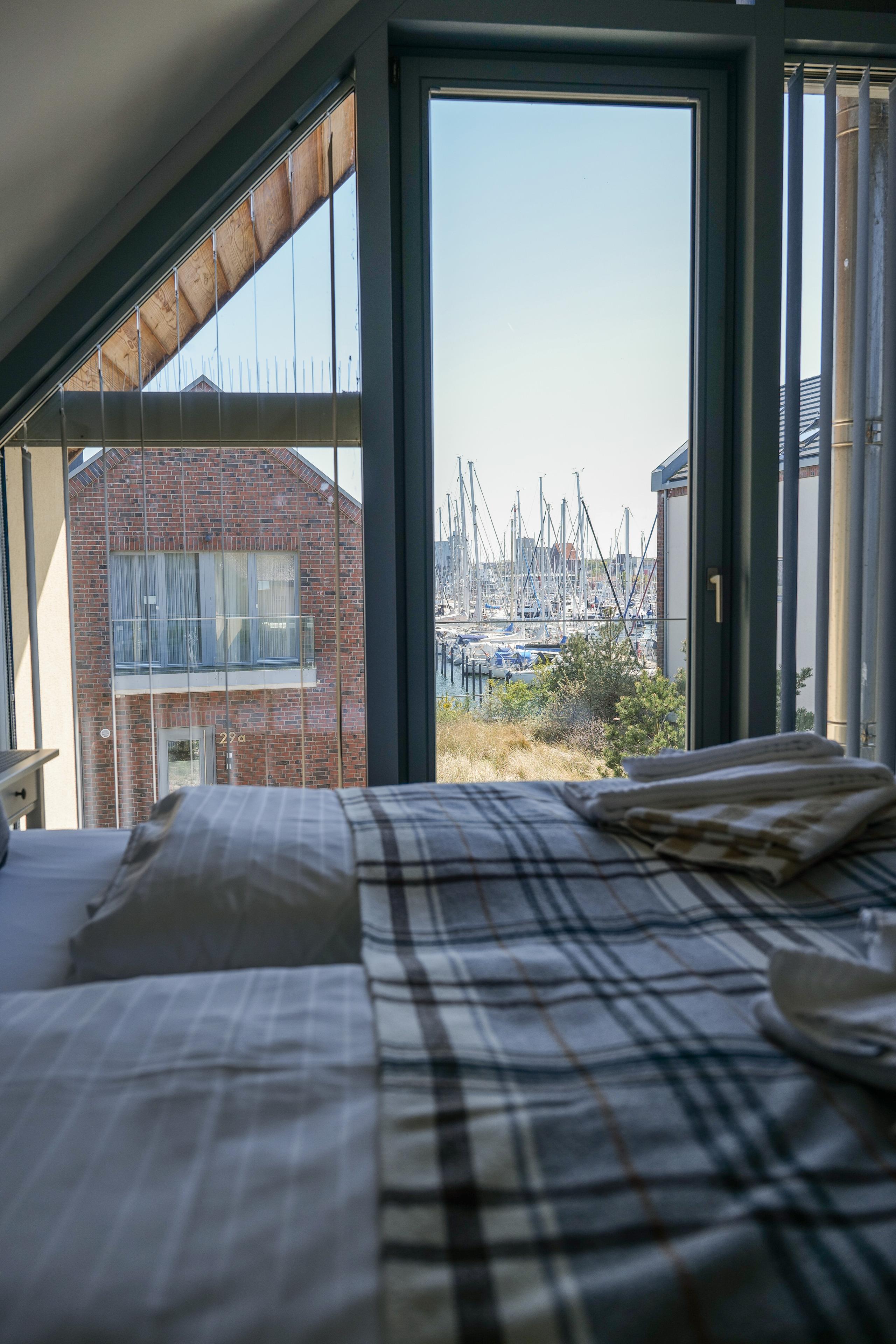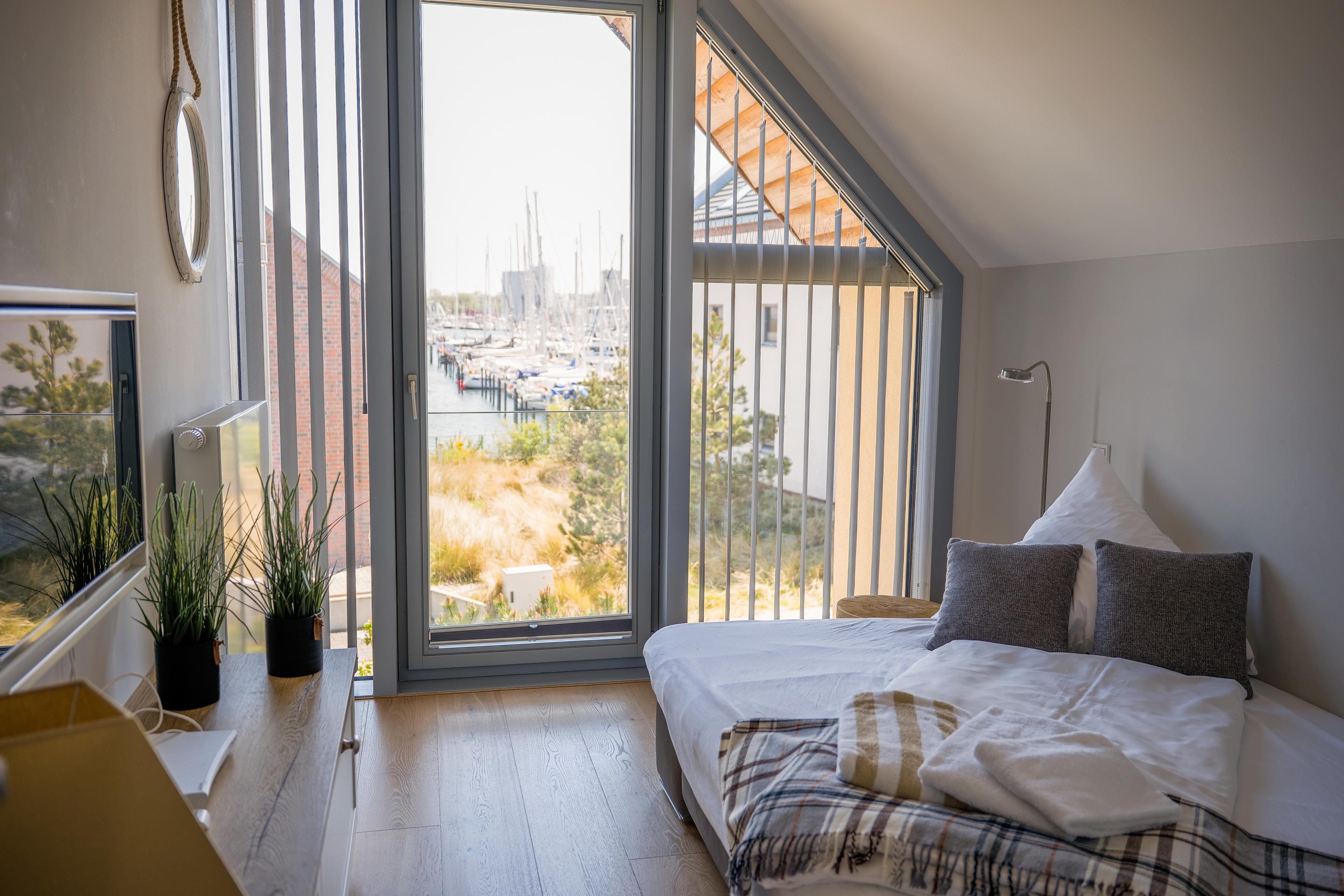 In das obere Geschoss gelangt man über eine Treppe auf die Galerie, die mit dem dort platzierten großen Lesesessel zum Relaxen genutzt werden kann. Hier finden Sie einen großen, giebelhohen Master-Bedroom mit luxuriösem Boxspringbett und großflächigem, bodentiefem Fenster. Genießen Sie von hier einen direkten Blick auf die Seebrücke von Heiligenhafen und die offene, nur 200m entfernte Ostsee. Ebenso finden Sie im OG das zweite Schlafzimmer, welches mit gleichem Boxspringbett ausgestattet ist, sowie ein Fernseh-/ Schlafzimmer mit ausziehbarer Bettcouch. Von hier haben Sie einen fantastischen Blick auf den großartigen Jachthafen.