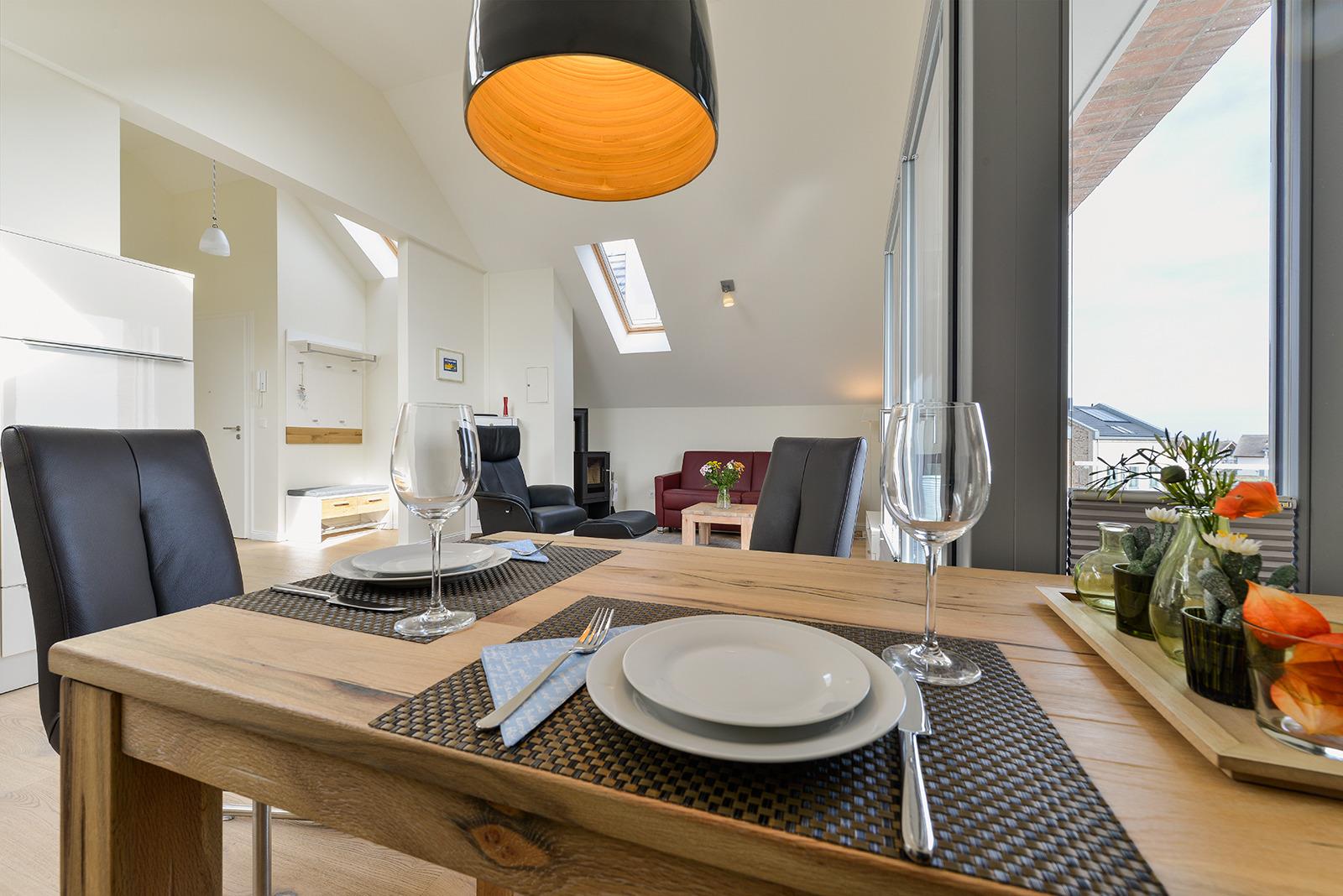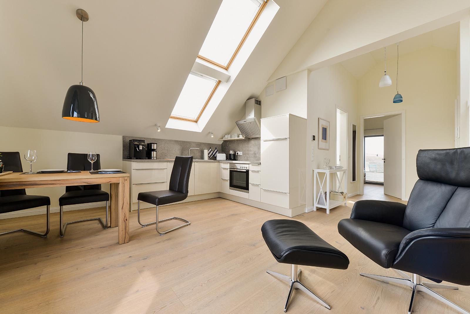 Die Wohnung, mit Echtholzdielen ausgelegt, ist modern eingerichtet und verfügt zugleich über eine individuelle Note. Im Wohnraum befindet sich ein Kamin, der in der kalten Jahreszeit eine wohlige Atmosphäre und Wärme verbreitet. Die Küchenzeile in Magnolienoptik umfasst einen Herd mit Glaskeramik Kochfeld, Dunstabzugshaube, Kühlschrank mit Gefrierfach, Geschirrspüler, Einbauspüle und diversen Einbauschränken. Der Schlafraum ist mit einem großen Einbauschrank und Boxspringbetten ausgestattet. Ein Flachbildschirm (Satellitenfernsehen), W-Lan, Stereo-Anlage, CD- und DVD-Player, Waschmaschine und Trockner sowie ein Kaffeeautomat (neben Kaffeemaschine) ergänzen die moderne Einrichtung.