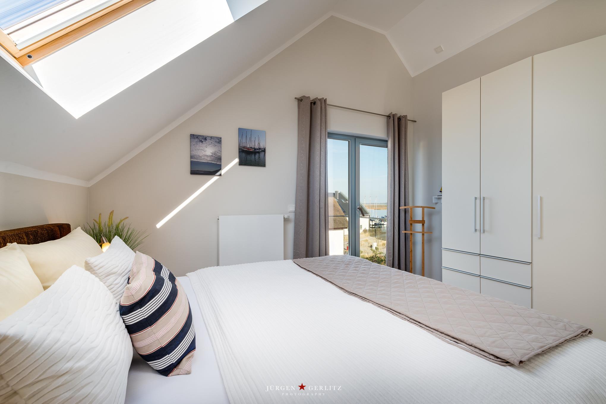 Das Schlafzimmer ist mit einem modernen Boxspringbett ausgestattet. Es verfügt über einen Balkon. Von hier blicken Sie in Richtung Graswarder und Yachthafen. Nebenan finden Sie ein zweites Schlafzimmer mit einem Etagenbett, besonders geeignet für Kinder.