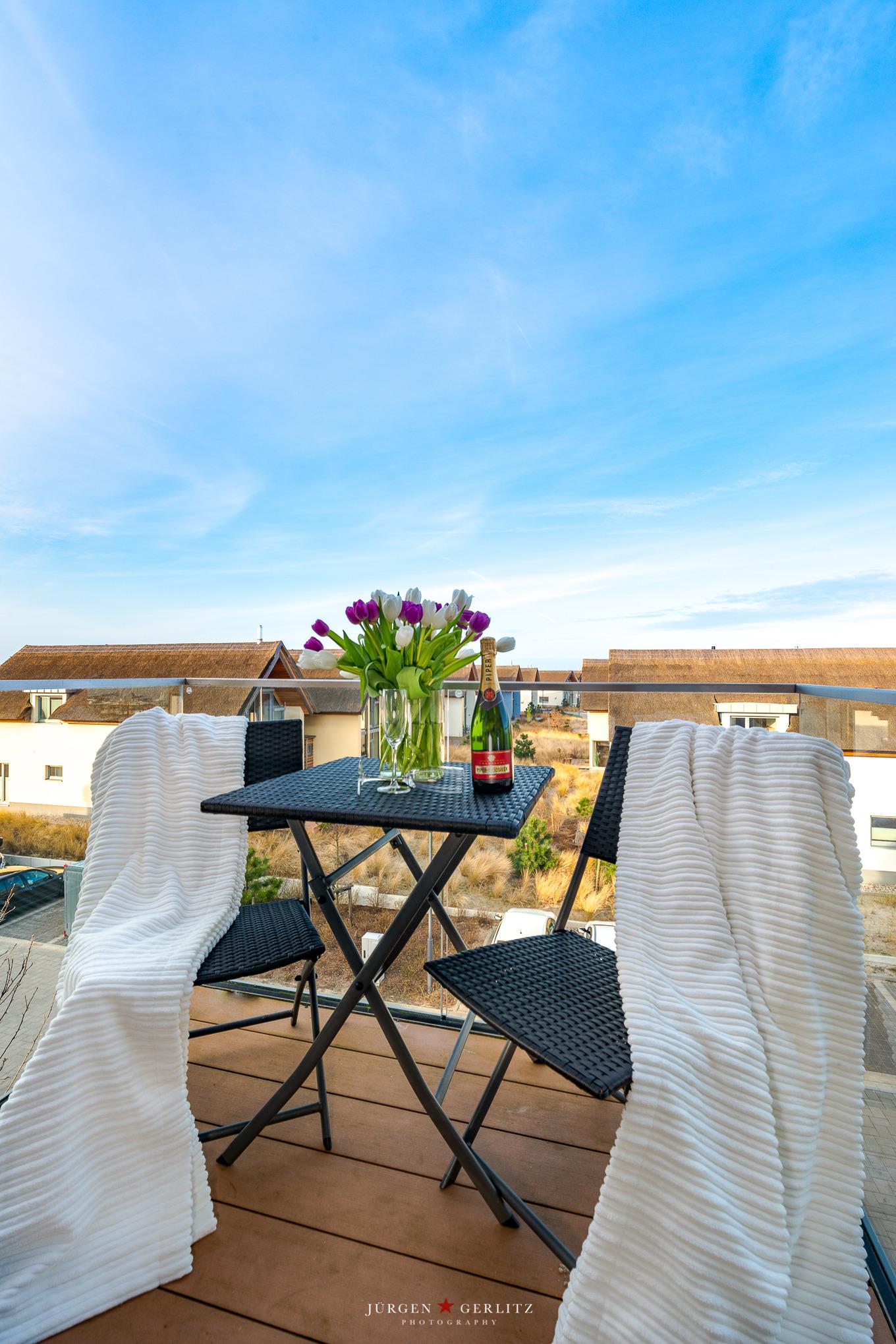 Im Wohnbereich gibt es außerdem ein modernes Sofa, welches sich in ein Schlafsofa für weitere 2 Personen verwandeln läßt, einen Kaminofen und einen Fernseher mit DVD-Player. Von einem 2. Balkon blicken Sie hier auf die Strandpromenade in Richtung Seebrücke und können bei schönem Wetter wunderschöne Sonnenuntergänge genießen.