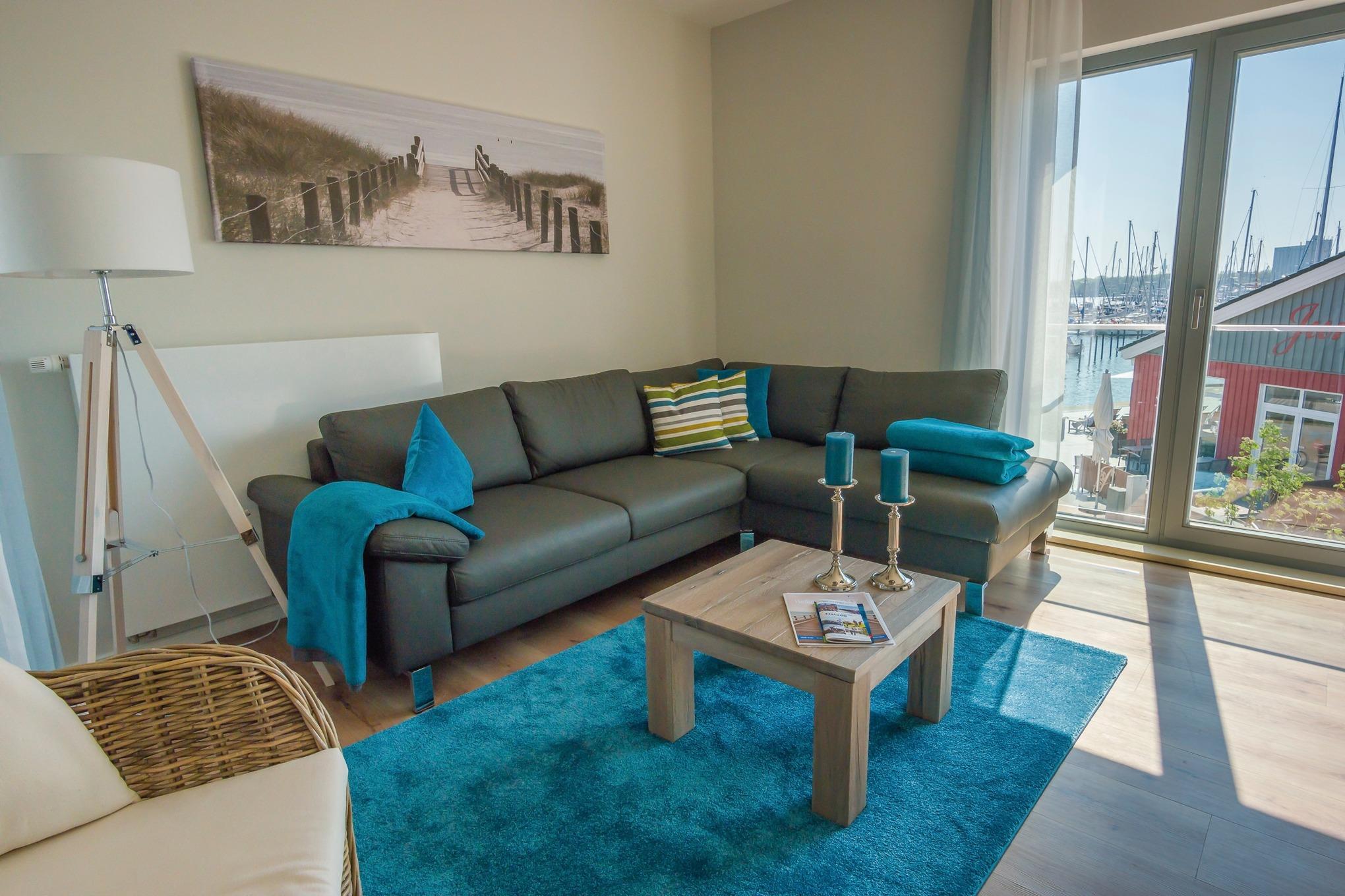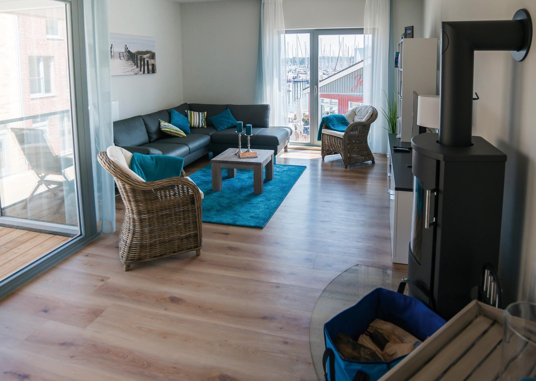 Moderne Ferienwohnung mit Hafenblick, Sauna und Kamin in Heiligenhafen, ideal für erholsame Tage am Meer.