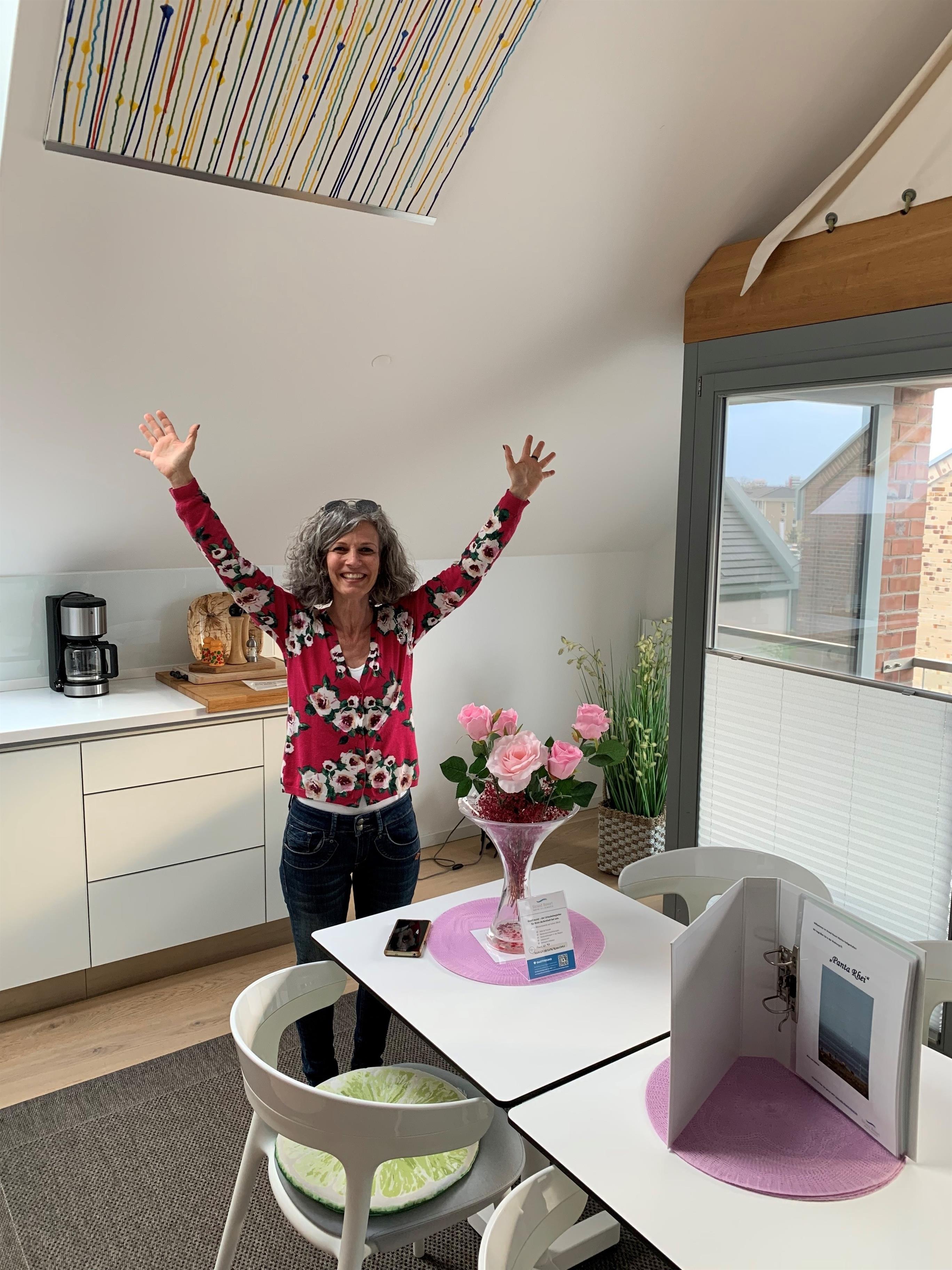 Design-Ferienwohnung in Heiligenhafen mit Meerblick und Yachthafen, Balkon, Loggia, Kaminofen, moderner Ausstattung und kostenfreiem Parkplatz.