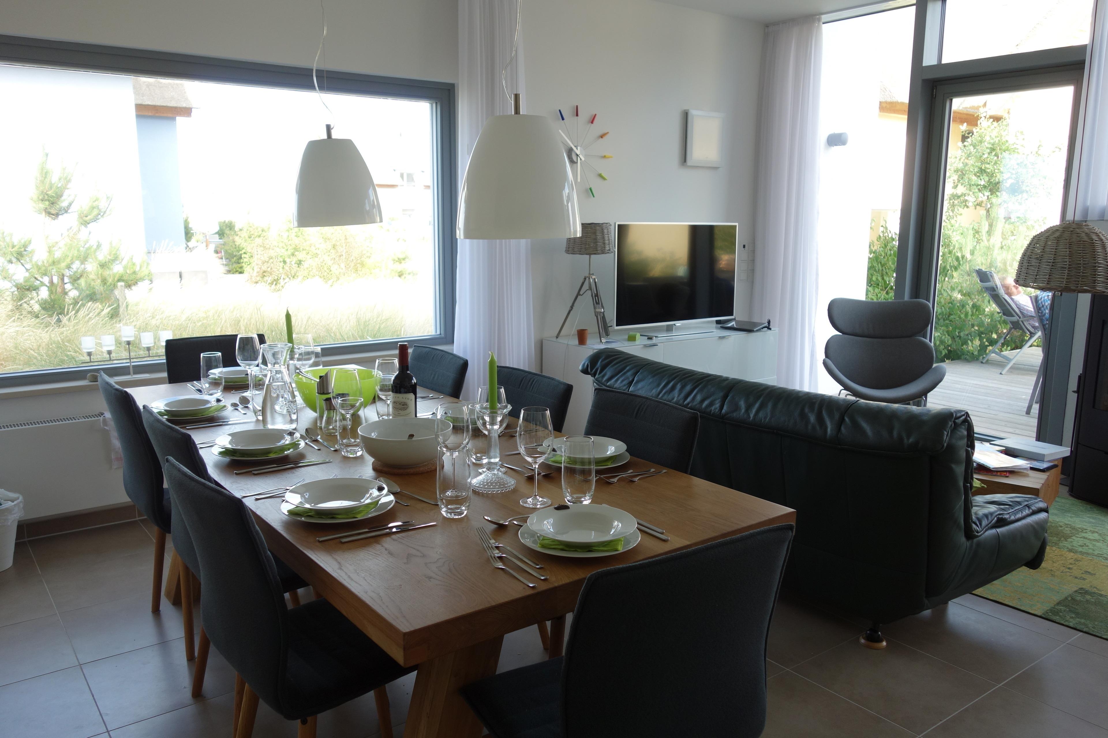 Beim Biss ins knackige Frühstücksbrötchen blickt man aufs Meer, wenn man von seiner Ferienlektüre aufschaut, glitzert das Wasser und wenn man abends auf dem Balkon steht, schweift der Blick weit über die Wellen. Das Haus ist modern eingerichtete, wobei die massiven Eichenplatten der Tische im Wohn-Esszimmer einen Hauch wohnlicher Rustikalität verströmen. Wenn man dann abends in die Flammen des Kaminofens blickt, verliert das Wetter an Bedeutung und wem es immer noch nicht warm genug ist, der kann sich in der Sauna aufheizen.