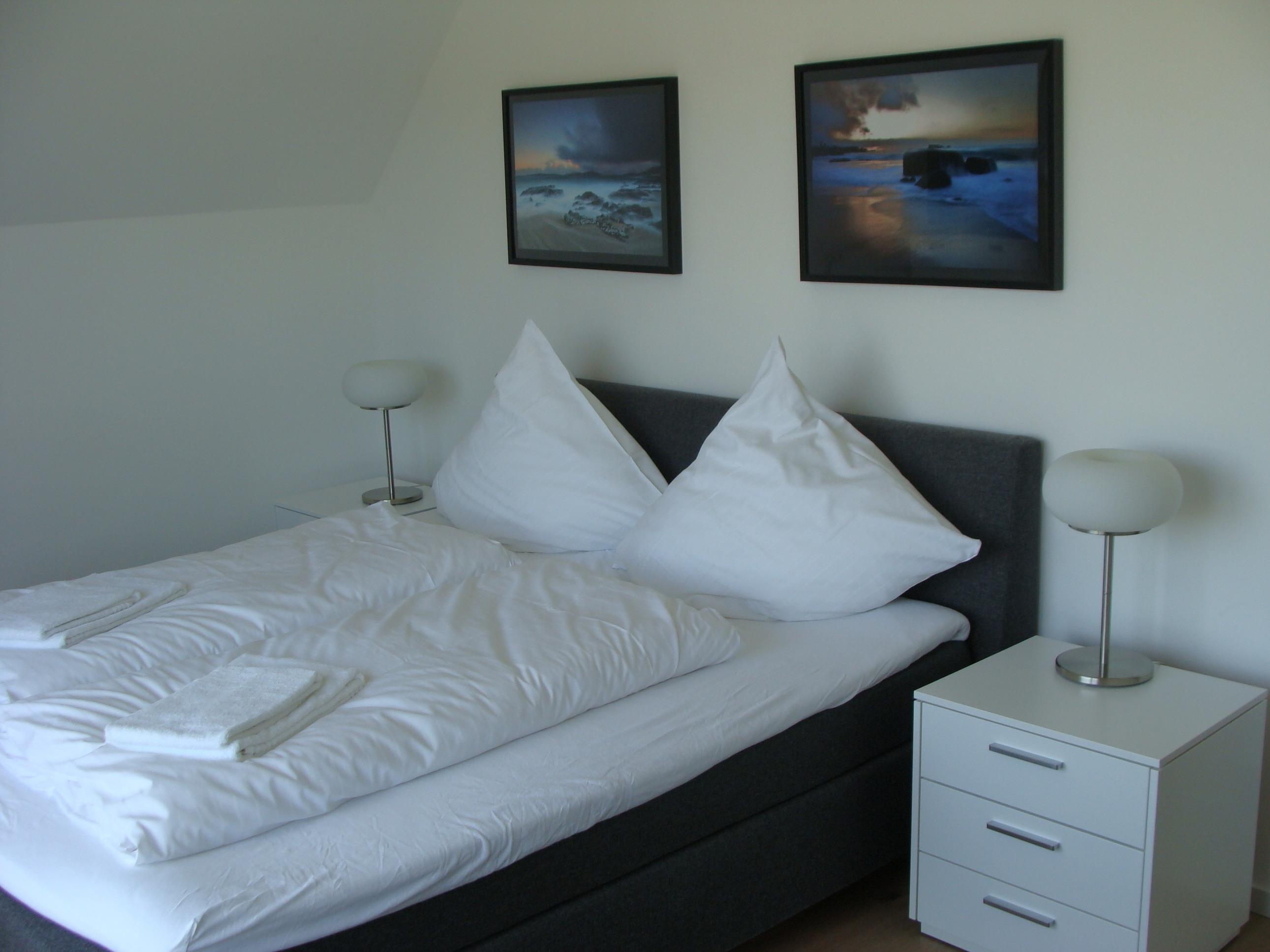 Das Haus enthält vier Schlafzimmer, wobei das Erdgeschoßschlafzimmer auch als Ruheraum oder zweites Wohnzimmer nutzbar ist, da das dortige Bett in ein bequemes Sofa verwandelbar ist. Alle Dachgeschoßschlafzimmer sind mit Boxspringbetten ausgestattet. Im oberen Bad ist eine Waschmaschine mit integriertem Trockner eingebaut, im unteren Schlafzimmer sind Toilette und Dusche getrennt. Ein Fön ist vorhanden.