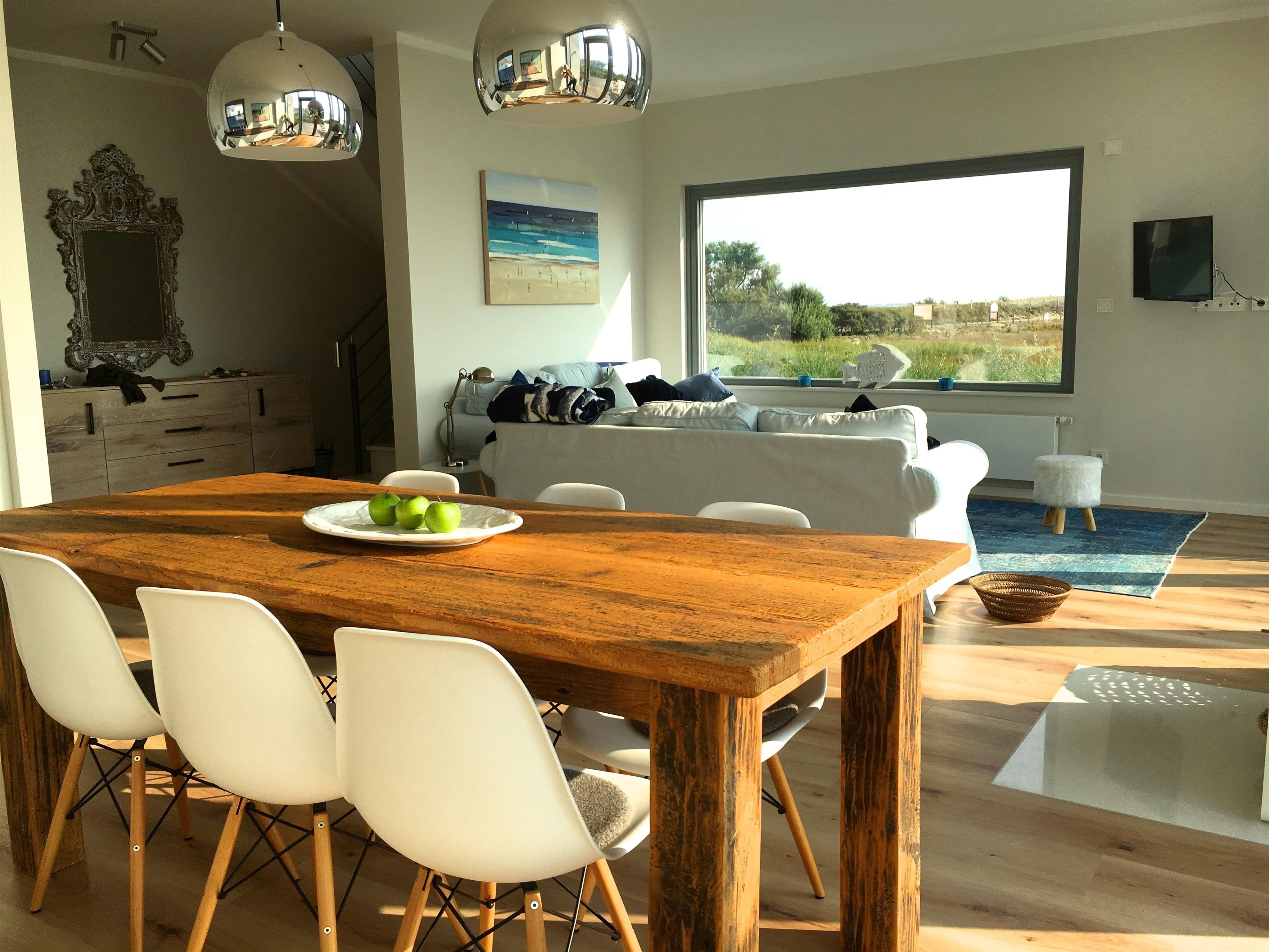 Eingerichtet im maritimen Stil befindet sich im geräumigen Wohnzimmer eine offene Küche in Schiffsform.