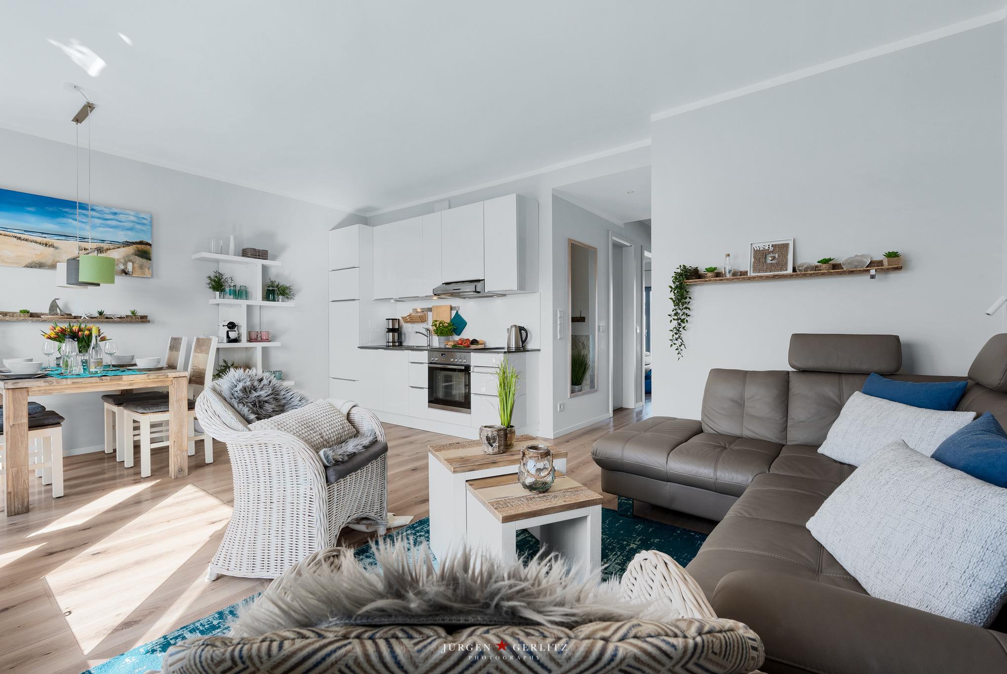 Die Ferienwohnung verfügt über einen großzügigen Wohnraum, eingerichtet im luxuriösen Stil, sowie eine voll ausgestatteten Küchenzeile mit Induktionskochfeld, Backofen, Dunstabzug, Geschirrspüler und Kühlschrank mit Gefrierfach. Daneben befinden sich ein Esstisch aus Massivholz, eine Couch mit einem Flatscreen-TV, CD-Spieler, in toller Ausführung.