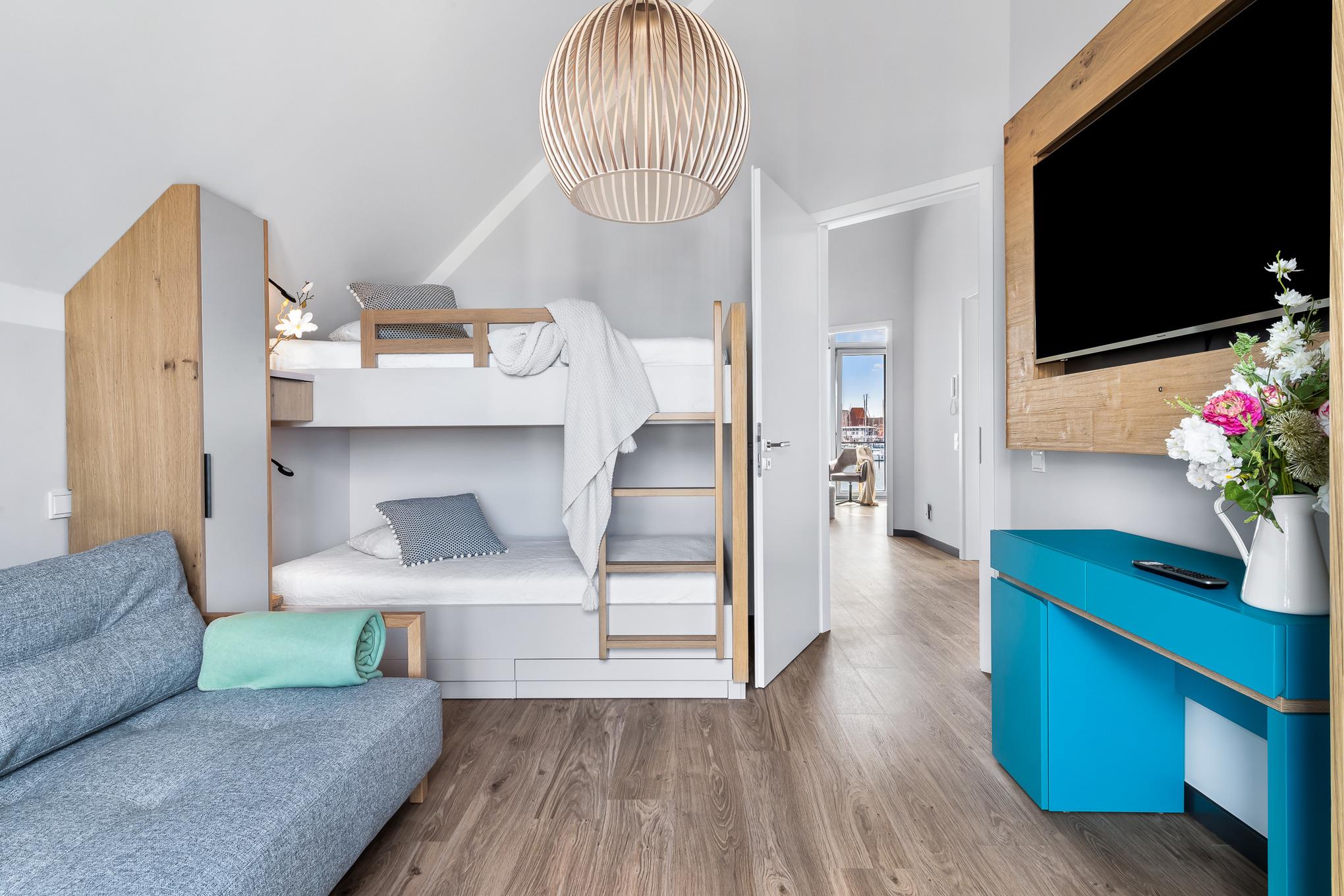 3. Zimmer: 1 Einbau-Hochbett mit 2 Liegeflächen á 90*200cm und 1 Ausziehcouch mit 2 zusätzlichen Schlafplätzen und einer Liegefläche von 155x200cm