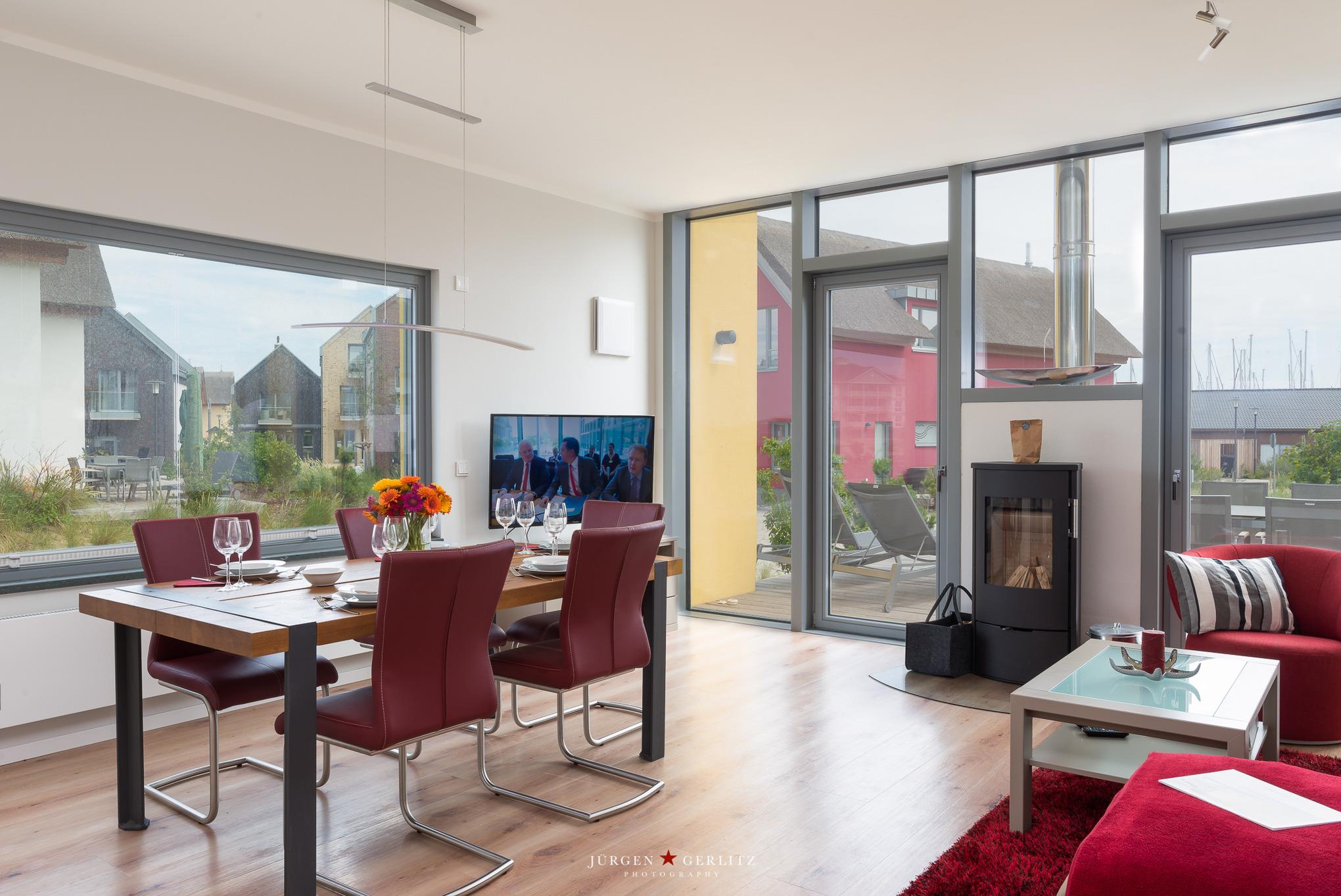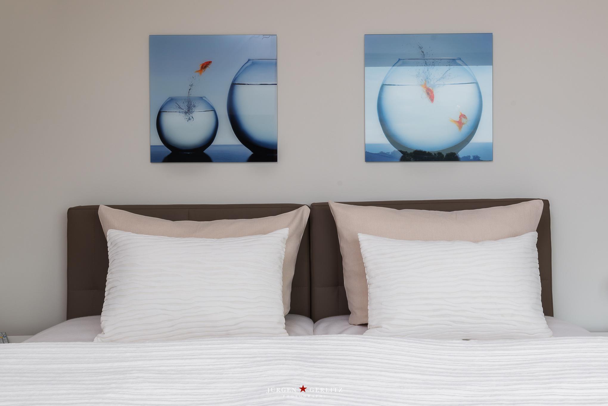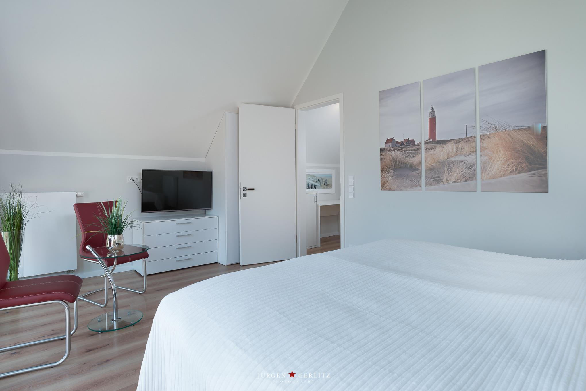 Ein Schlafraum hat bodentiefe, verdunkelbare Fenster mit Blick auf den Yachthafen. Vom anderen Schlafraum aus können Sie die Vögel auf dem Binnensee beobachten und auch die Ostsee sehen. In diesem Raum lassen sich die Betten alternativ als zwei Einzelbetten stellen. Ein drittes, komfortables Bett in diesem Raum wird bei Nichtgebrauch zum Sessel.