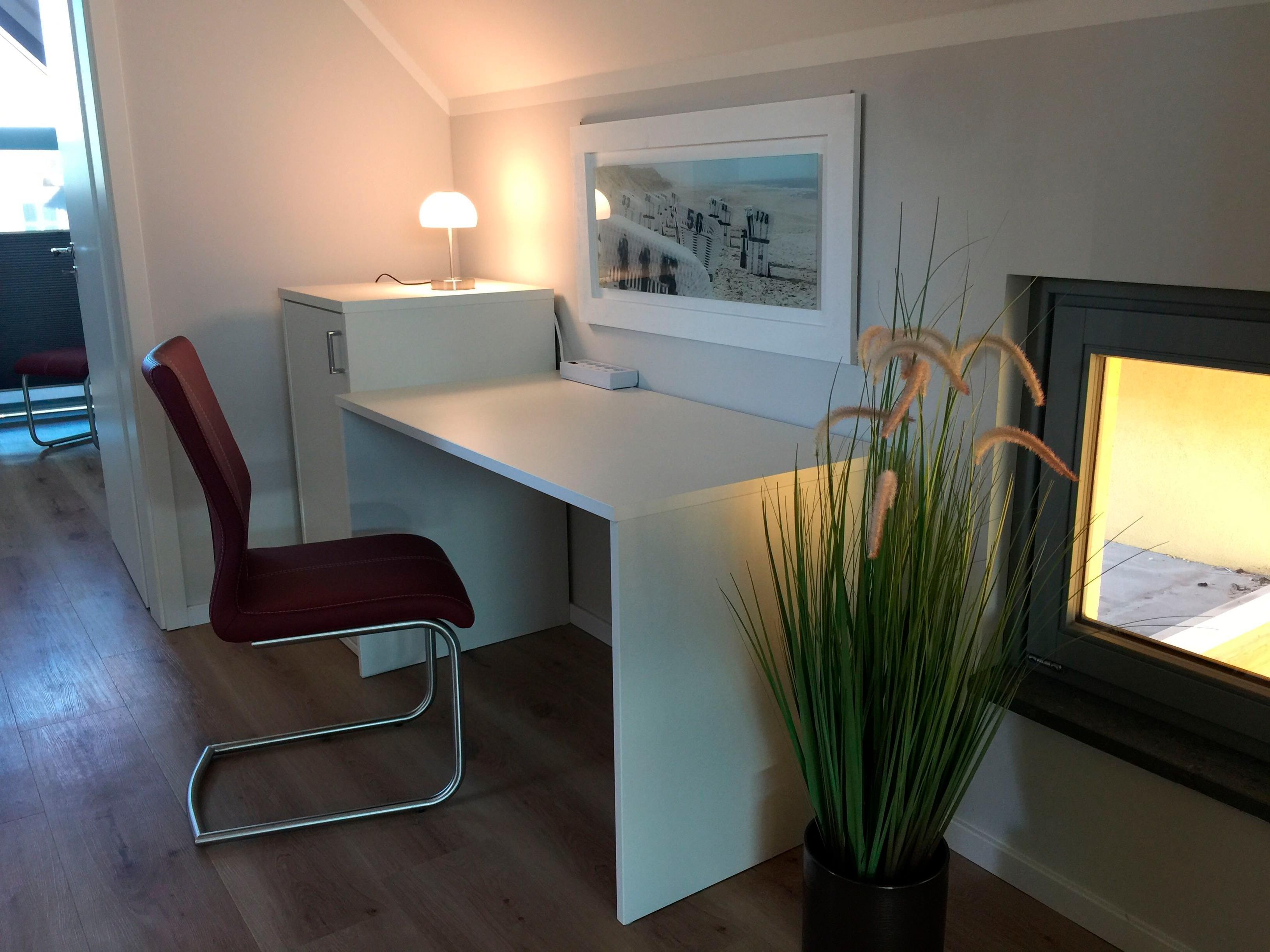 Auf der Galerie im Obergeschoß finden Sie einen Schreibtisch und einen Safe, der auch Laptops fassen kann.