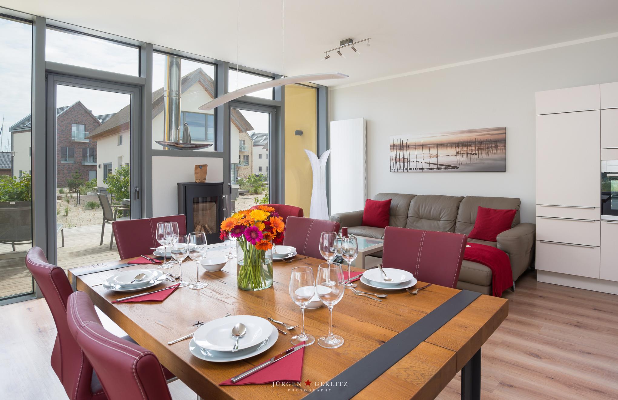 Der Essbereich bietet Platz für 6 Personen. Die offene, komplett ausgestattete Küchenzeile ermöglicht Ihnen ein Miteinander auch um die Mahlzeiten herum.