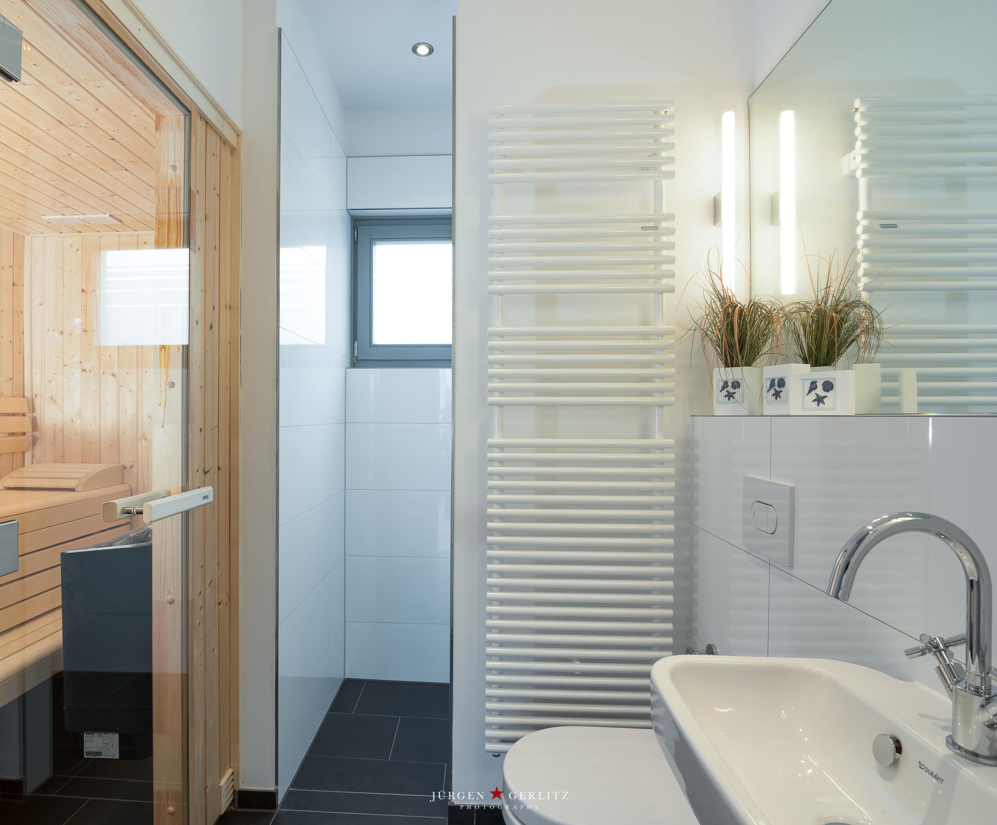 Im Erdgeschoß finden Sie ein weiteres Bad mit ebenerdiger, geräumiger Dusche und Ihre eigene Sauna vor.