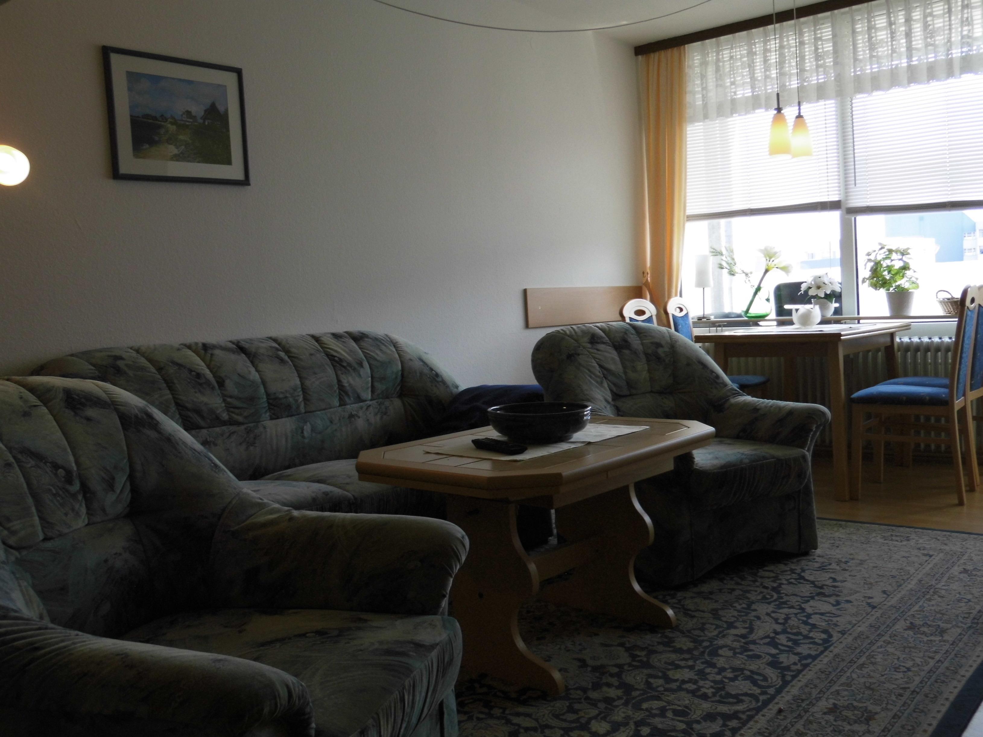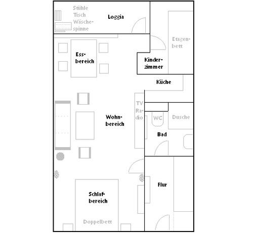 Gemütlich eingerichtete Nichtraucher-Ferienwohnung mit sonniger Süd-Loggia. Großer Wohn-/Schlafraum mit Laminatfußboden, Doppelbett in Komforthöhe, Couchgarnitur, SAT-TV, DVD-Player, Stereoanlage und Essecke. Separates Kinderzimmer mit Etagenbett.