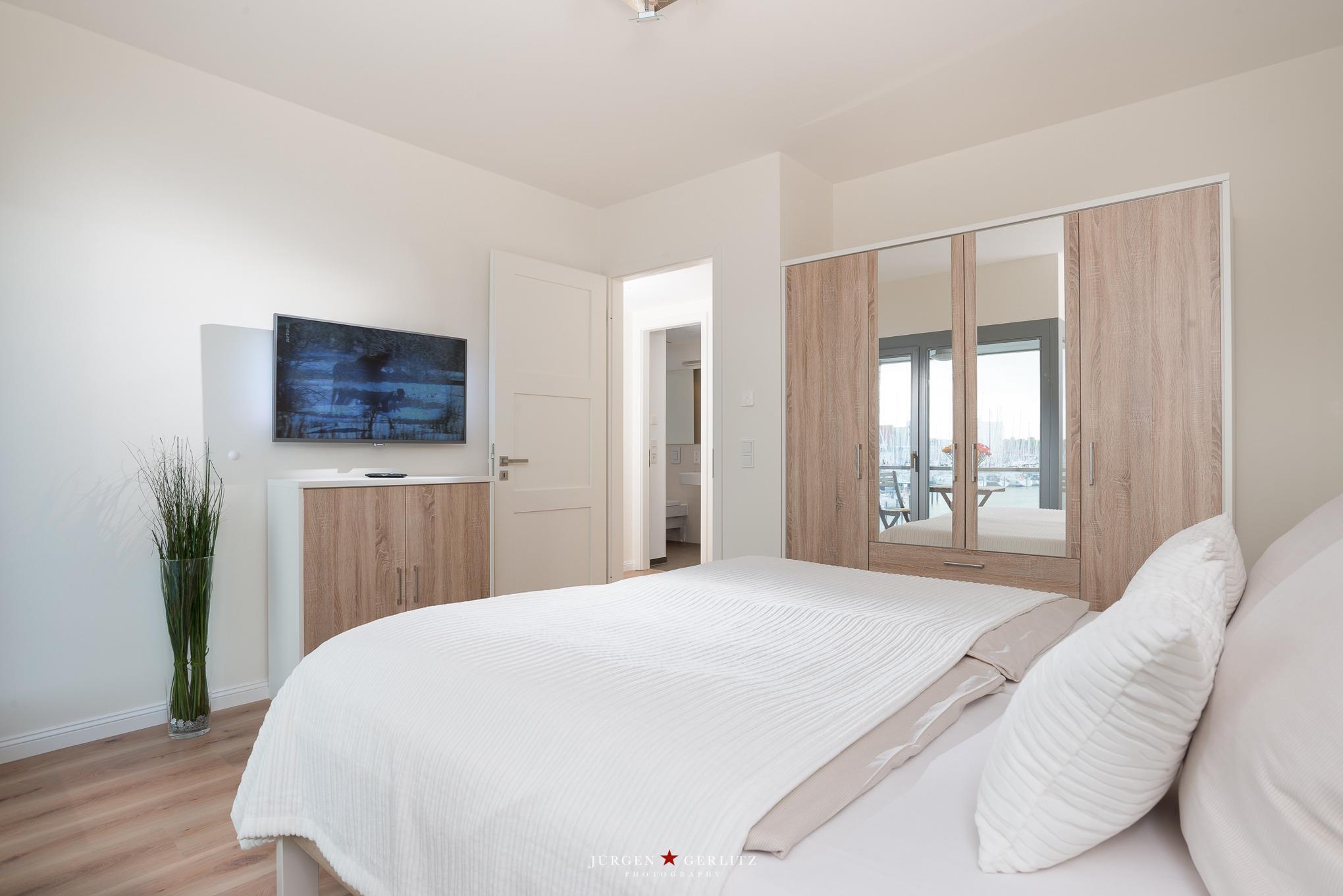 Nach einem erlebnisreichen Urlaubstag können Sie im großen Doppelbett mit Einzelmatratzen entspannen und eine geruhsame Nacht erleben. Auch sorgt im Schlafzimmer der große Kleiderschrank für genug Stauraum und ein weiterer LED-Smart-TV für Unterhaltung.