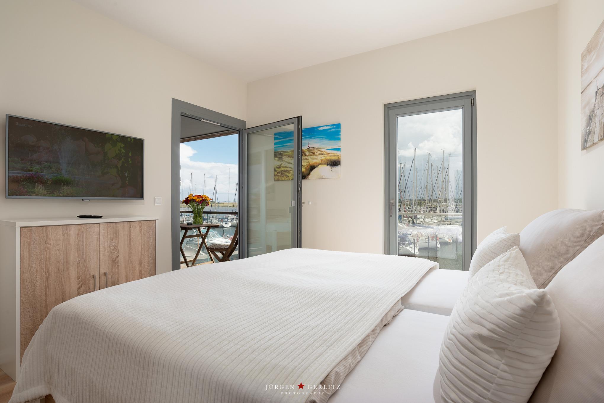 Von beiden Schlafzimmern gelangen Sie auf die windgeschützte Loggia mit Blick auf den Yachthafen.