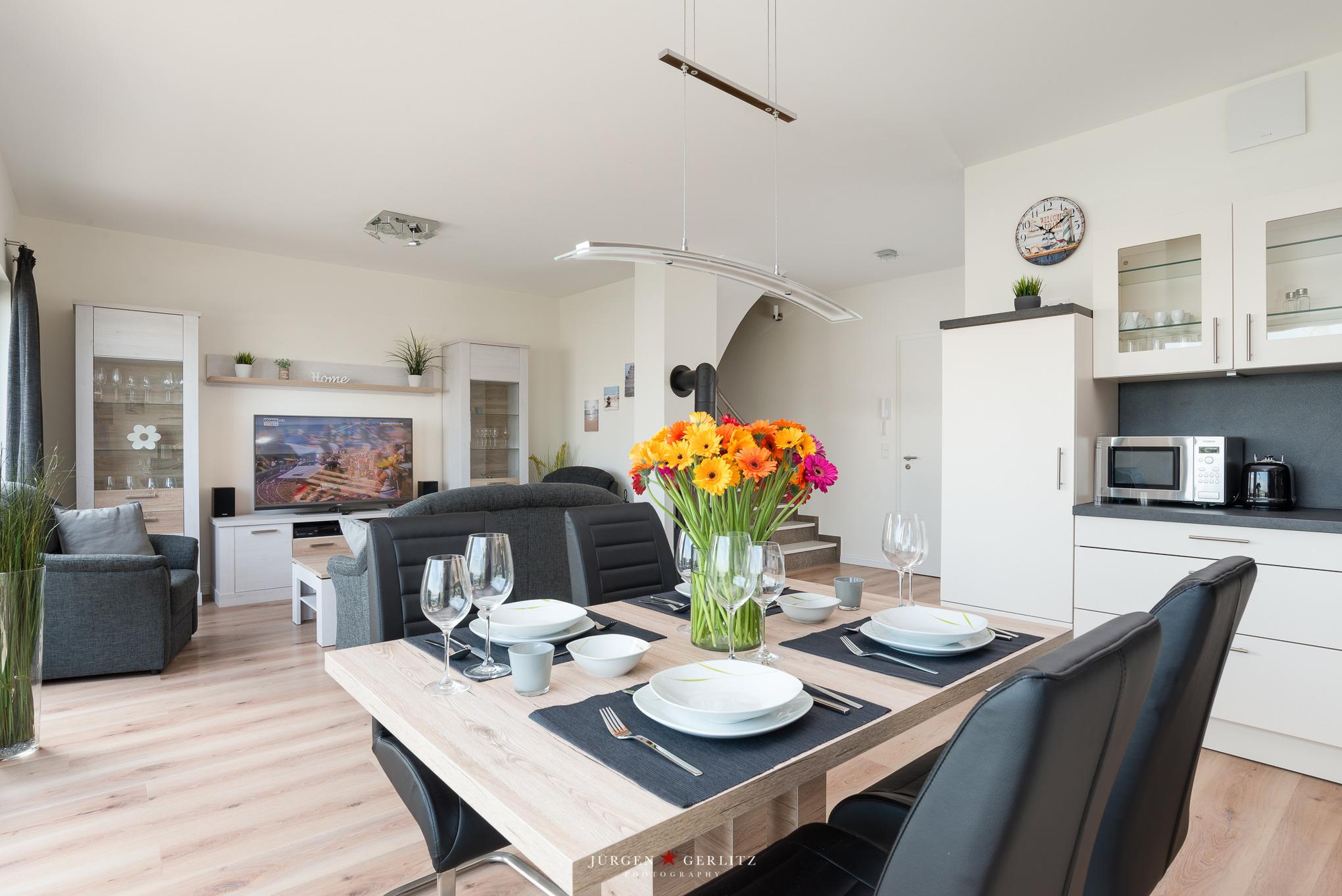 Die offene Wohnküche mit angrenzendem Ess- und Wohnbereich ist durch die großen bodentiefen Fenster lichtdurchflutet und sorgt für eine gemütliche Atmosphäre. Abends können Sie an kalten Herbst- und Winterabenden den Tag am wärmenden Kaminofen ausklingen lassen. Im Wohnbereich steht ein großer LED-Smart-TV mit Blu-Ray-/DVD-Player und X-Box-360 zur Verfügung. Ferner ist ein Mini-CD-Anlage mit i-phone/i-pod-Anschluss vorhanden. Die komplette Wohnung verfügt über eine Fußbodenheizung.