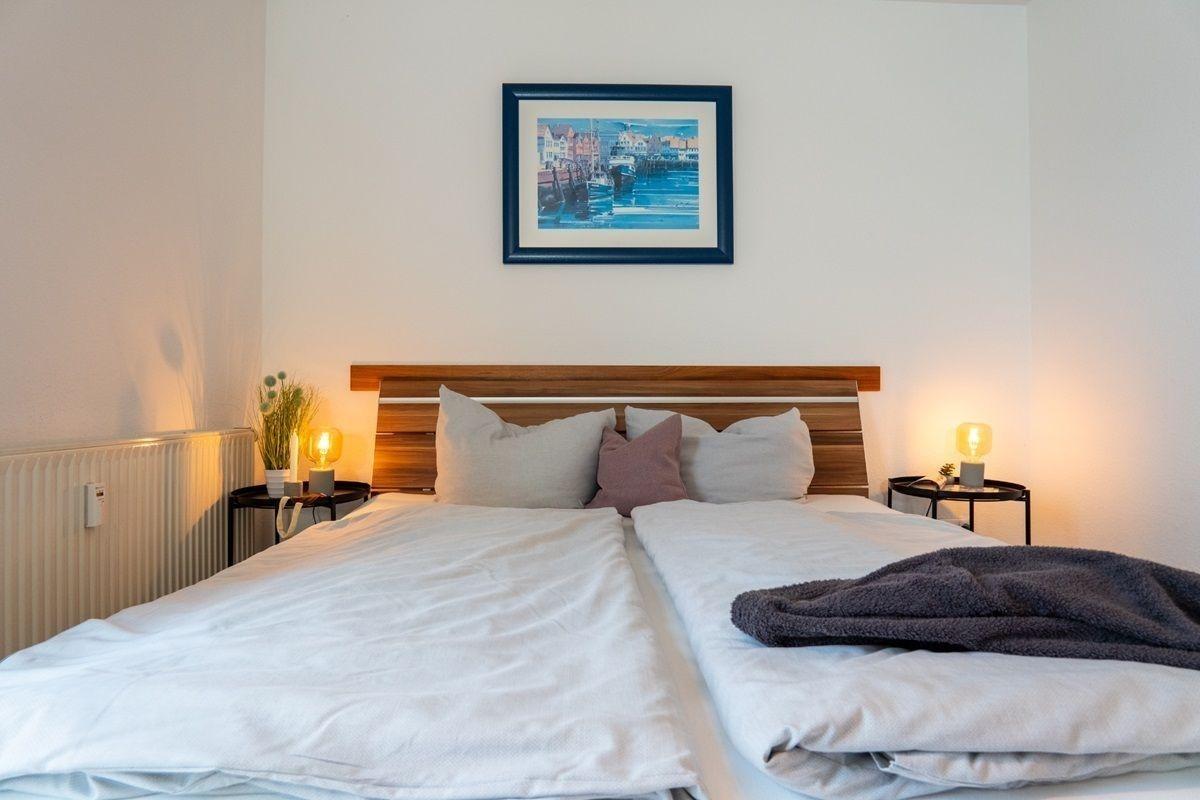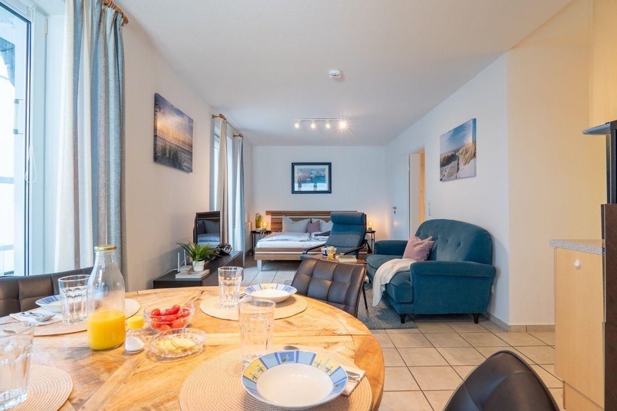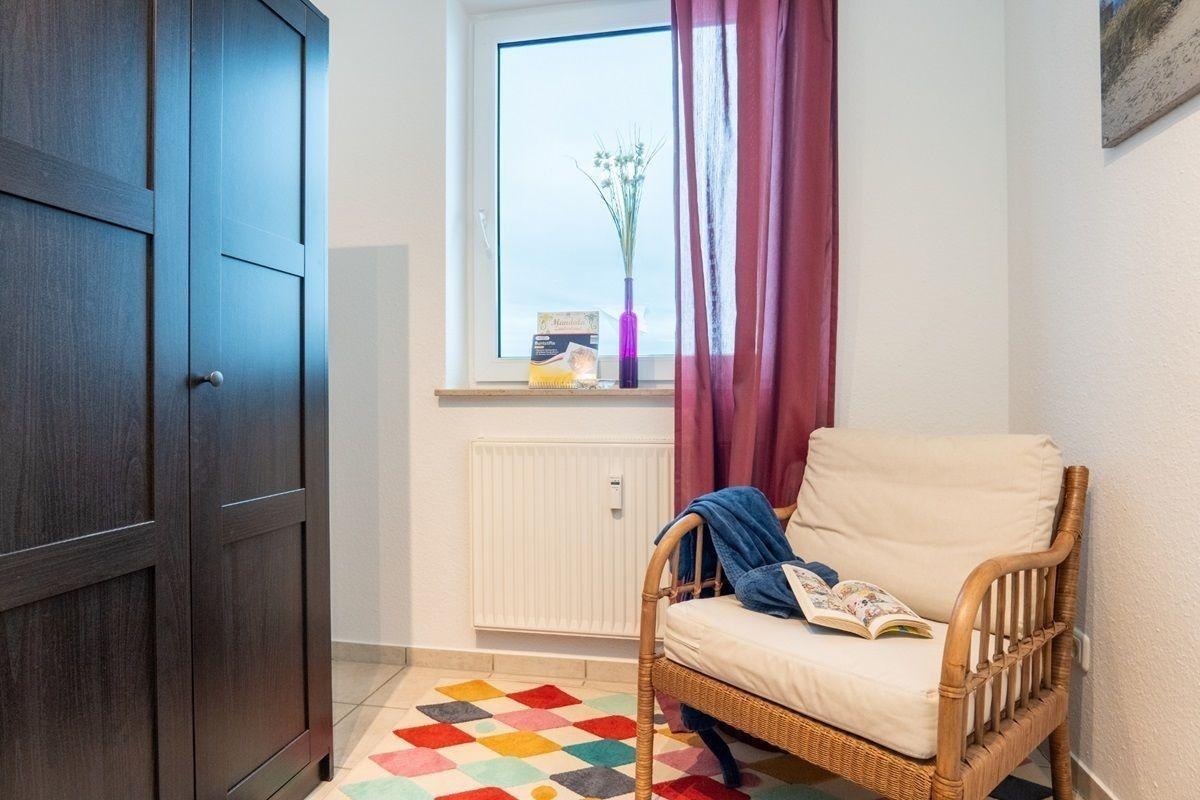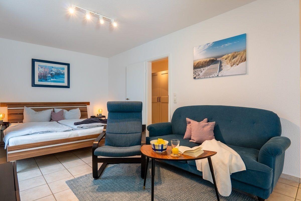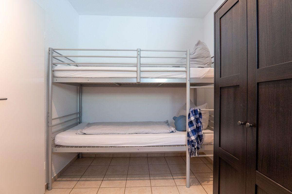Die Wohnung verfügt über einen lichtdurchfluteten Wohnbereich mit einer gemütlichen Sitzecke, einer Essecke mit tollem Ausblick zum Binnensee und der angrenzenden offenen Küchenzeile. Vom Wohnbereich aus gelangt man auf dem Südbalkon - mit dem See direkt vor der Tür. Das Doppelbett (ca. 180 x 200 cm) befindet sich im hinteren Teil des Wohnzimmers. Das Kinderzimmer ist ein separater Raum und mit einem gemütlichen Etagenbett und einem geräumigen Kleiderschrank ausgestattet.