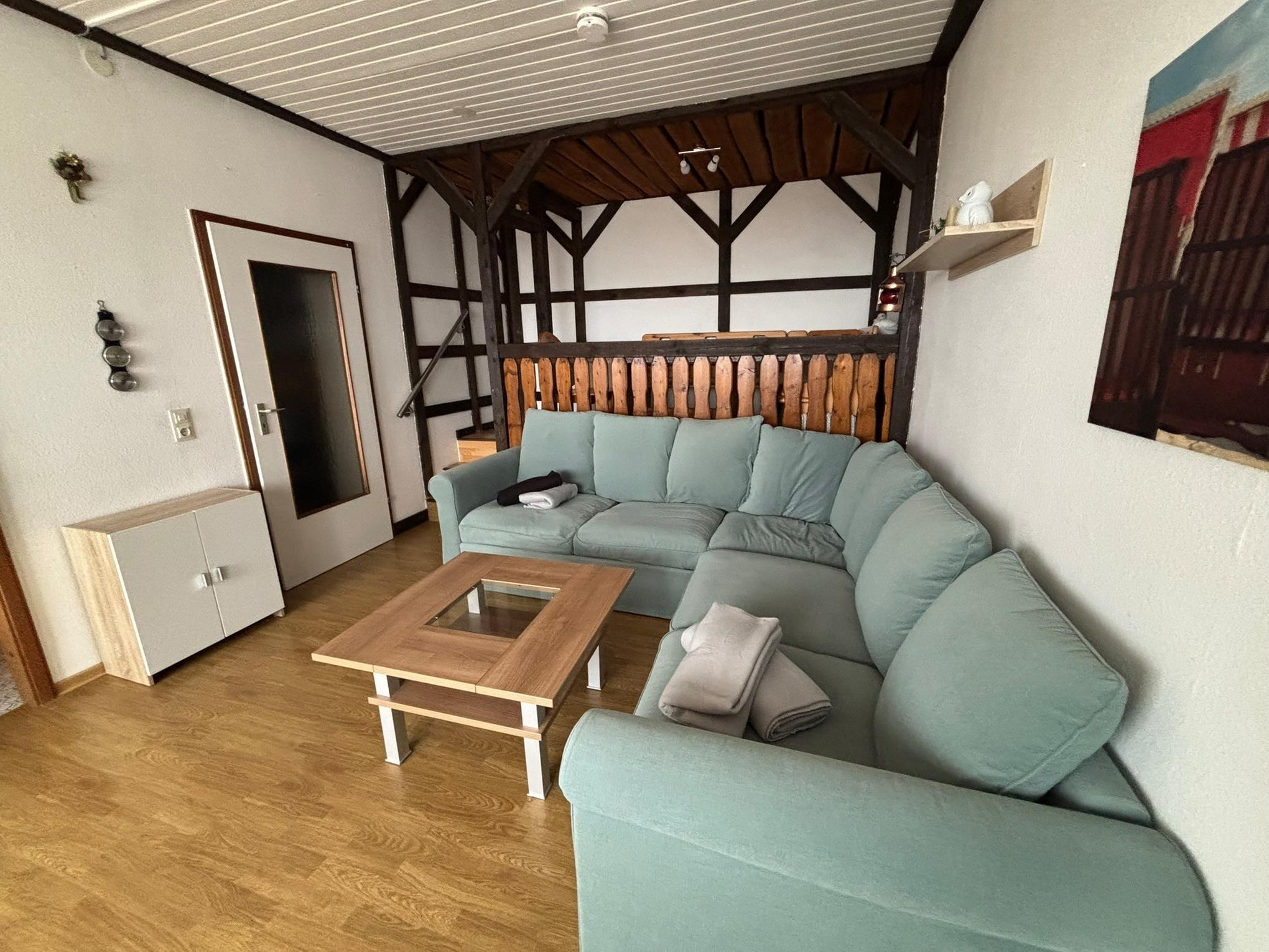 Das Wohnzimmer ist mit einer TV-Ecke, großem Ecksofa, einer Essecke und einer Küchenzeile ausgestattet. Vom Wohnbereich aus gelangt man auf die Dachterrasse.