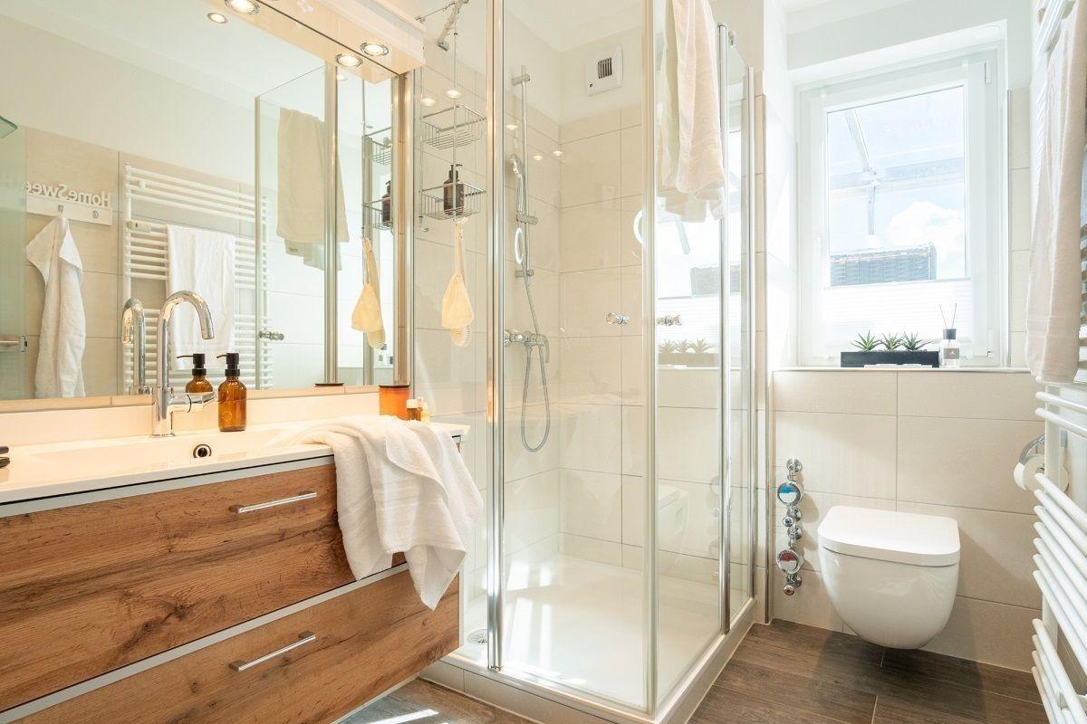 Vom Flur abgehend befindet sich das Duschbad - ausgestattet mit einer Duschkabine aus Glas, Föhn und Handtuchheizkörper.