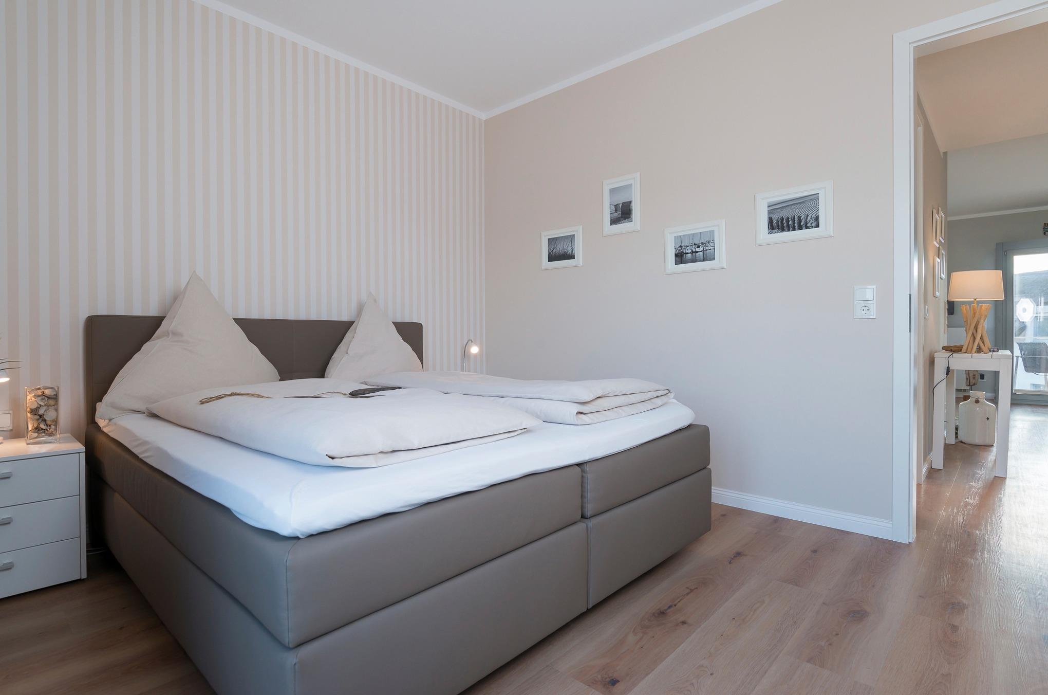 Im Schlafzimmer befindet sich ein großes Boxspringbett mit allergikerfreundlichen Kissen und Decken. Darüber hinaus finden Sie hier einen zweiten Flat Screen TV. Vom Balkon genießen Sie den Teilblick auf den Yachthafen und die Ostsee.