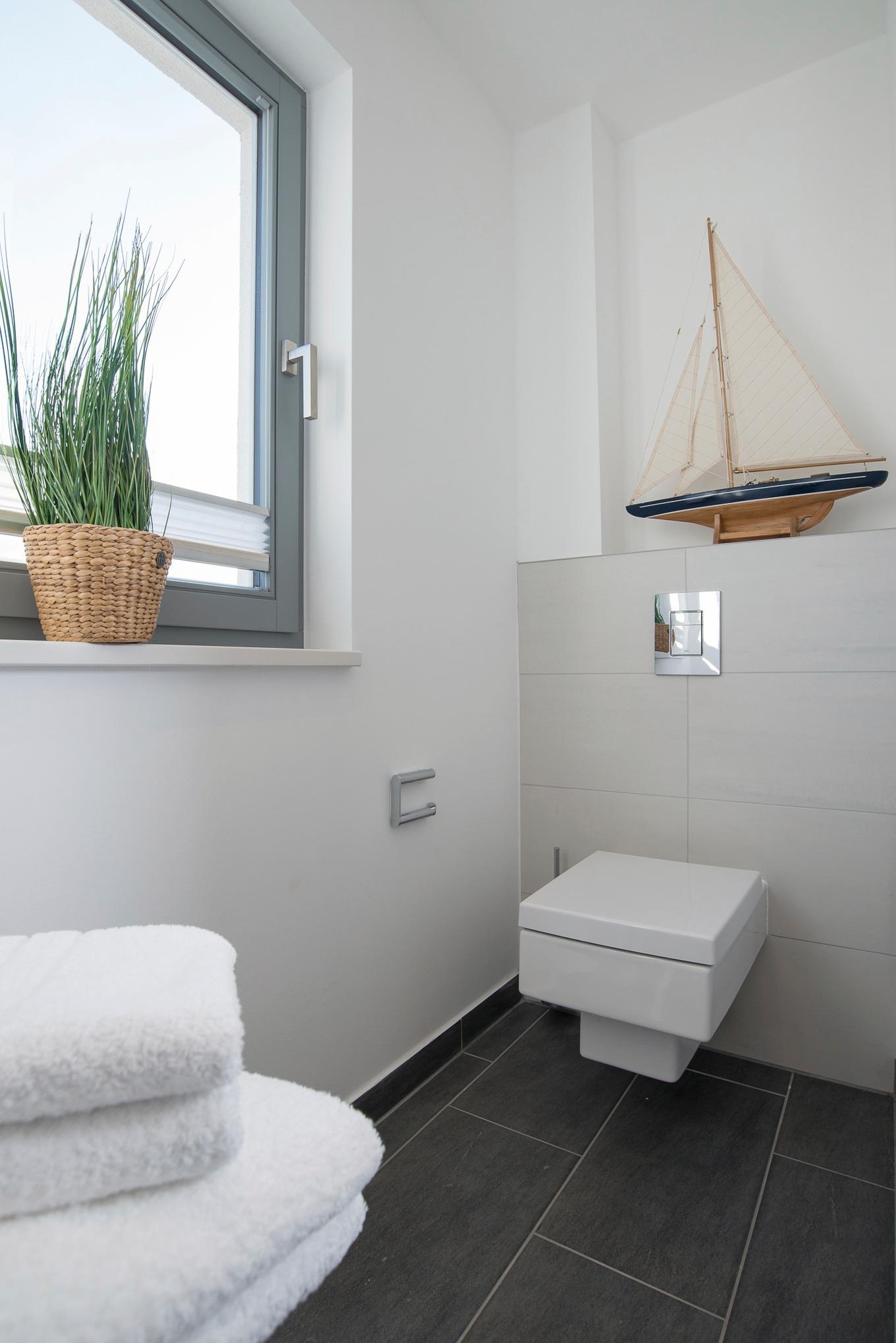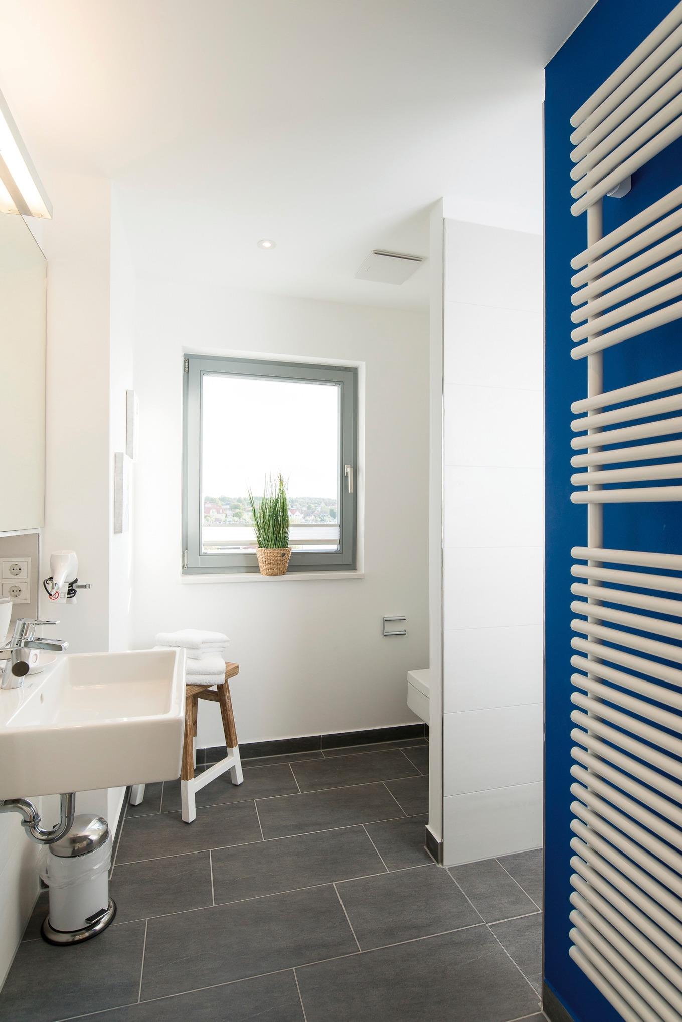 Im hochwertig ausgestatteten Bad mit Fußbodenheizung, ebenerdiger Regendusche und Handtuchheizkörper genießen Sie bereits am Morgen den Blick auf die Marina und die Stadt Heiligenhafen.