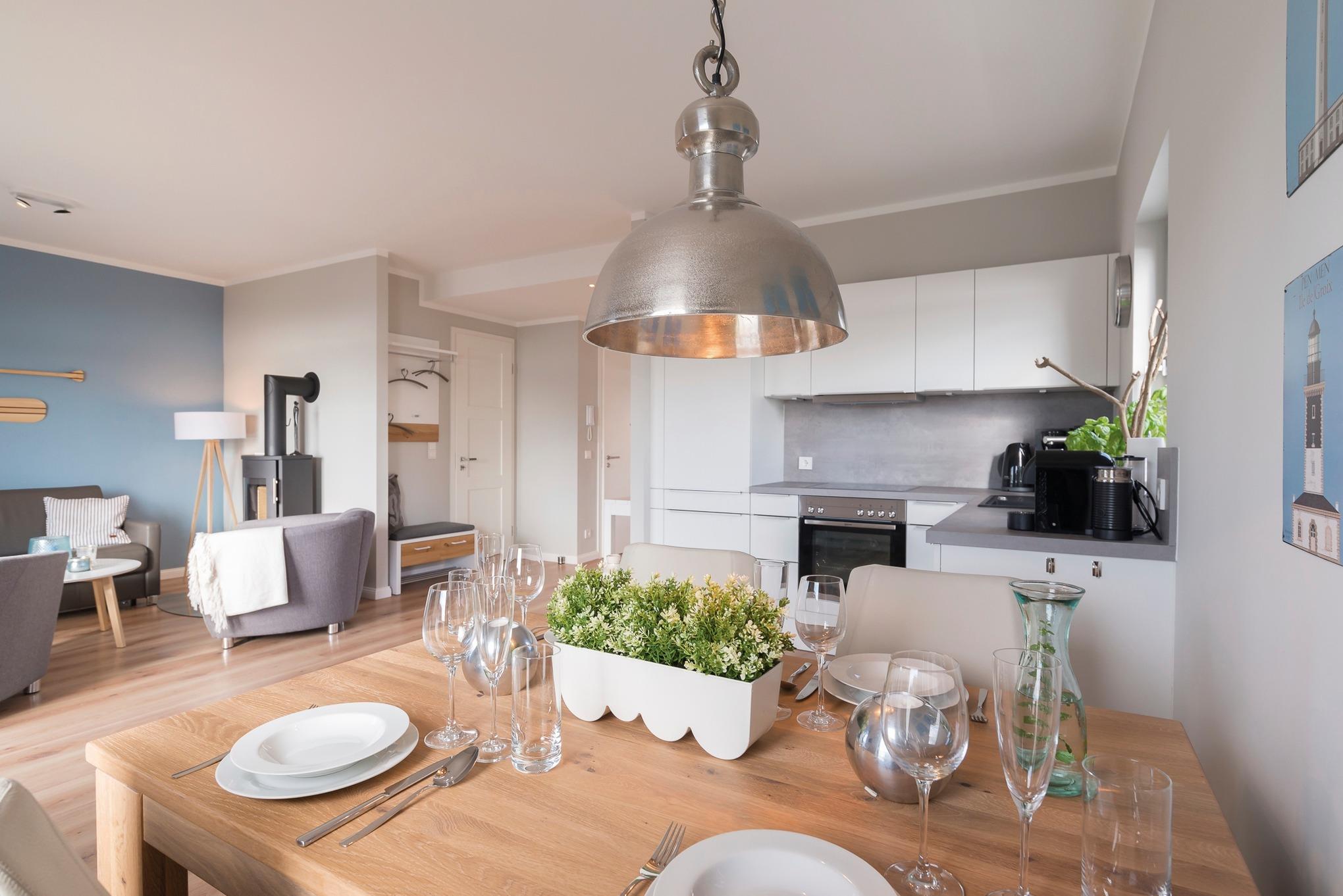 Der lichtdurchflutete Wohn- Essbereich lädt Sie mit seinem komfortablen Lederschlafsofa, zwei gemütlichen Sesseln und einem Kaminofen ein, auch bei schlechtem Wetter eine erholsame Zeit zu verbringen. Im Essbereich mit seinem Massivholztisch genießen Sie die maritimen Köstlichkeiten der Region. Diese bereiten Sie in der angrenzenden hochwertig ausgestatteten Küche zu. Begeistern Sie sich tagsüber für den herrlichen Blick auf die Stadt Heiligenhafen, die Marina und den Binnen- See und genießen Sie am Abend die herrlichen Sonnenuntergänge auf dem Balkon.