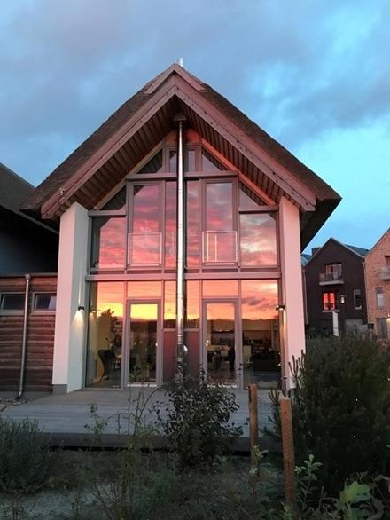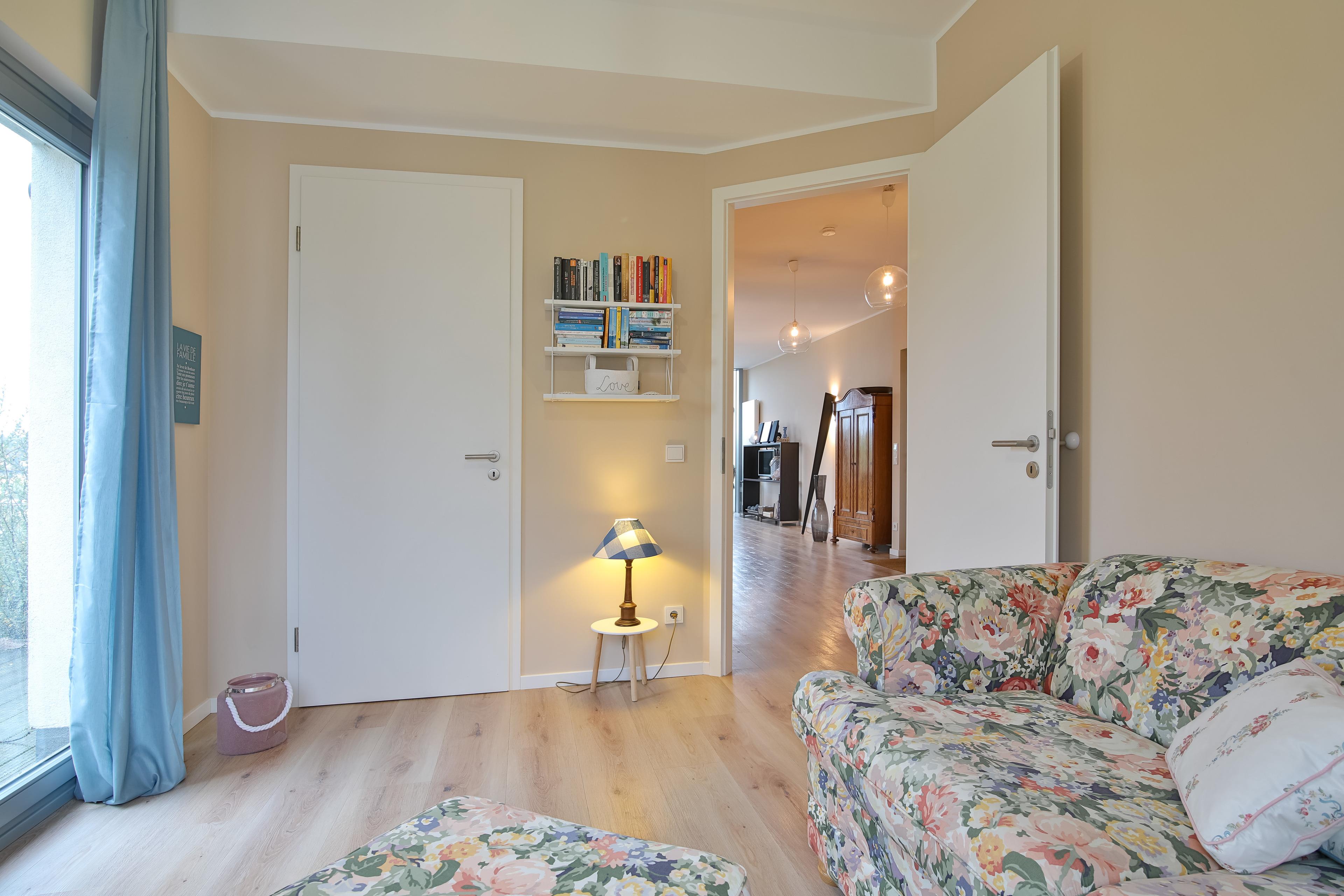Im Erdgeschoss erwartet Sie ein großzügiger Wohnbereich mit Kamin und TV, ein anschließender Essbereich sowie eine voll ausgestattete Küchenzeile. Von hier aus gelangen Sie auf eine möblierte Terrasse, umringt von Grün, mit einem Grill, Sonnenliegen und einem Strandkorb. Die andere Terrasse liegt auf der gegenüberliegenden Seite, sodass Sie den ganzen Tag Sonne haben. Abgerundet wird das Erdgeschoss durch ein Gäste-WC und einen extra Zimmer mit Couch.