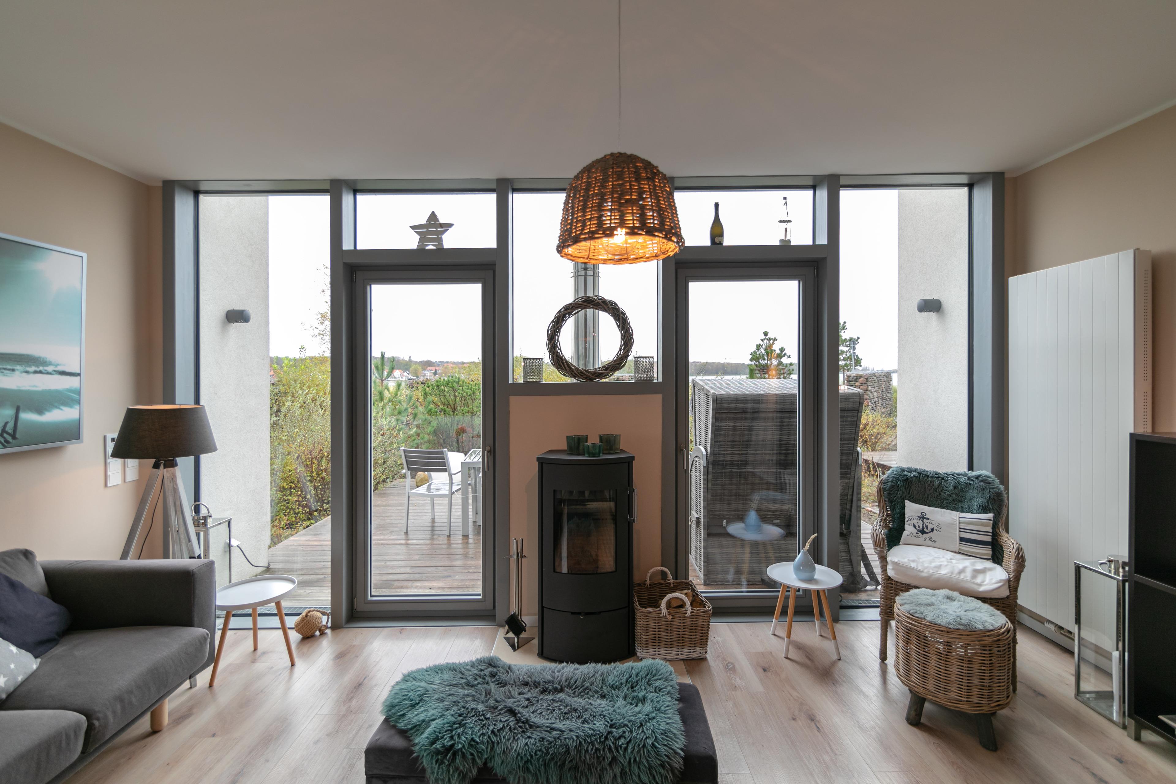 Modernes Ferienhaus in Heiligenhafen mit Sauna, Strandkorb und Yachthafenblick für entspannte Urlaubstage.