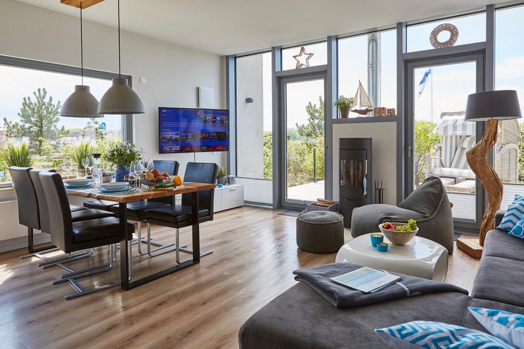 Durch die großen Fenster erwartet Sie ein besonders helles und freundliches Ambiente. Die Terrasse zur Südseite lädt zu einem gemütlichen Grillabend mit der Familie ein und im Winter lässt es sich wunderbar vor dem Kaminofen entspannen. Auch den Sonnenuntergang von der "Strandbar An der Seebrücke" aus sollten Sie sich bei einem leckeren Cocktail nicht entgehen lassen.