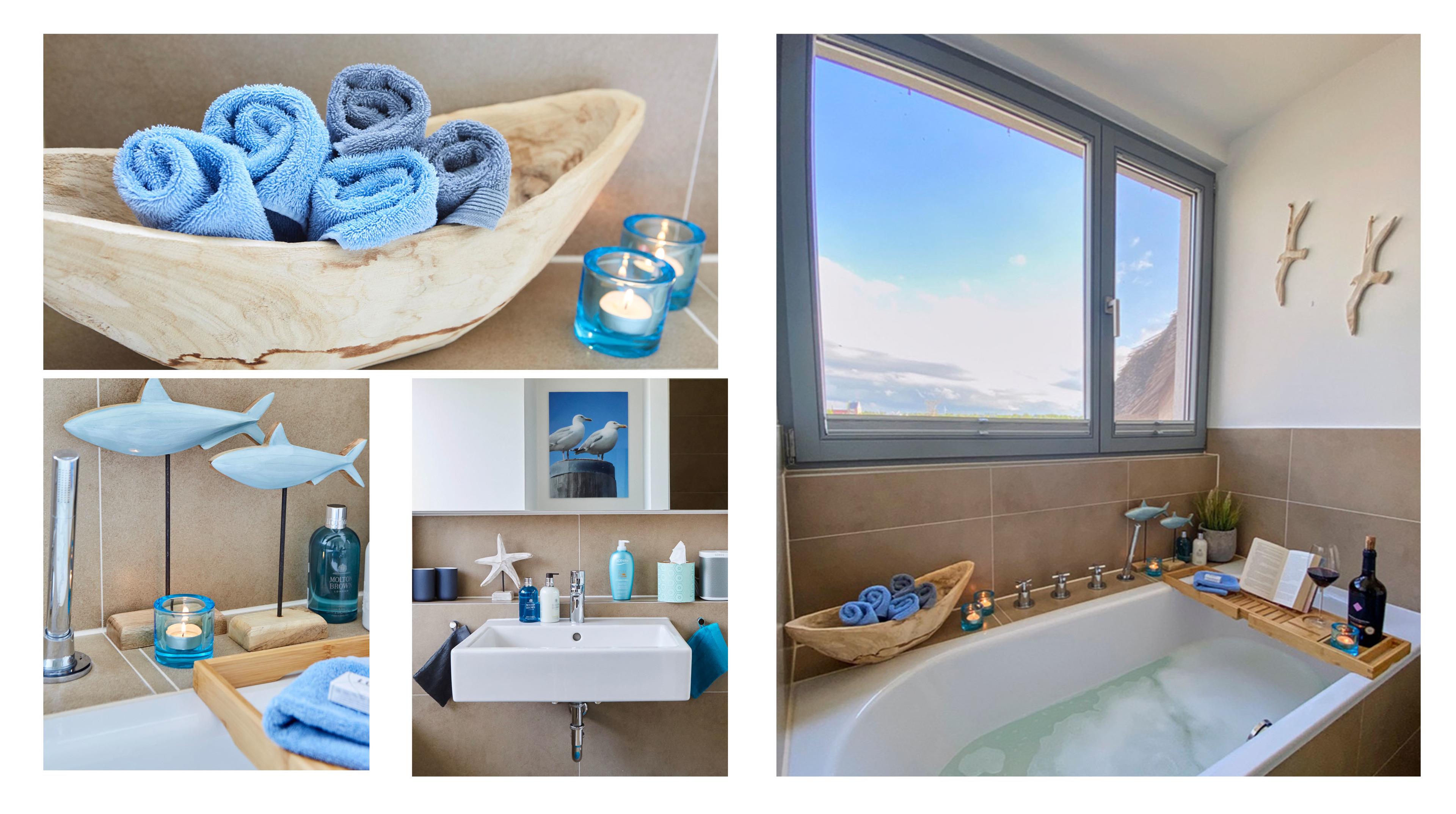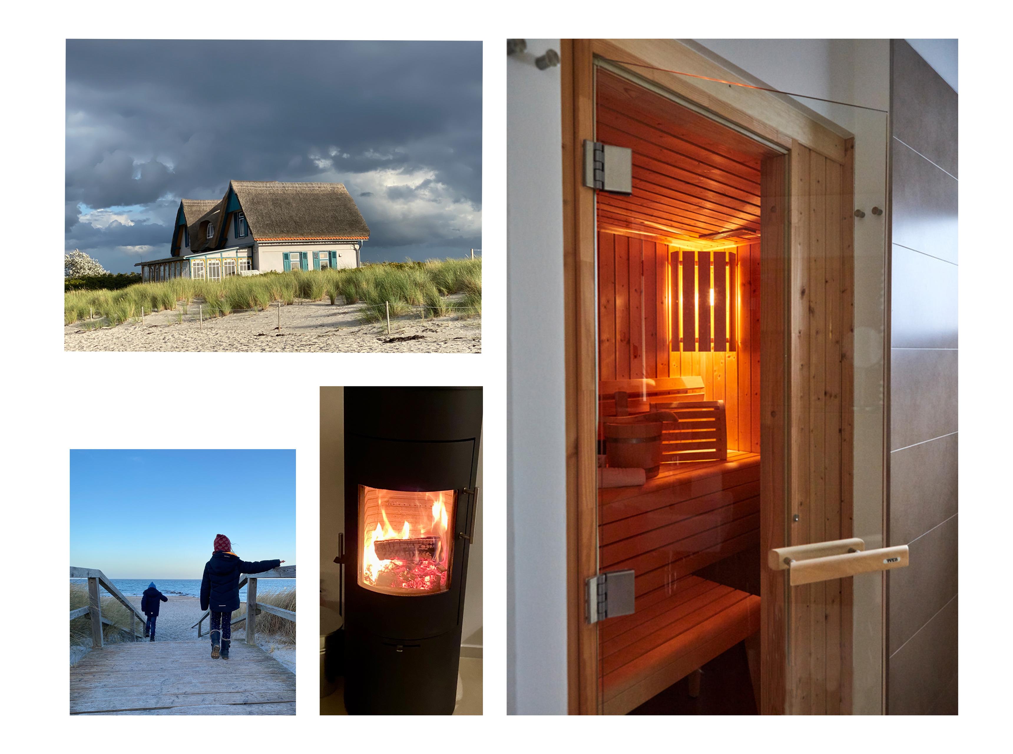 2 Bäder, eines mit Sauna, eines mit Badewanne und 2 x Raindance-Walk-In- Dusche, Kaminofen im Wohnbereich, zwei Aussenliegen und ab Frühjahr 2020 ein Strandkorb am Strand und am Haus.