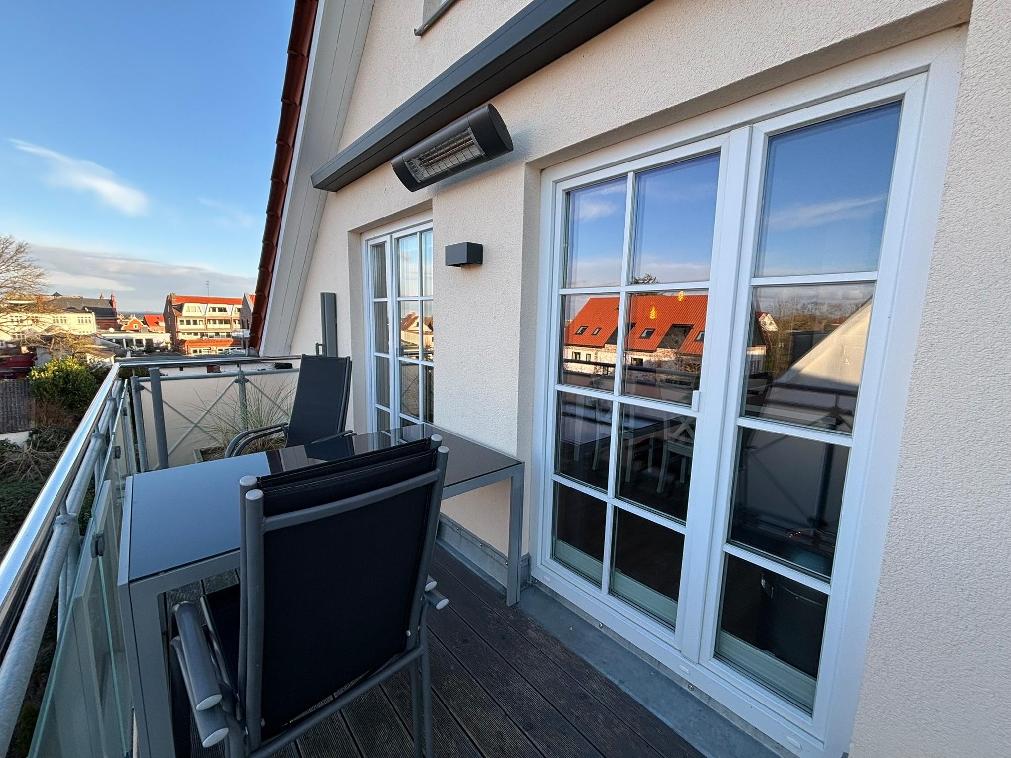 Moderne Ferienwohnung in Heiligenhafen mit Balkon, Gartenstühlen und moderner Ausstattung für einen komfortablen Aufenthalt.