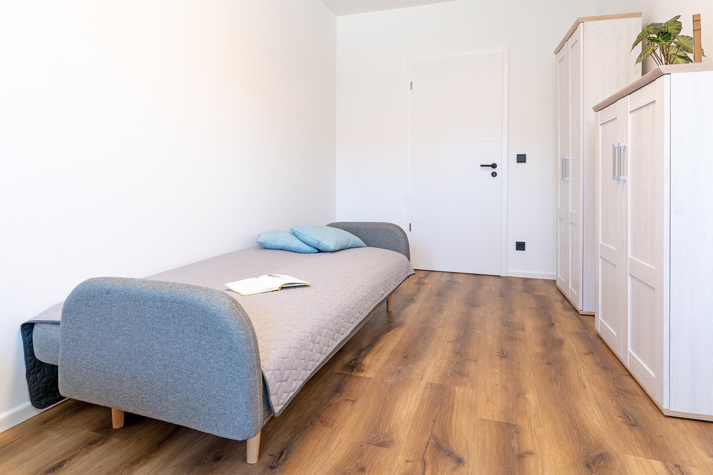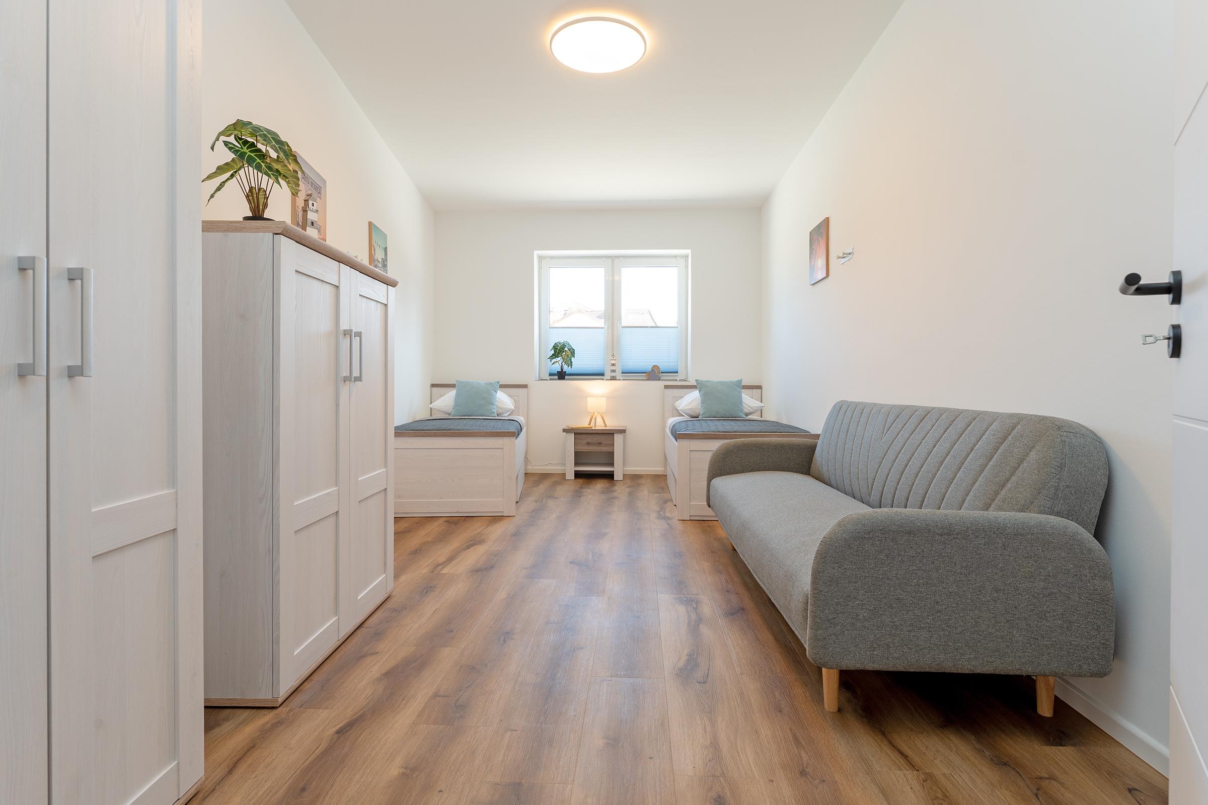 Schlafzimmer 3: 2 Einzelbetten (2x 90x200 cm), 1 Schlafsofa (120x200 cm), Kleiderschrank, Verdunkelung: Verdunkelungsplissees und -vorhänge, Platz für ein Babybett vorhanden