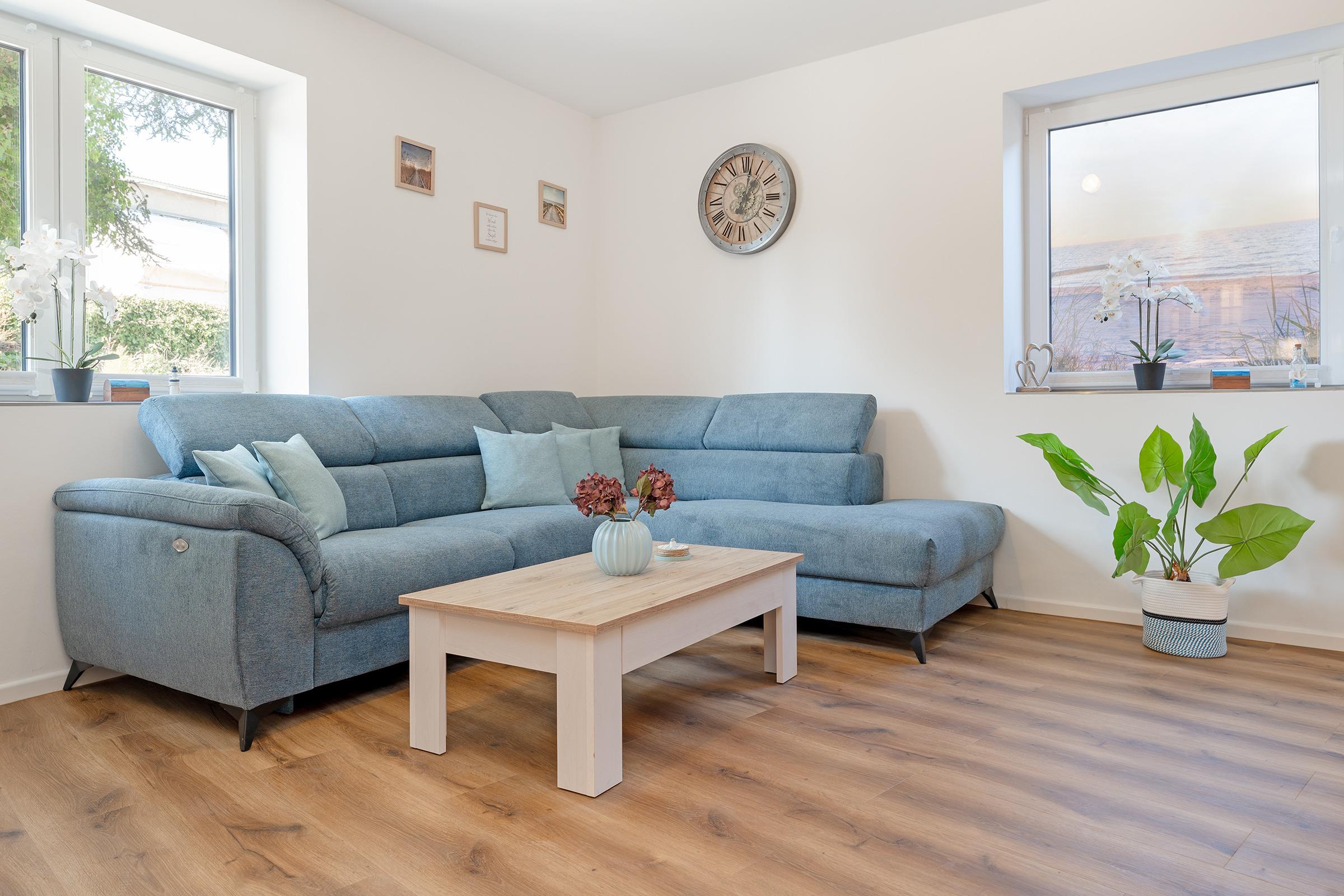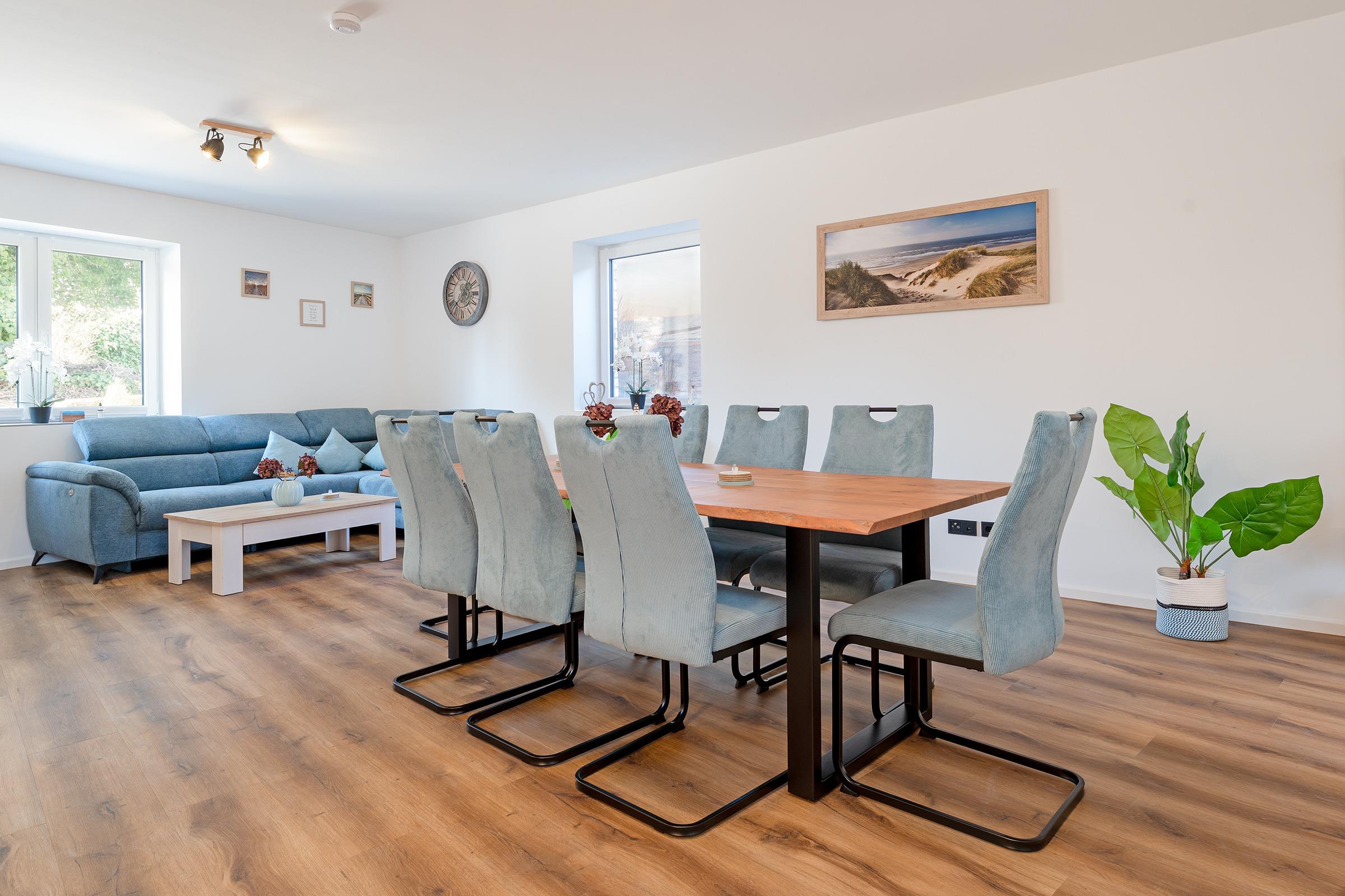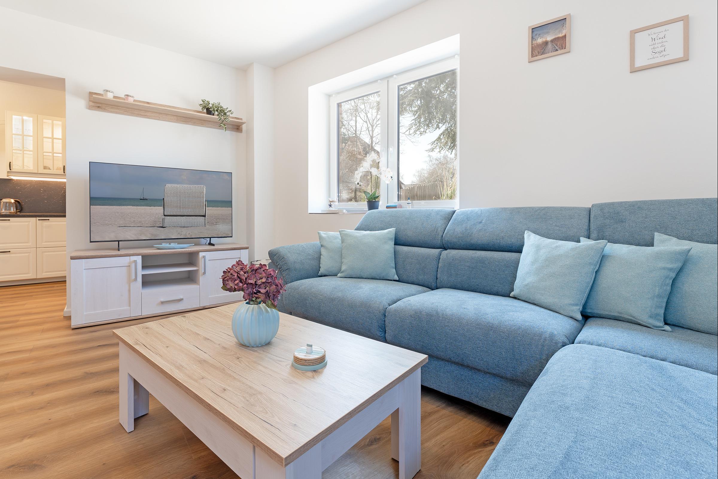 Diese großzügige und hochwertig ausgestattete Ferienwohnung in Heiligenhafen lädt mit modernem Komfort und stilvoller Einrichtung zu einem unvergesslichen Urlaub an der Ostseeküste ein. Der offene Wohnbereich ist lichtdurchflutet und bietet eine gemütliche Sofaecke, einen großen TV und einen Essbereich für gemeinsame Mahlzeiten.