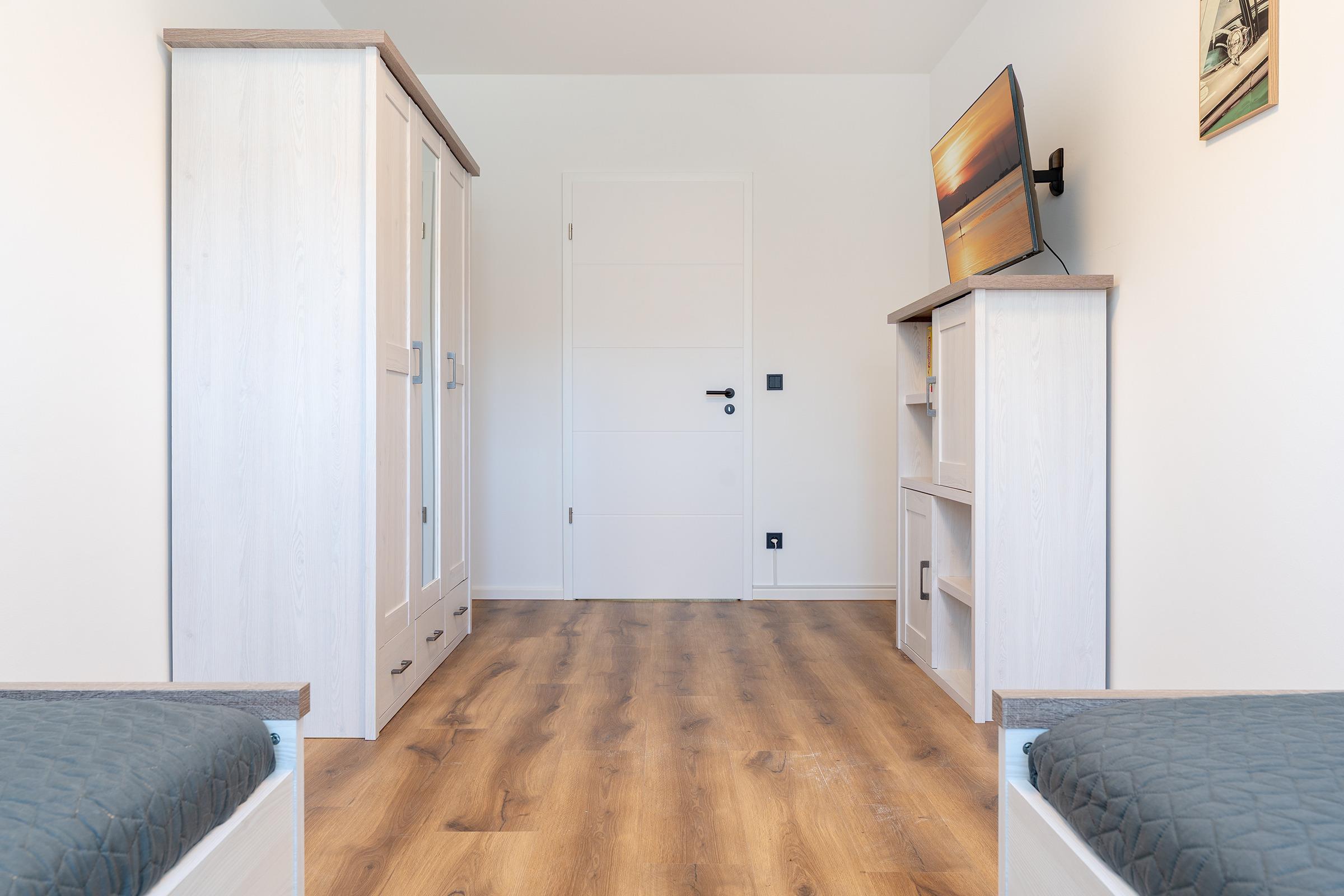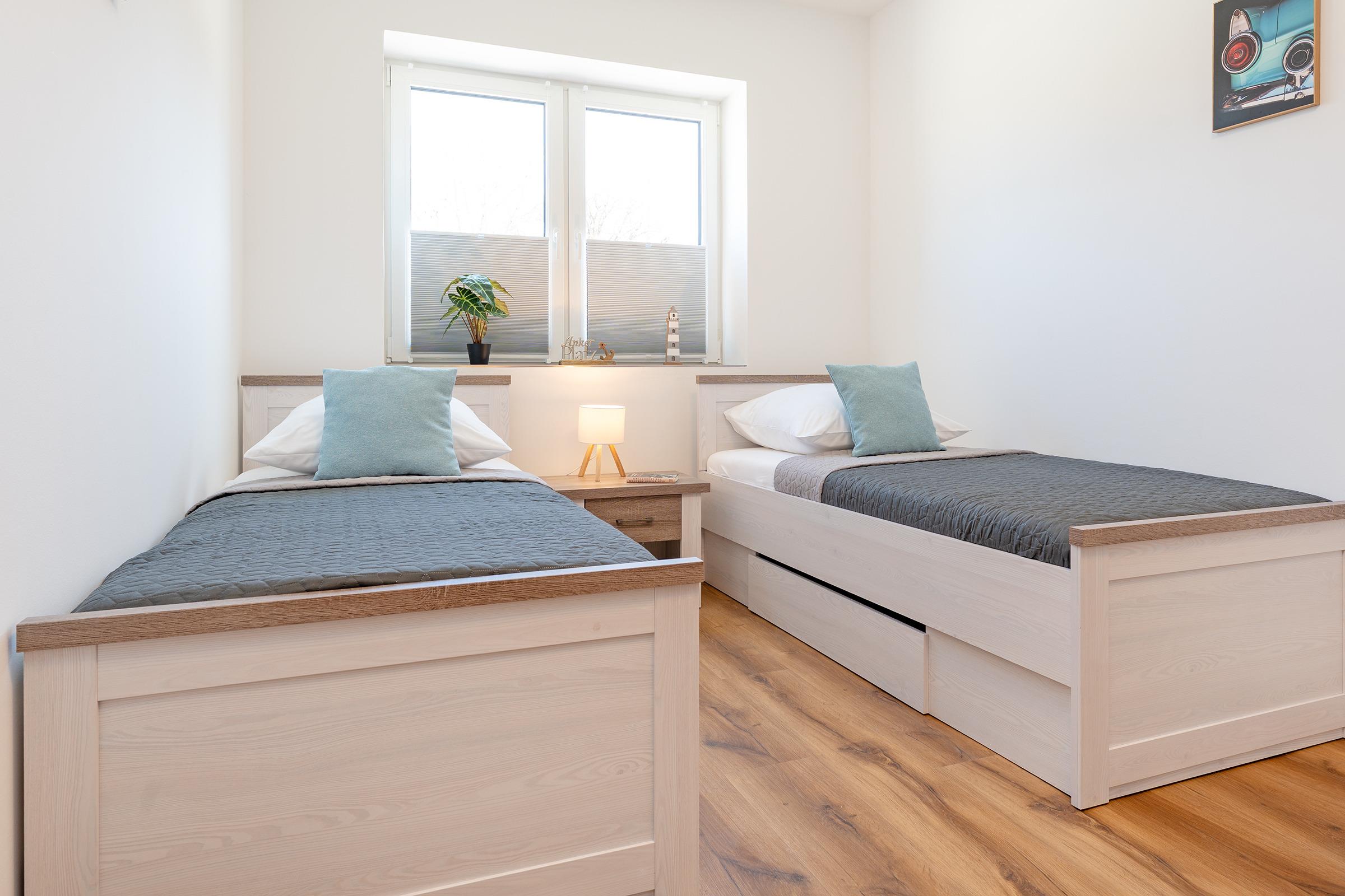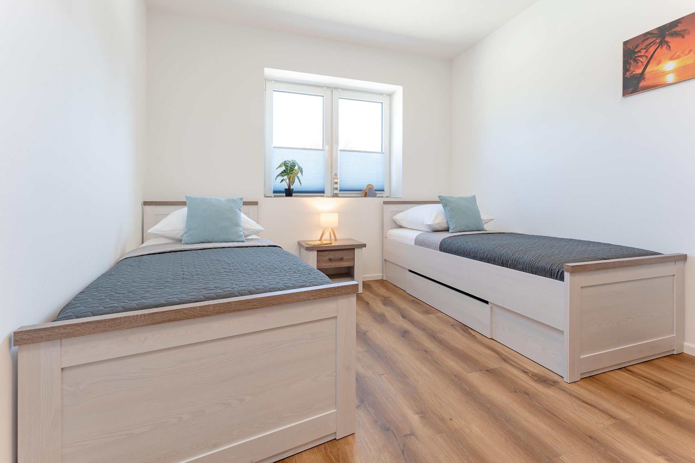 Schlafzimmer 2: 1 Doppelbett (2x 90x200 cm), Kleiderschrank, Verdunkelung: Verdunkelungsplissees und -vorhänge, Platz für ein Babybett vorhanden
