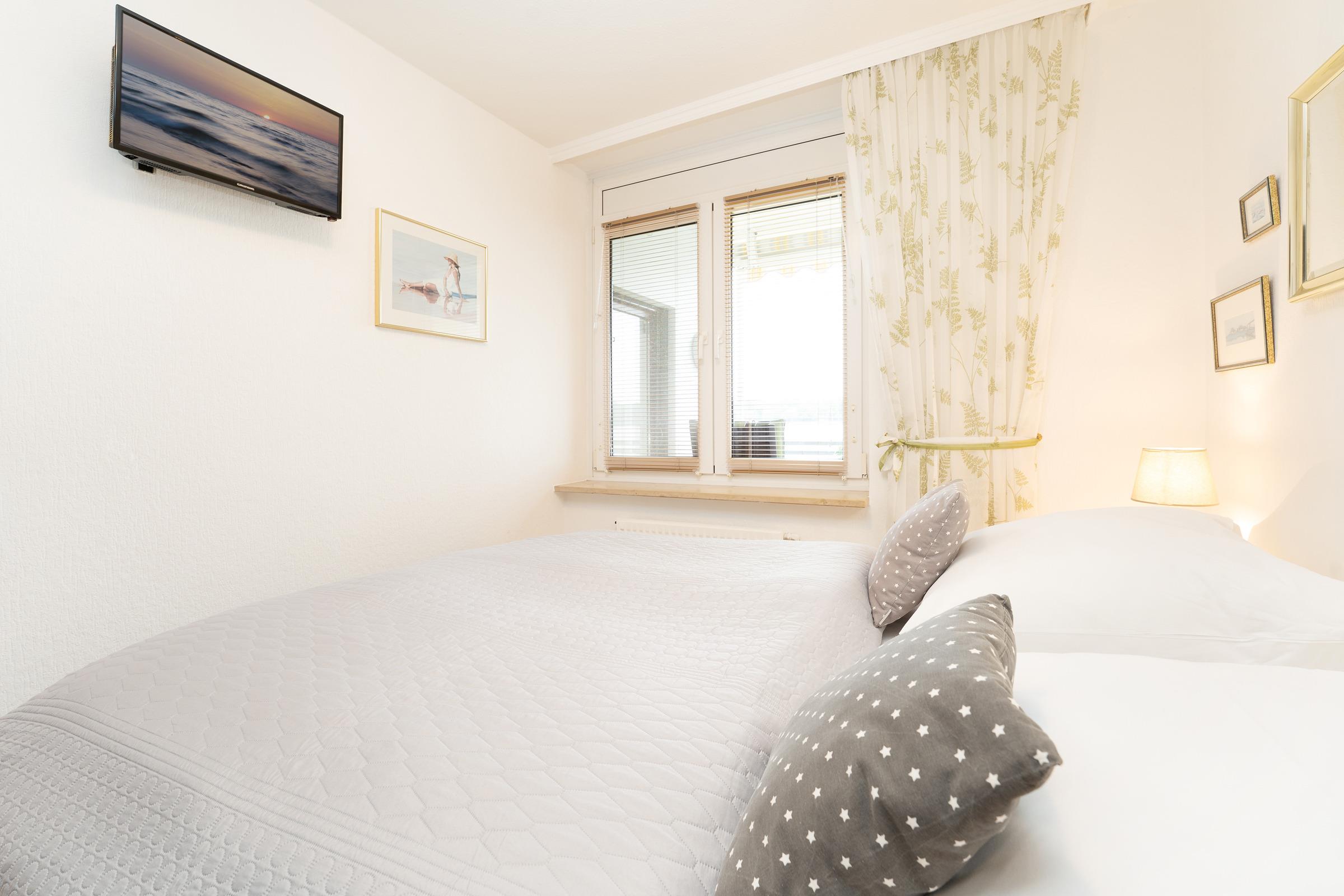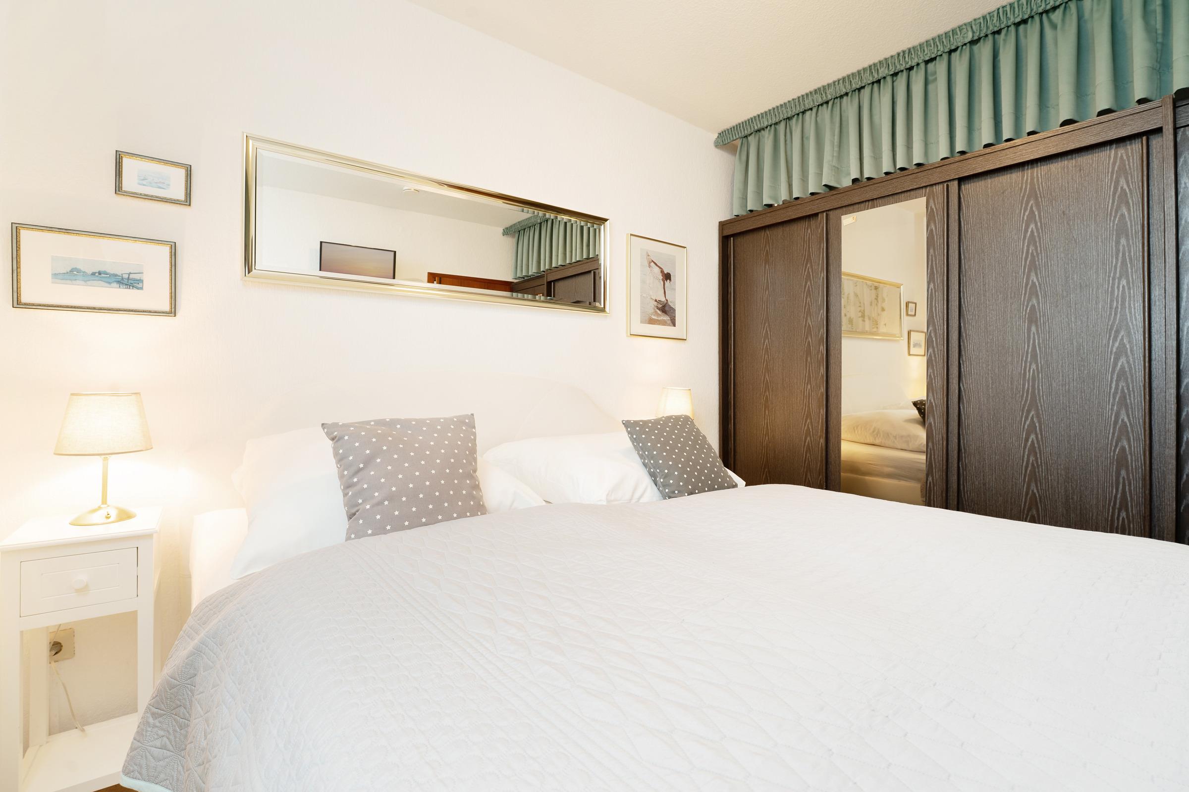 Schlafzimmer 1: 1 Doppelbett (2x 90x200 cm), Kleiderschrank, Verdunkelung: Jalousie, kein Platz für ein Babybett vorhanden, TV