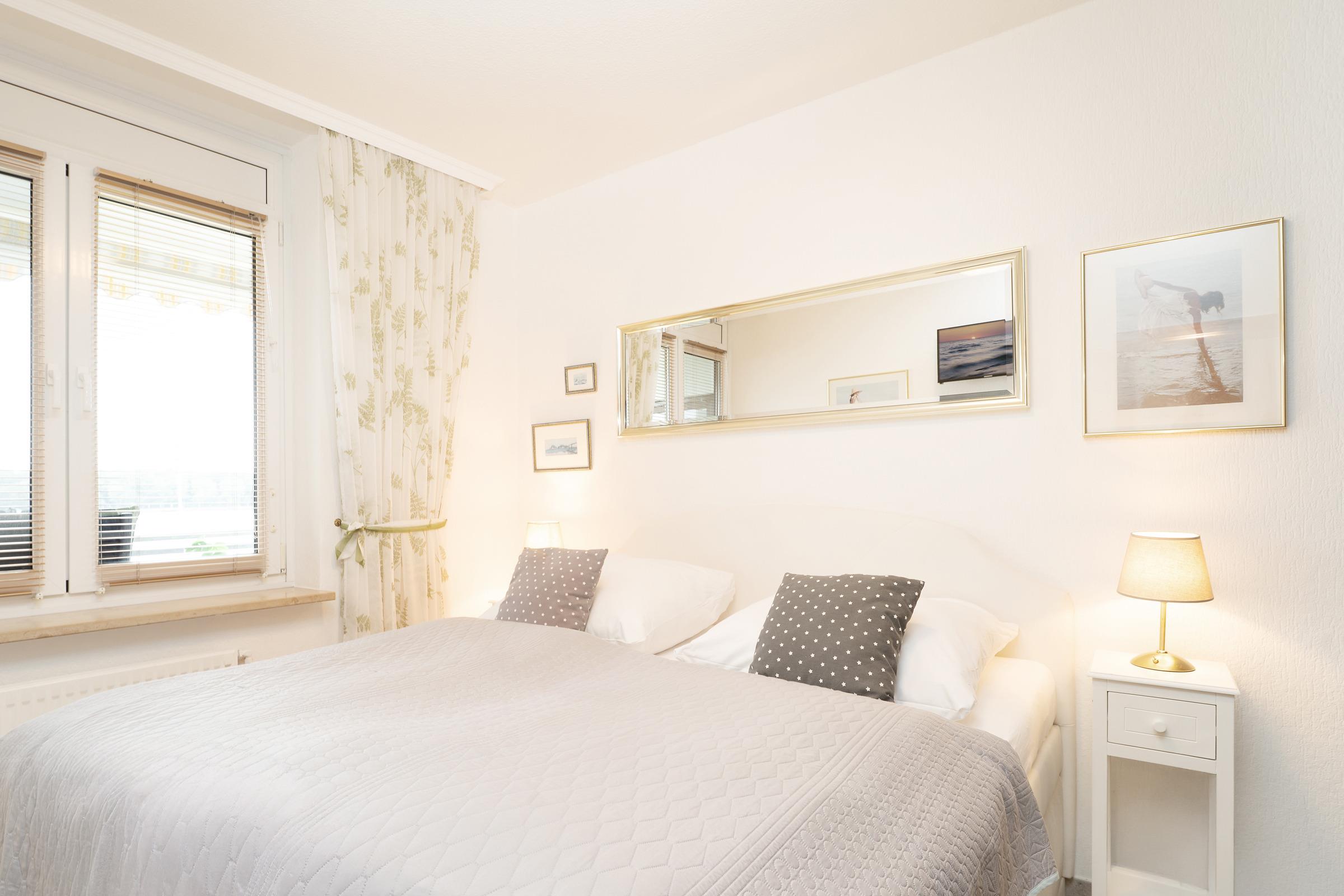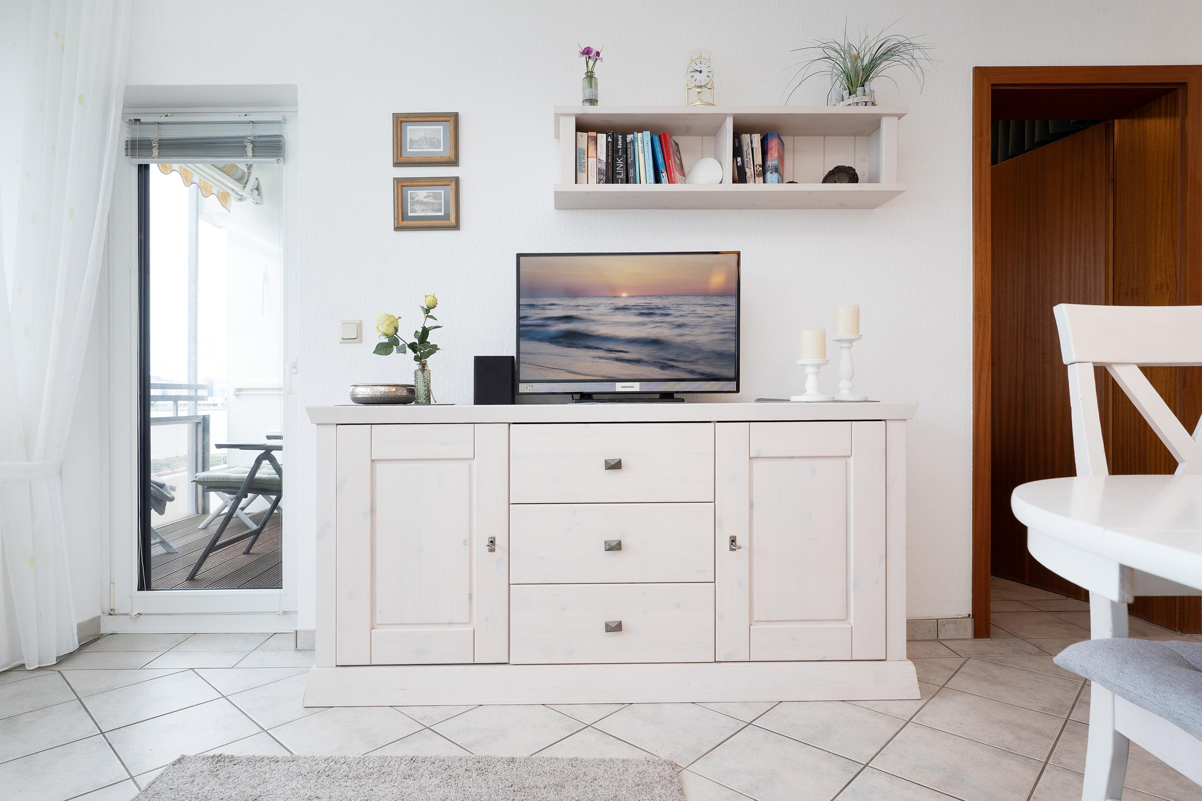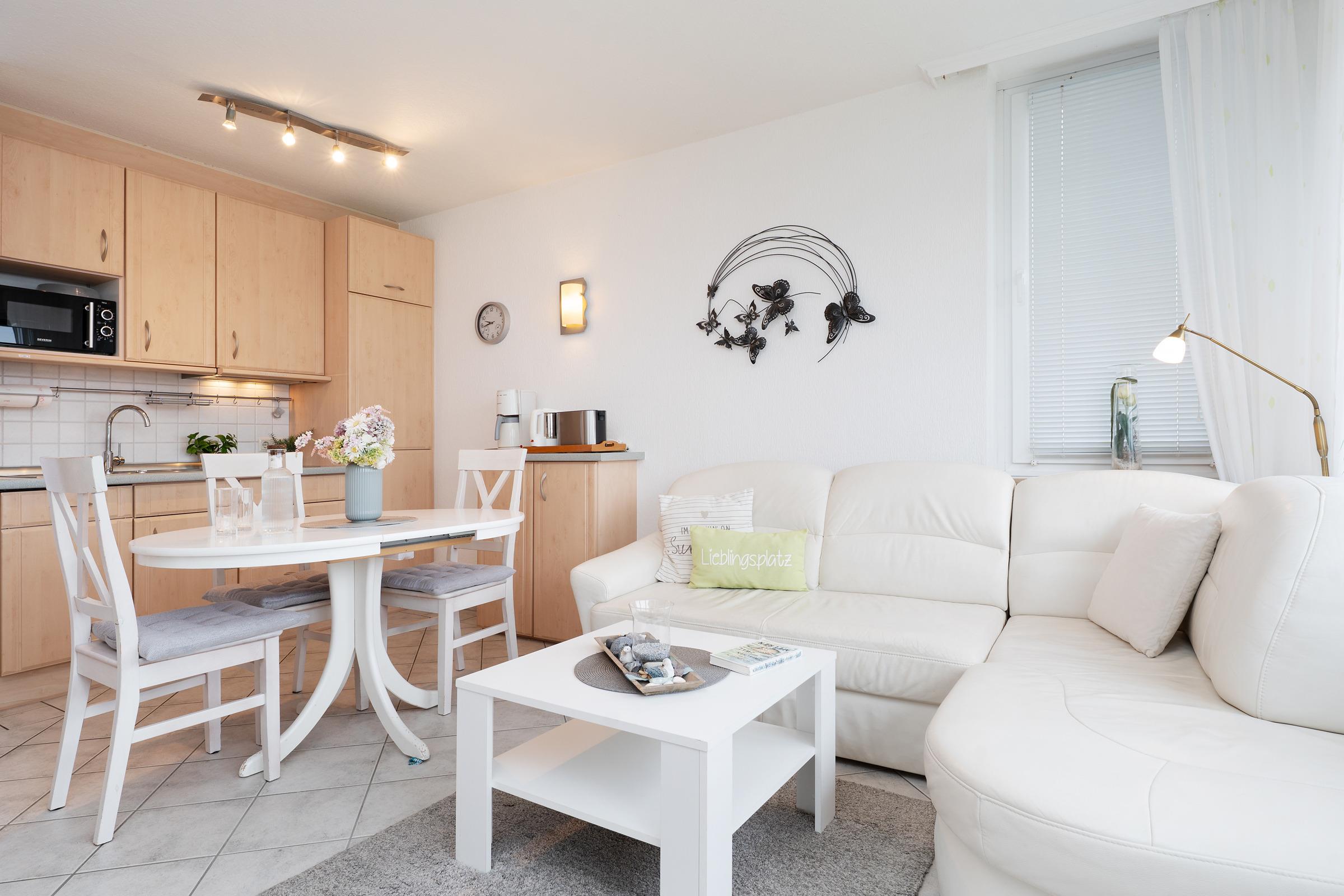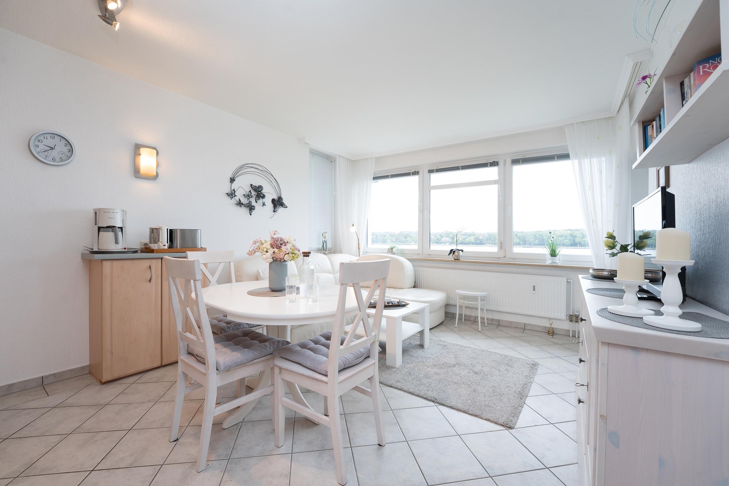 Diese charmante Ferienwohnung begrüßt Sie mit einem hellen Wohnbereich, in dem ein gemütliches Sofa und ein TV für entspannte Abende sorgen. Von hier aus gelangen Sie direkt auf den Balkon, der Ihnen einen reizvollen Ausblick auf das Binnenwasser bietet – ideal für eine Kaffeepause oder den Sundowner. Die integrierte Küchenzeile ist voll ausgestattet mit Ceran-Kochfeld, Backofen, Kühlschrank, Mikrowelle, Spülmaschine, Kaffeemaschine und Wasserkocher. Der angrenzende Essbereich bietet Platz für gemeinsame Mahlzeiten. Im Schlafzimmer mit Doppelbett steht Ihnen ein weiterer TV zur Verfügung. Ein zweites, kleineres Zimmer ist mit einem weiteren Schlafplatz ausgestattet. Das moderne Badezimmer verfügt über eine Dusche mit Wanne und ein separates WC.