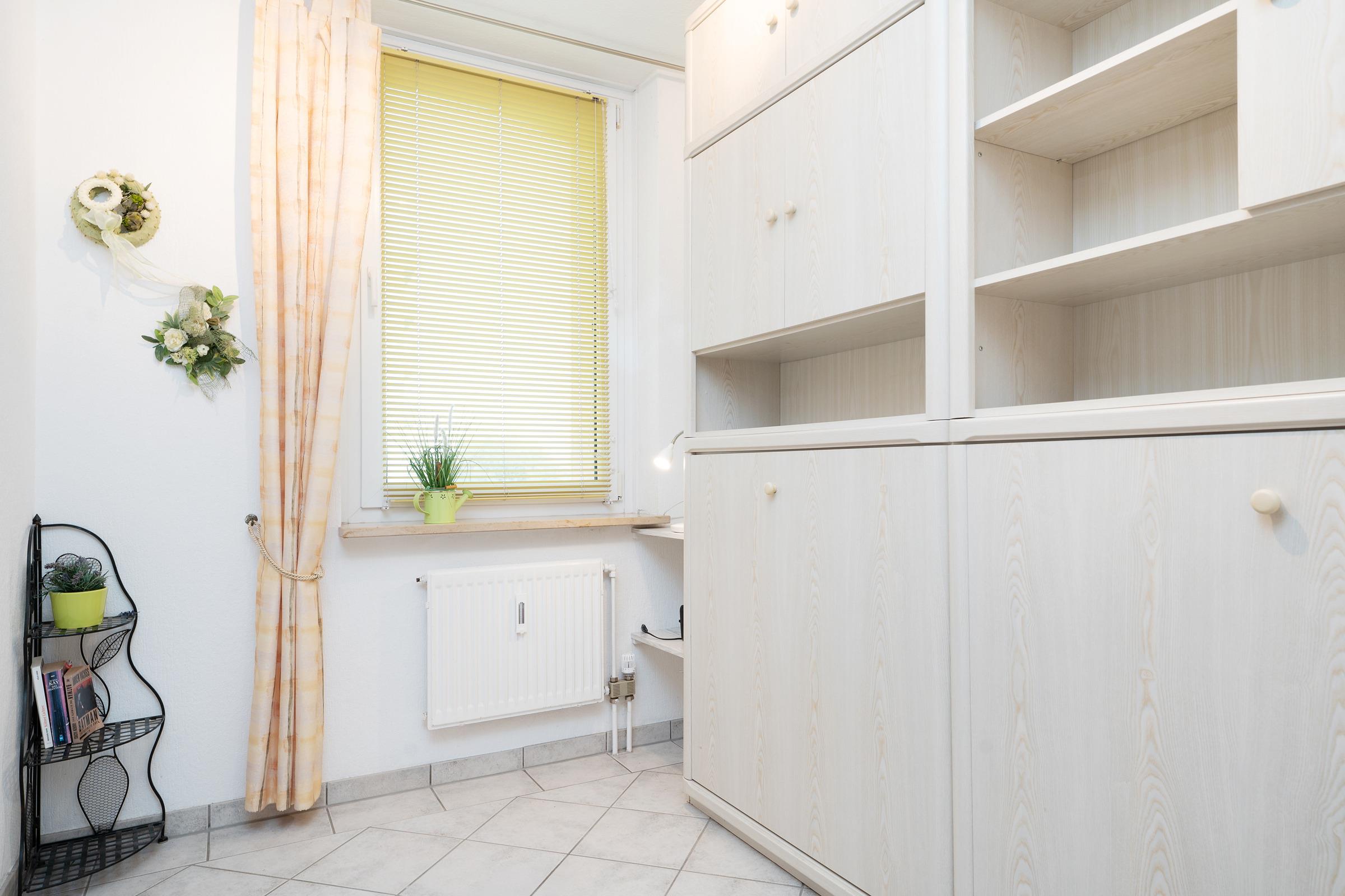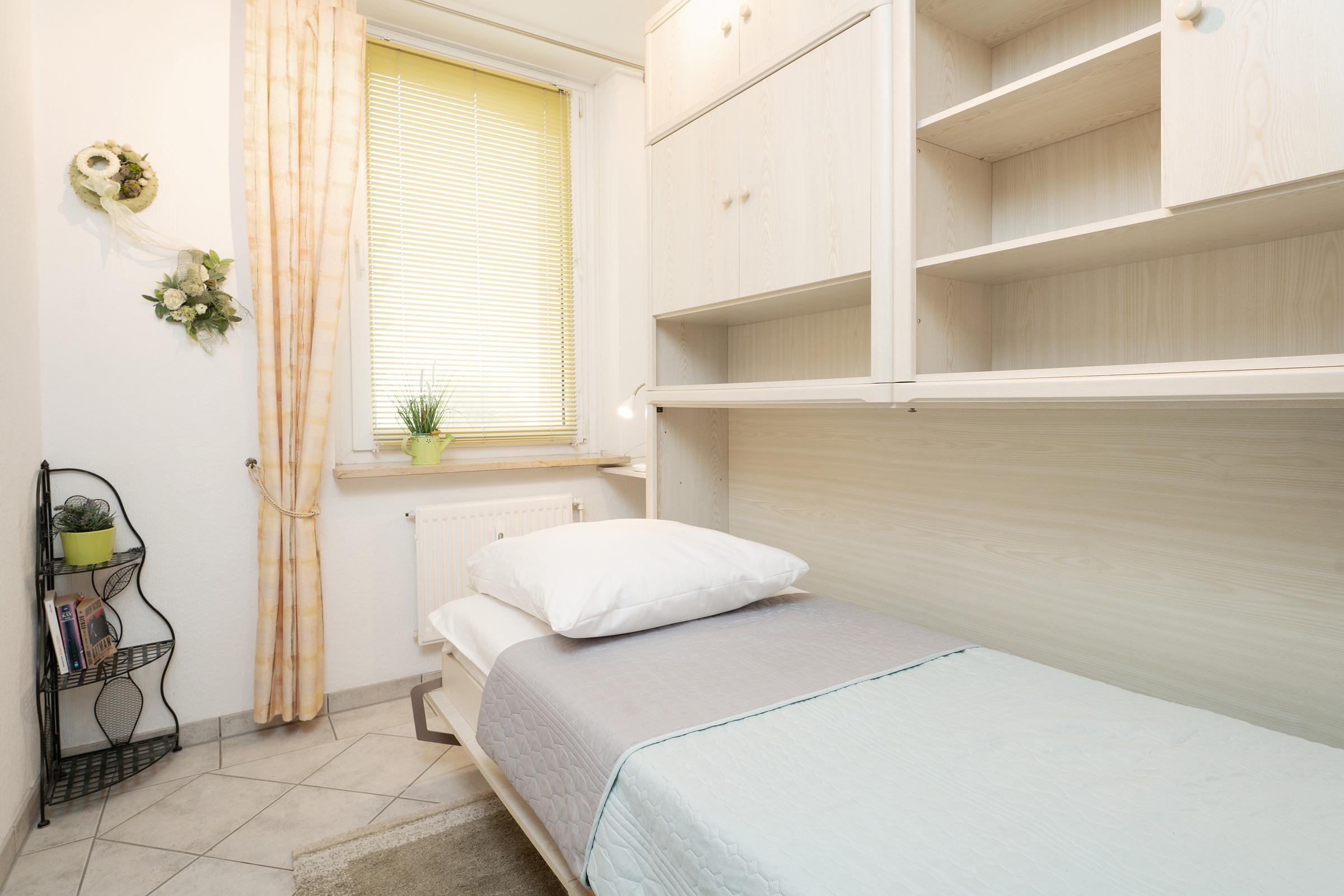 Schlafzimmer 2: 1 Schrankbett (90x200 cm), Kleiderschrank, Verdunkelung: Jalousie, Platz für ein Babybett vorhanden