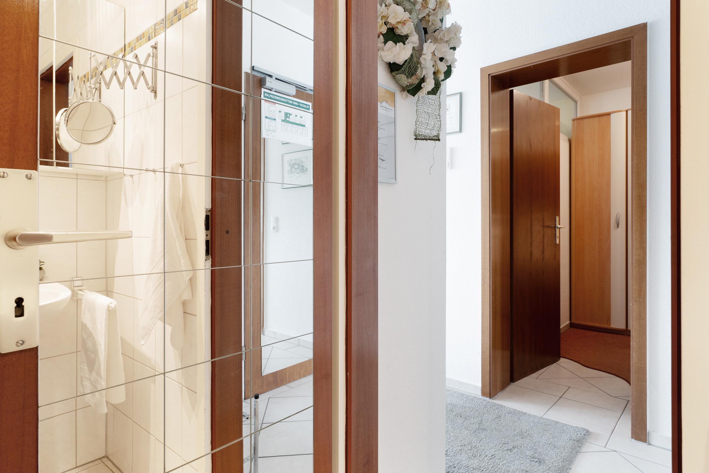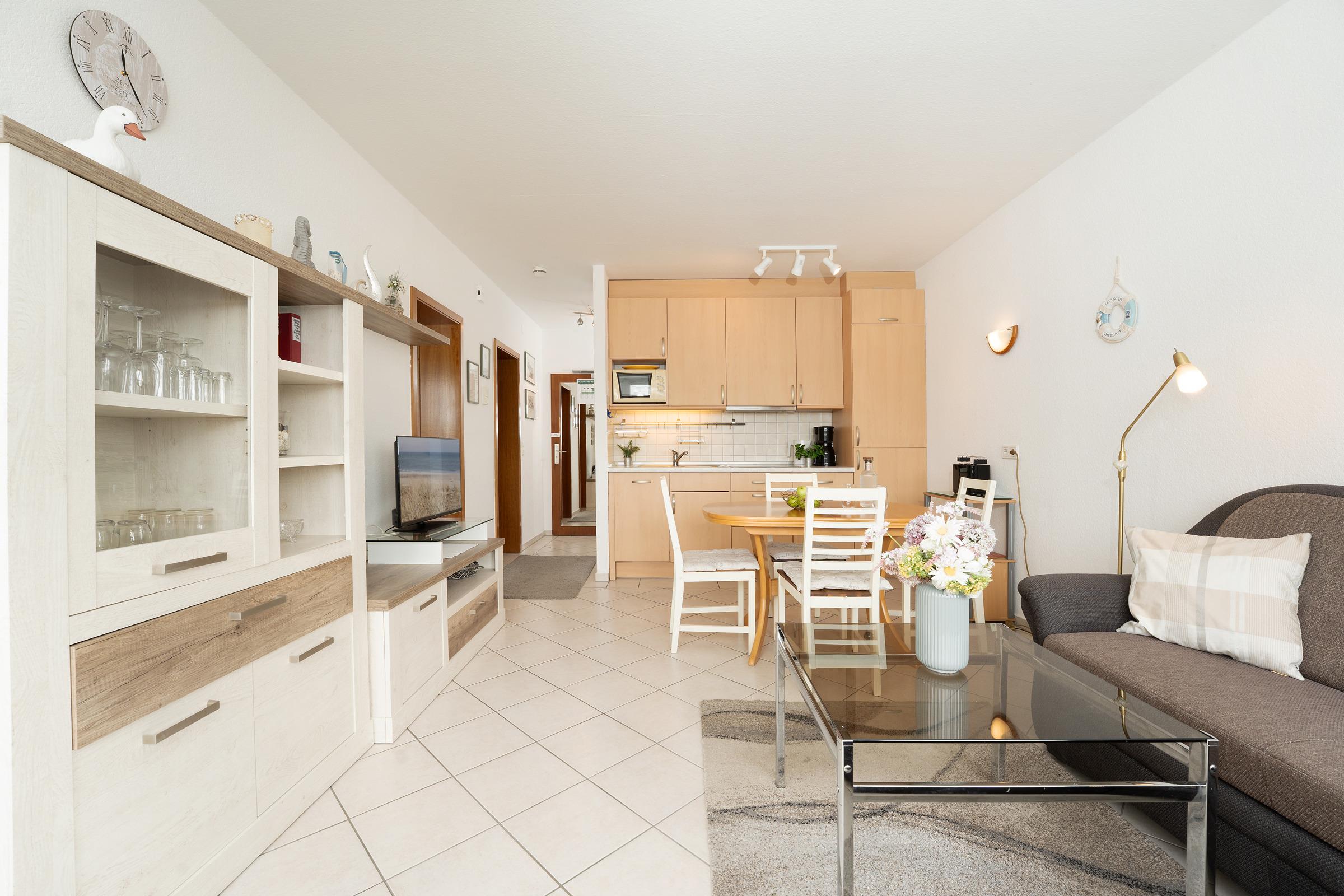 Freuen Sie sich auf einen hellen Wohnbereich mit bequemer Sofaecke, Fernseher und Radio – perfekt für entspannte Stunden. Direkt vom Wohnraum betreten Sie den sonnigen Südbalkon mit Outdoormöbeln ausgestattet, der zum Essen im Freien einlädt. Die voll ausgestattete Küchenzeile verfügt über ein 4-Platten-Cerankochfeld, Backofen, Mikrowelle, Kühlschrank mit Gefrierfach, Geschirrspüler, Kaffeemaschine, Wasserkocher und Toaster. Im angrenzenden Essbereich finden alle Gäste bequem Platz. Das Hauptschlafzimmer bietet ein Doppelbett und einen weiteren Fernseher, im zweiten Schlafzimmer sorgt ein Etagenbett für kindgerechte Schlafplätze. Das Bad verfügt über Dusche mit flachem Einstieg (33 cm) und WC.