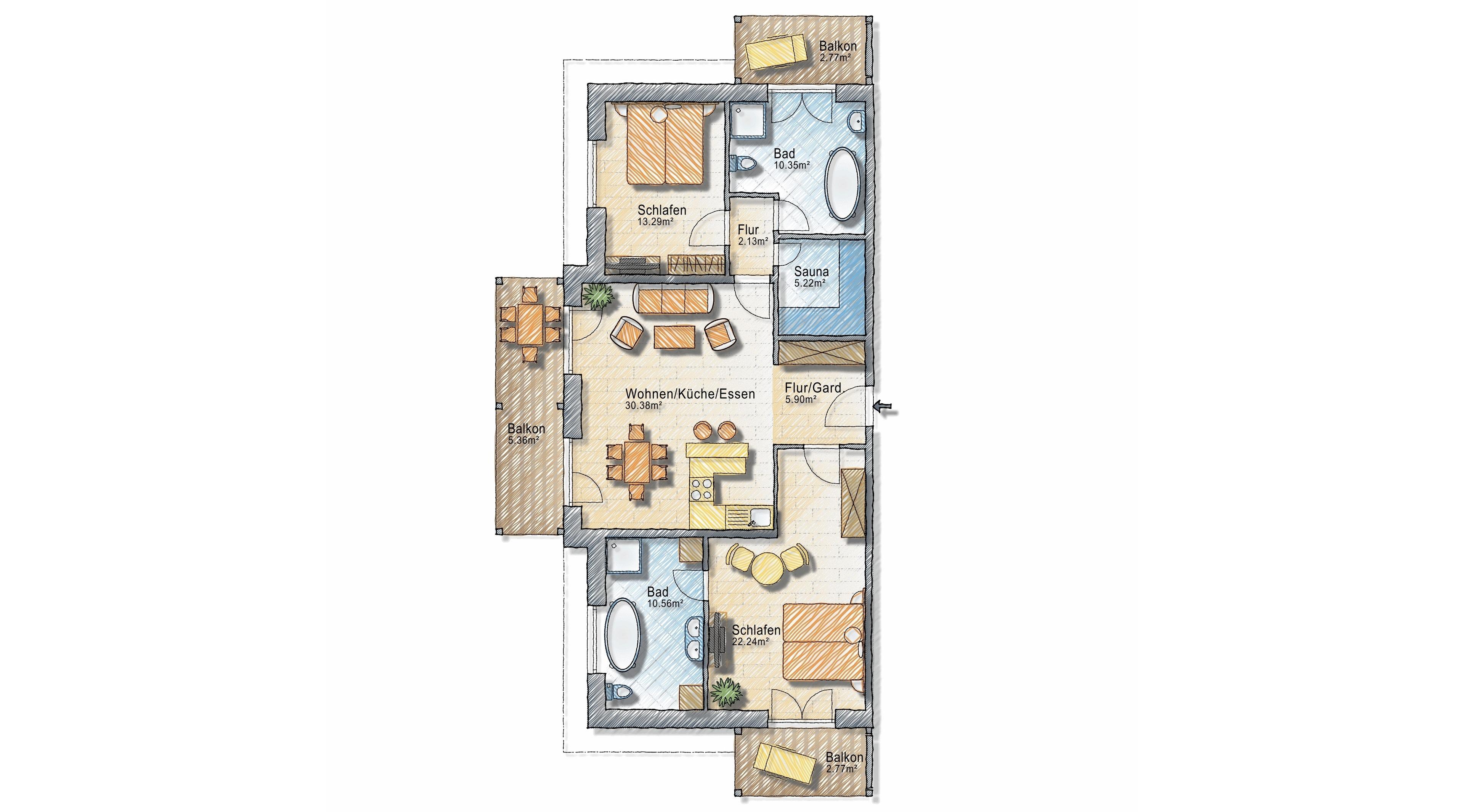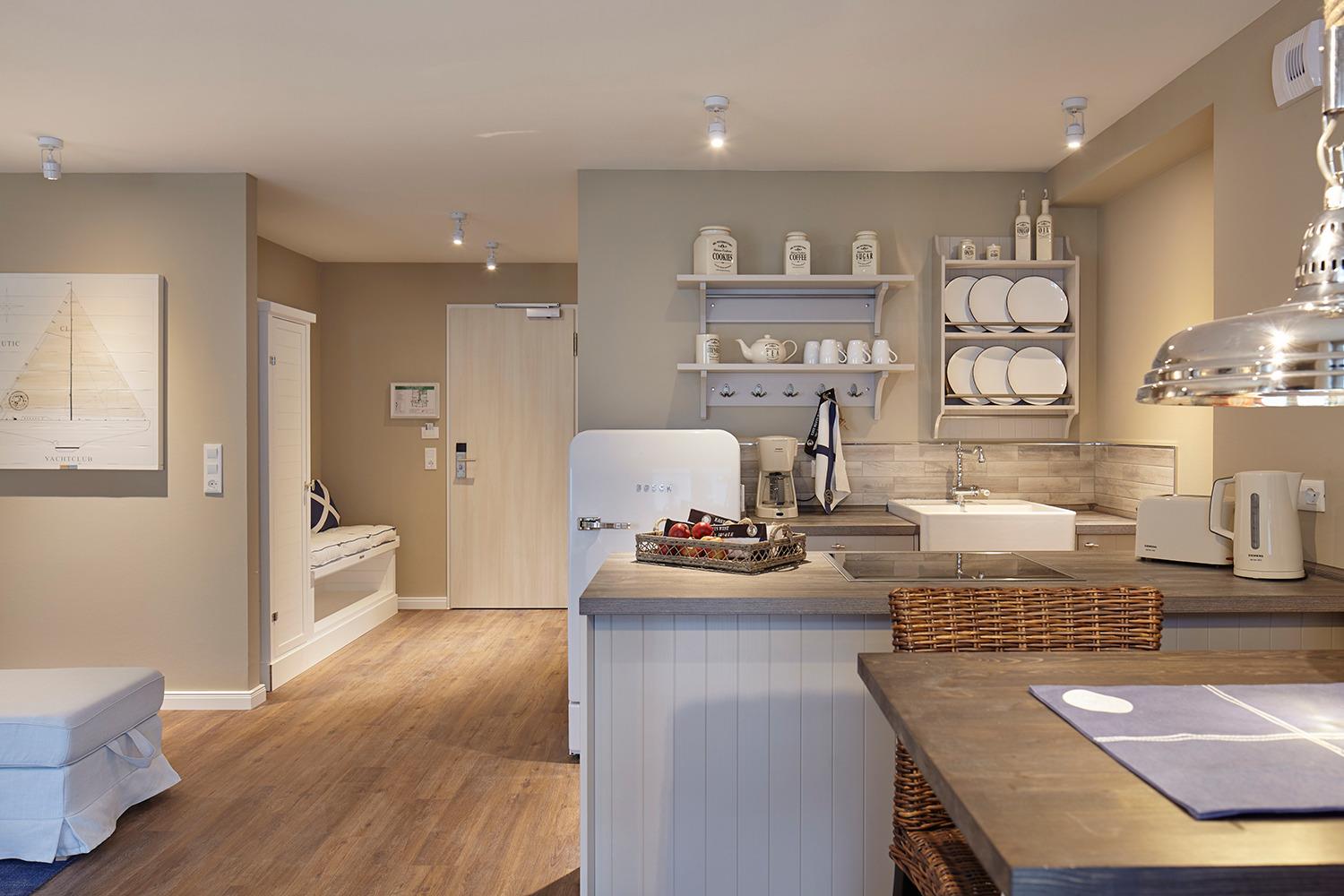 May we present: Unsere "Ocean House" Apartments mit Sauna. Auf 98 qm hat unser Kooperationspartner „Ocean House“ seiner Kreativität freien Lauf gelassen und sowohl die offene Wohnküche als auch die beiden Schlafzimmer mit je einem Vollbad zu etwas ganz Besonderem gemacht.