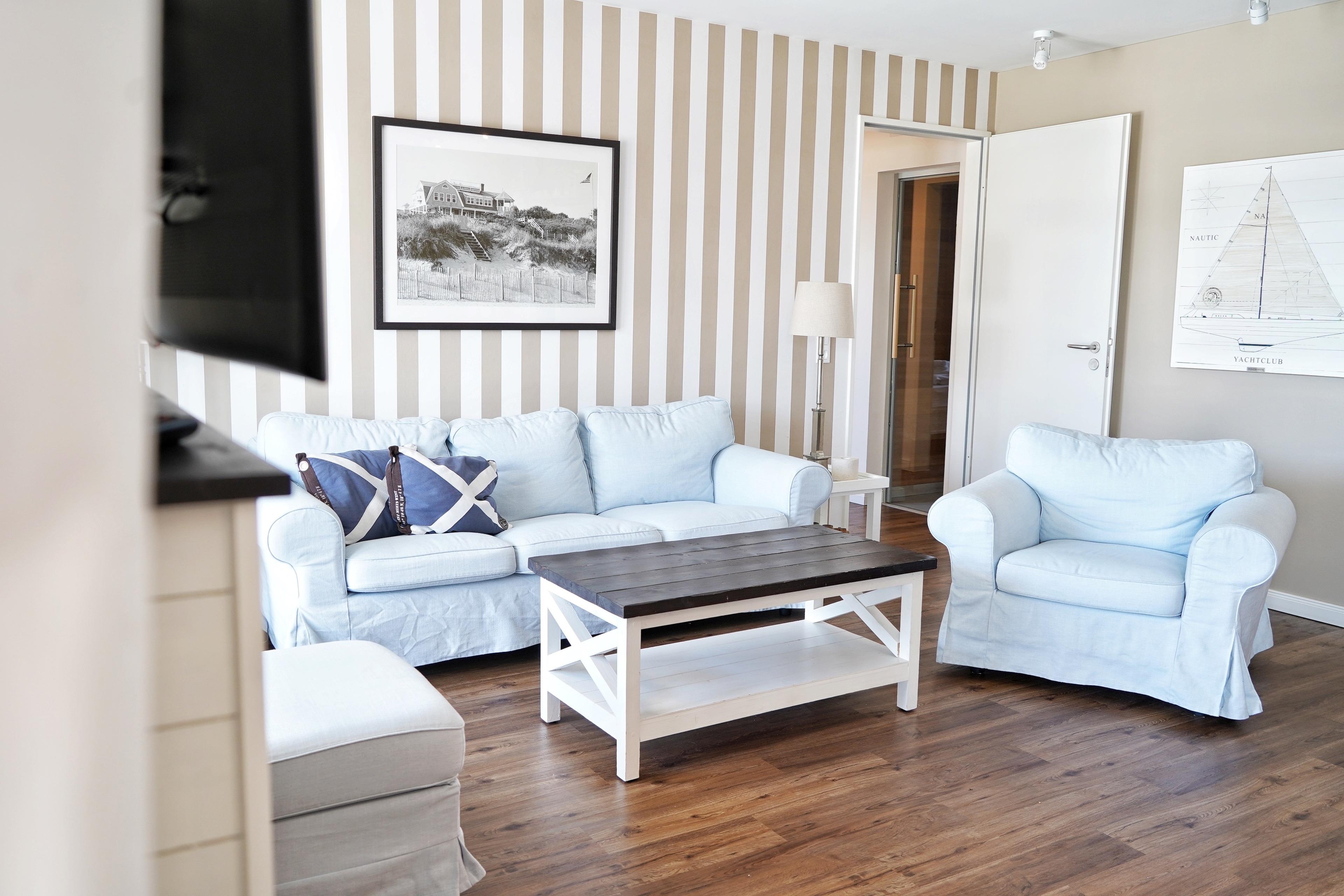 Das maritime Feeling bekommt ihr also nicht nur beim Blick von einem der drei Balkone, sondern auch im gesamten Apartment. Ob beim gemütlichen Essen am Tisch oder Relaxen auf der Couch vor einem der drei Flat-TVs.