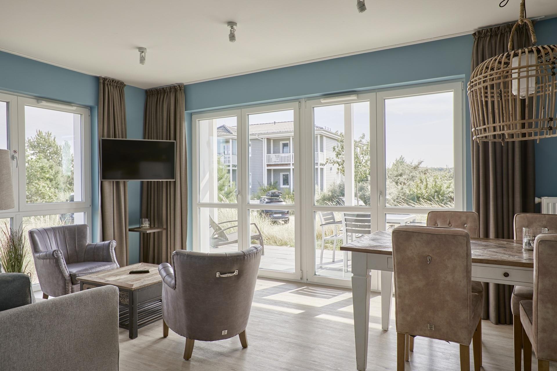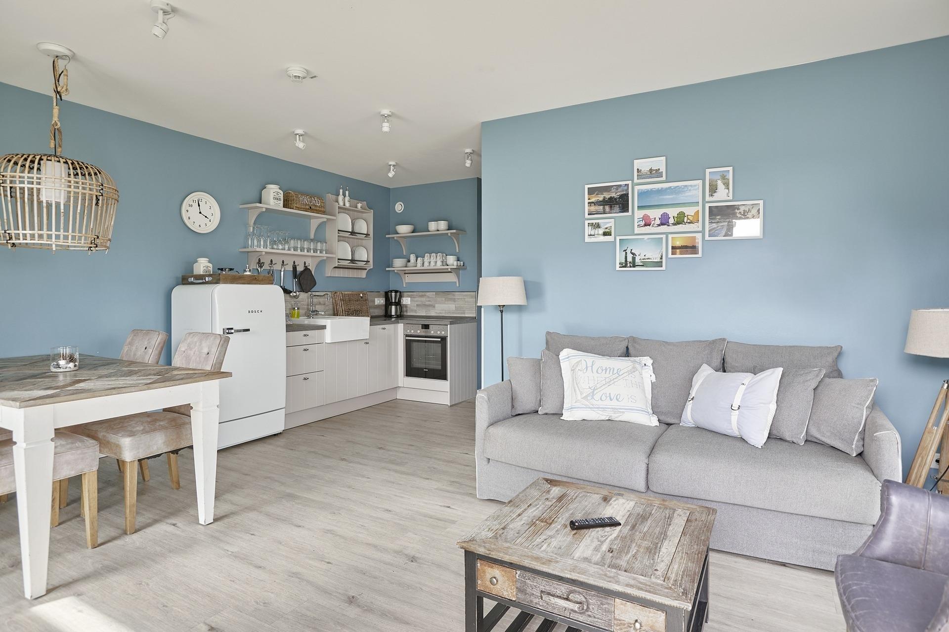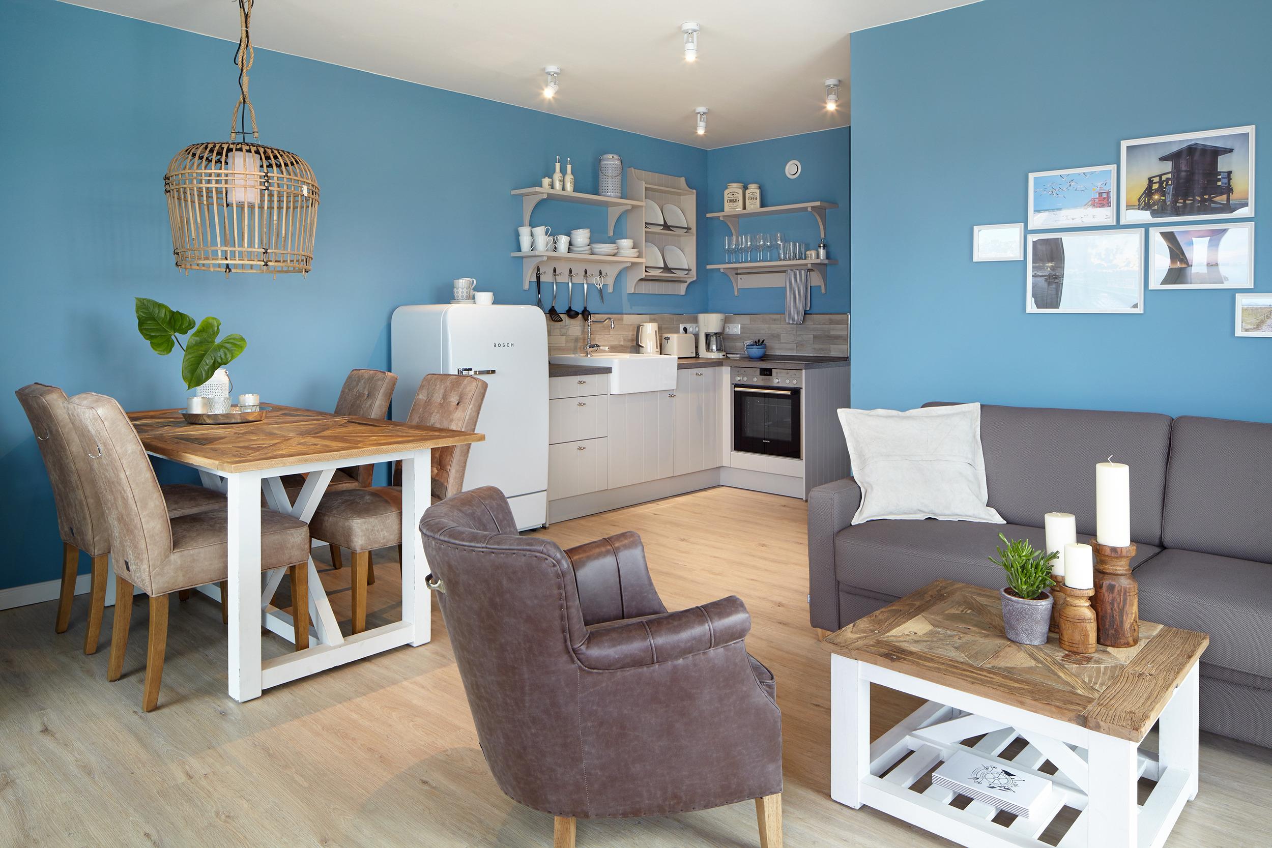 Auf 72 qm bleiben keine Wünsche offen: die großzügige Wohnküche mit Esstisch für vier Personen bietet Raum, um gemeinsam unvergessliche Urlaubsmomente zu schaffen – ob beim gemeinsamen Frühstück oder Dinner oder lieber gemütlich auf der Couch.